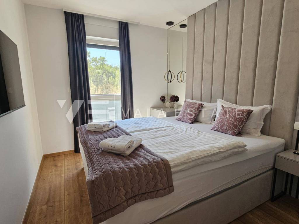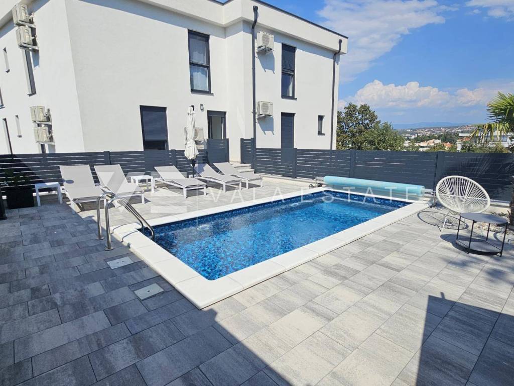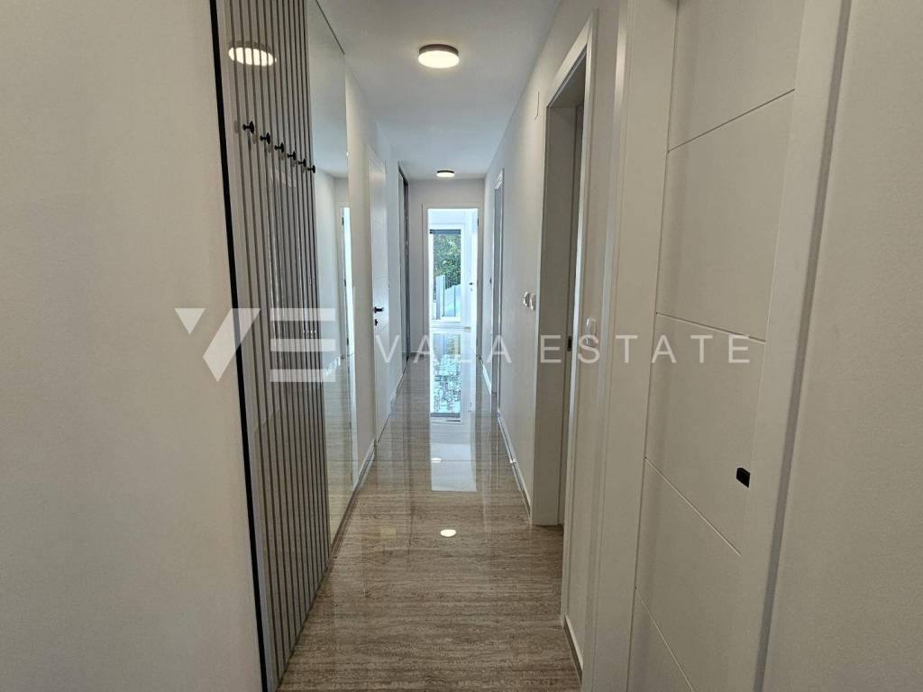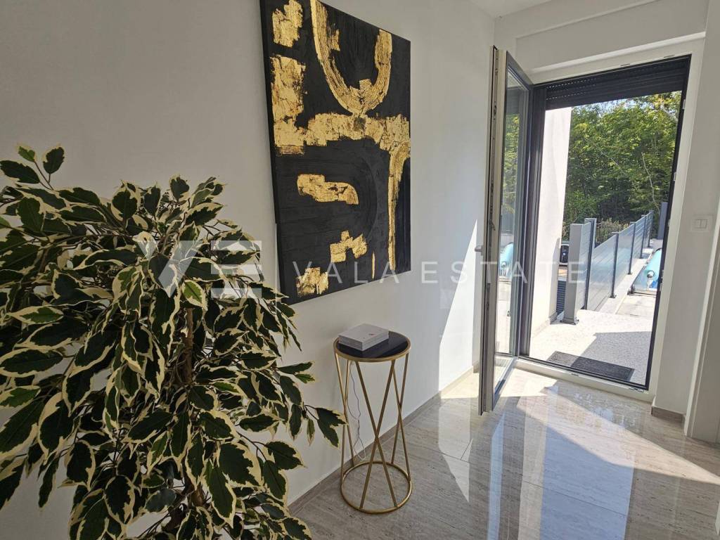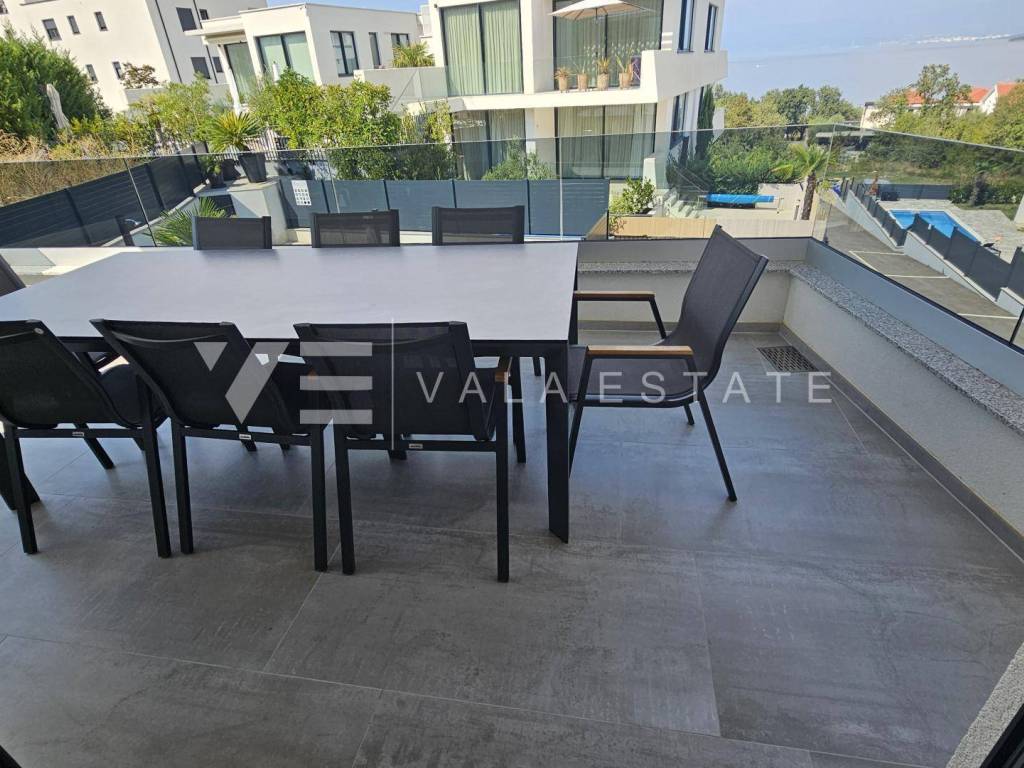 Real estate Island Krk, Malinska - for sale is a luxurious apartment located on the first floor of a new building with a garden and swimming pool. The apartment has a living area of 88 m2 and consists of an entrance hall, three bedrooms with attached bathrooms, a toilet and a space that includes a kitchen, dining room and living room with access to a covered terrace with a beautiful view of the sea. One of the bedrooms opens onto its own beautifully landscaped garden of 66 m2, where there is a heated pool of 12 m2, a sun deck and a summer kitchen. It has one parking space in the common courtyard of the building. Superior construction and equipment, PVC carpentry, electric blinds with mosquito nets, underfloor electric heating, first-class floor coverings, air-conditioned heating/cooling system and new high-quality custom-made furniture are just some of the features of this modern new building, and what makes it particularly attractive. is an exceptional location only 300 m from the beautiful beach.