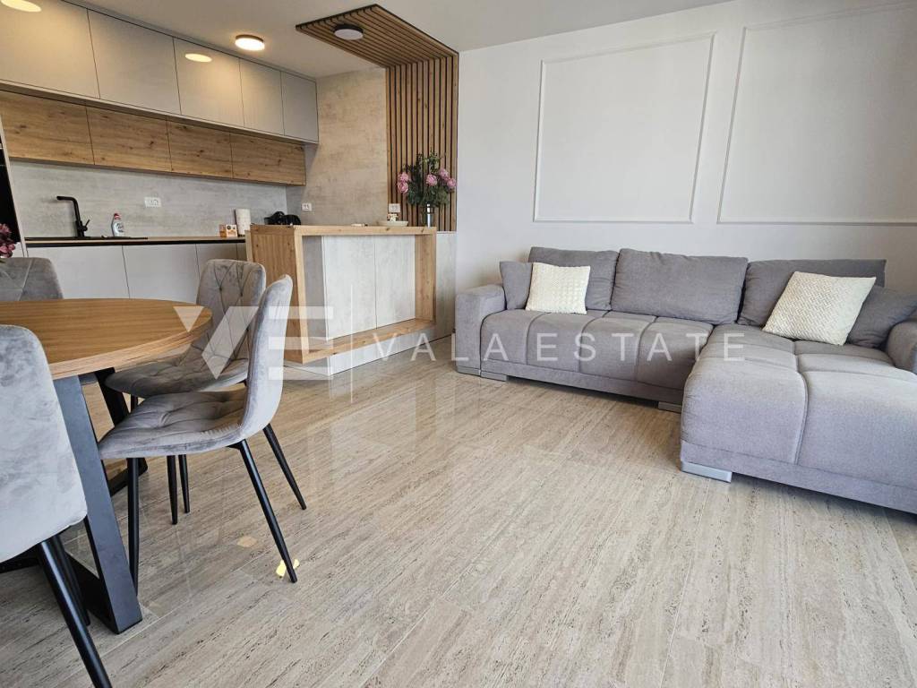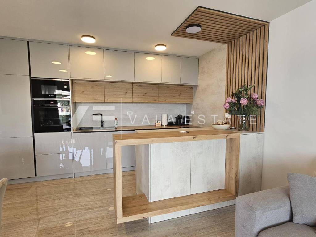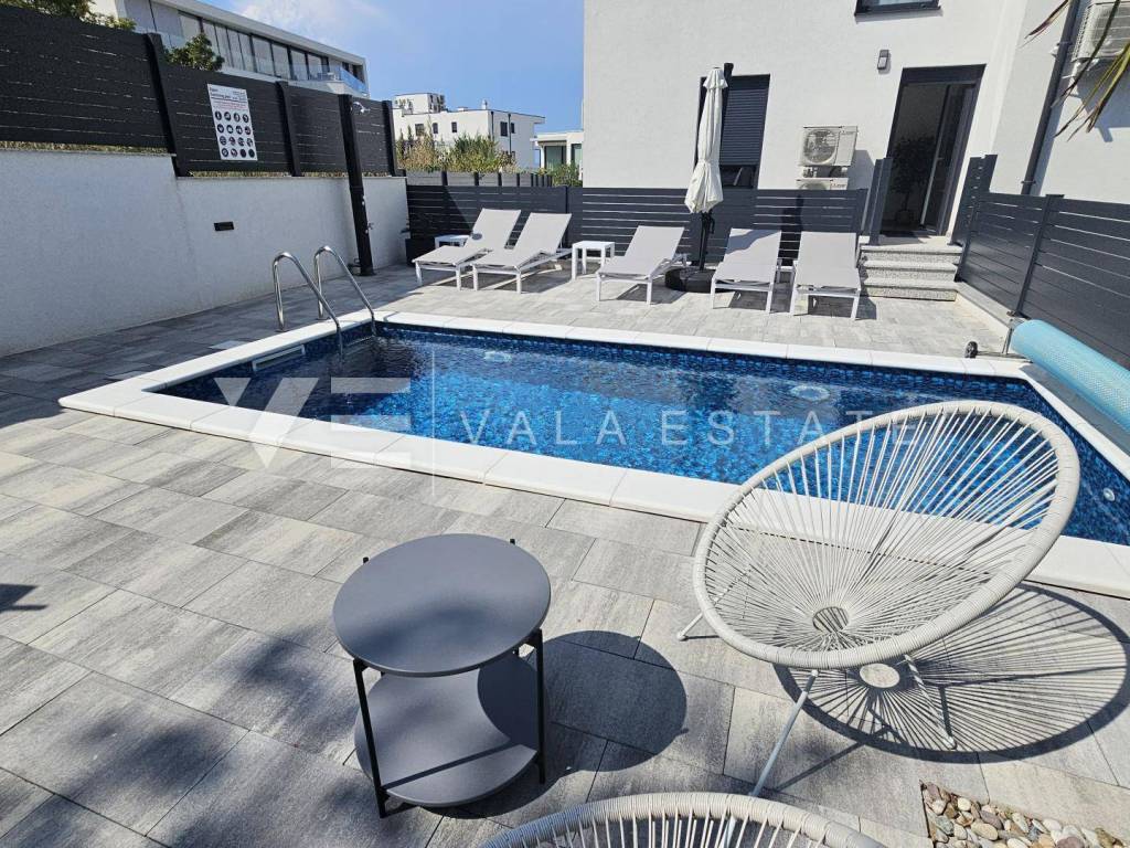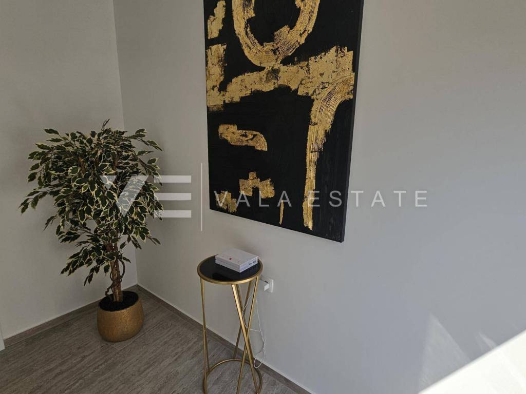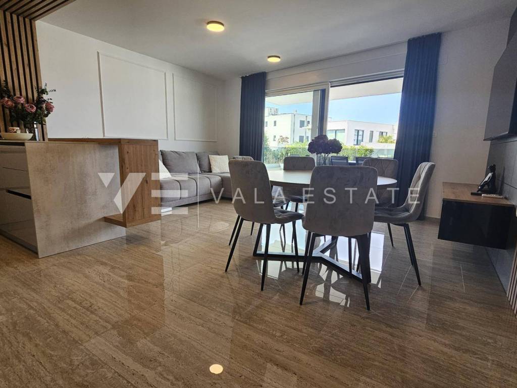 Real estate Island Krk, Malinska - for sale is a luxurious apartment located on the first floor of a new building with a garden and swimming pool. The apartment has a living area of 88 m2 and consists of an entrance hall, three bedrooms with attached bathrooms, a toilet and a space that includes a kitchen, dining room and living room with access to a covered terrace with a beautiful view of the sea. One of the bedrooms opens onto its own beautifully landscaped garden of 66 m2, where there is a heated pool of 12 m2, a sun deck and a summer kitchen. It has one parking space in the common courtyard of the building. Superior construction and equipment, PVC carpentry, electric blinds with mosquito nets, underfloor electric heating, first-class floor coverings, air-conditioned heating/cooling system and new high-quality custom-made furniture are just some of the features of this modern new building, and what makes it particularly attractive. is an exceptional location only 300 m from the beautiful beach.