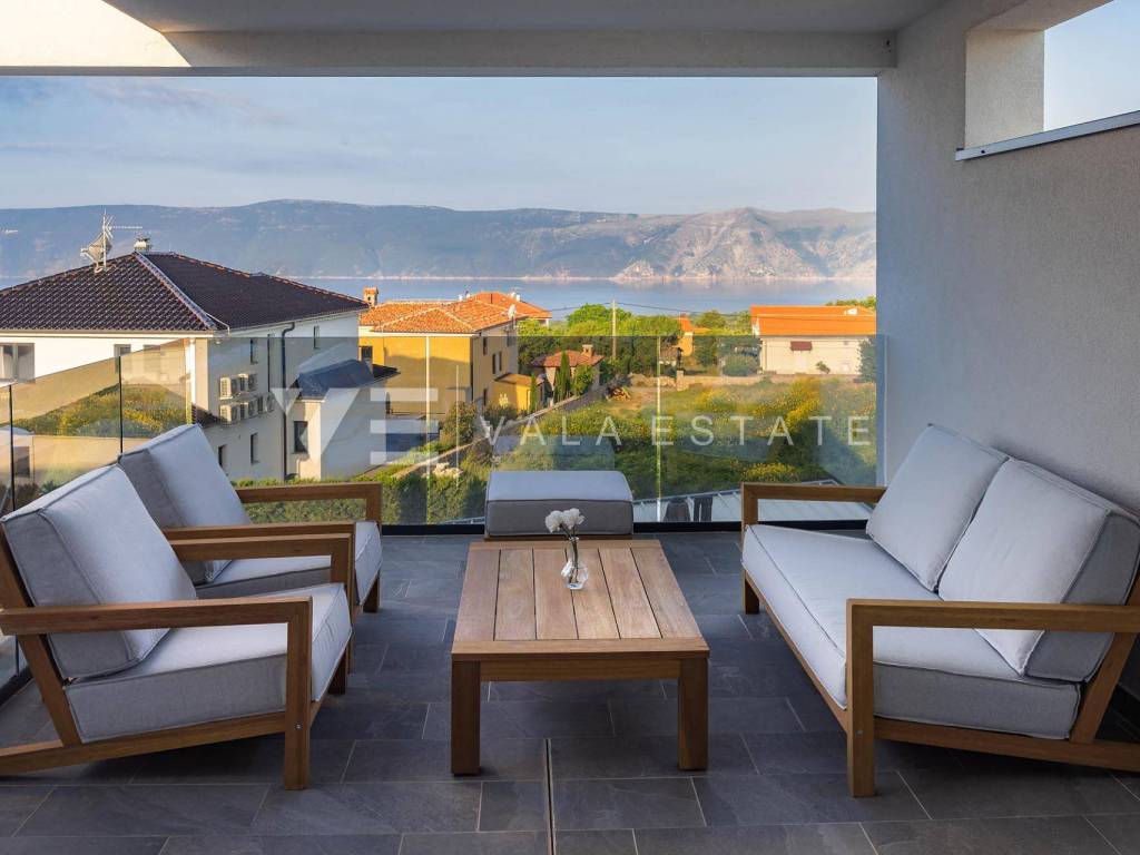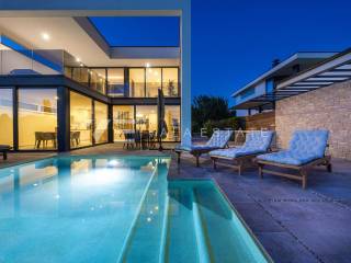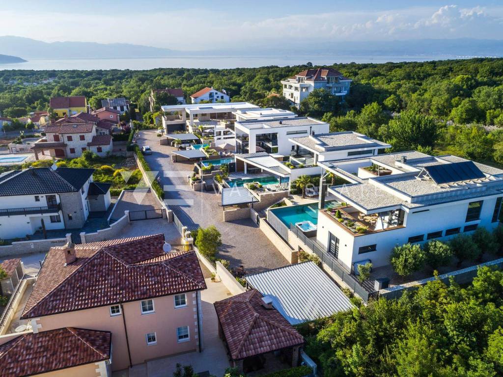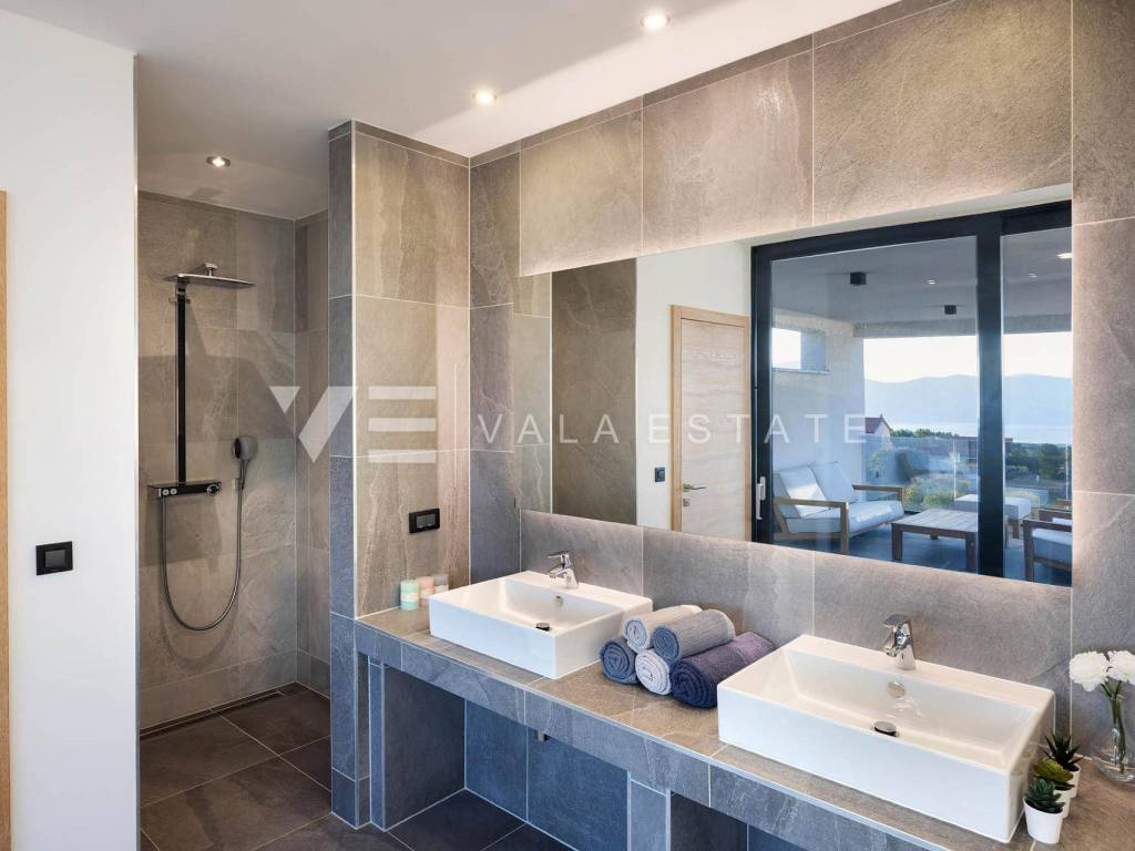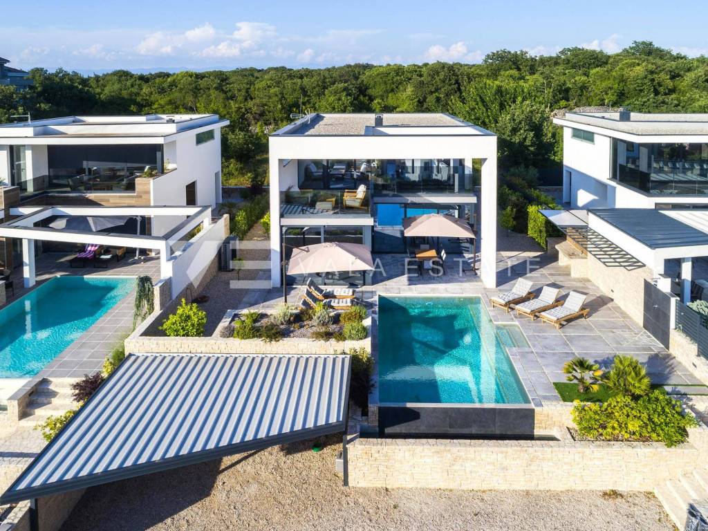 Real estate island of Krk, city of Krk and surroundings - for sale is a modern detached villa in a quiet location with a panoramic view of the sea. It is located in a private street with a total of five luxury villas connected by design and equipment. The street is bordered by a landscaped wall and greenery and it is possible to access only authorized persons by remote automatic opening of the fence. The villa is located in an elevated position in a quiet place on the western side of the island of Krk, on a plot of 535 m2. It occupies a total living area of 240 m2 and is distributed over the ground floor and first floor. The main entrance is located on the high ground floor, from which you enter a spacious open space that combines the living room, kitchen and dining room with access to the terrace and garden with a 30 m2 swimming pool with an infinity effect surrounded by a sun deck paved with large modern tiles. There are two more bedrooms, each with its own bathroom and private terraces with a view of the beautiful nature that surrounds the property and provides complete privacy, as well as a storage room and a toilet. On the first floor, which is connected by an internal staircase, there is a master bedroom with its own bathroom, wardrobe, living room and private balcony with a beautiful view of the sea, the island of Cres and untouched nature. A special atmosphere is created by the materials used in the construction and furnishing of this modern villa, such as reinforced concrete construction, tempered three-layer glass 2.60 m high with a reflective effect, aluminum window frames, security doors, underfloor heating throughout the villa, double heating system /cooling, heat pump for heating, separate cooling system (Daikin - Mitsubishi), hydro and thermal insulation, styrofoam on the floors, 8 cm thick styrofoam on the facade, video surveillance, alarm system and many other special features. This villa with its beauty and design is perfect for owners who like to enjoy peace and quiet in a luxurious way.