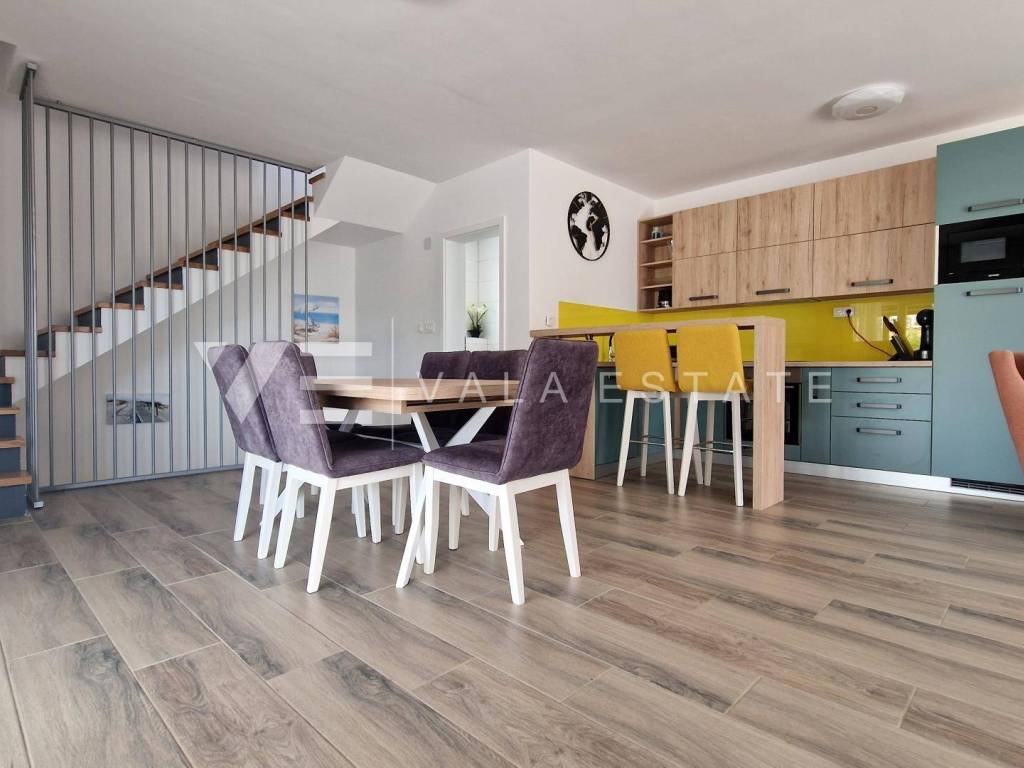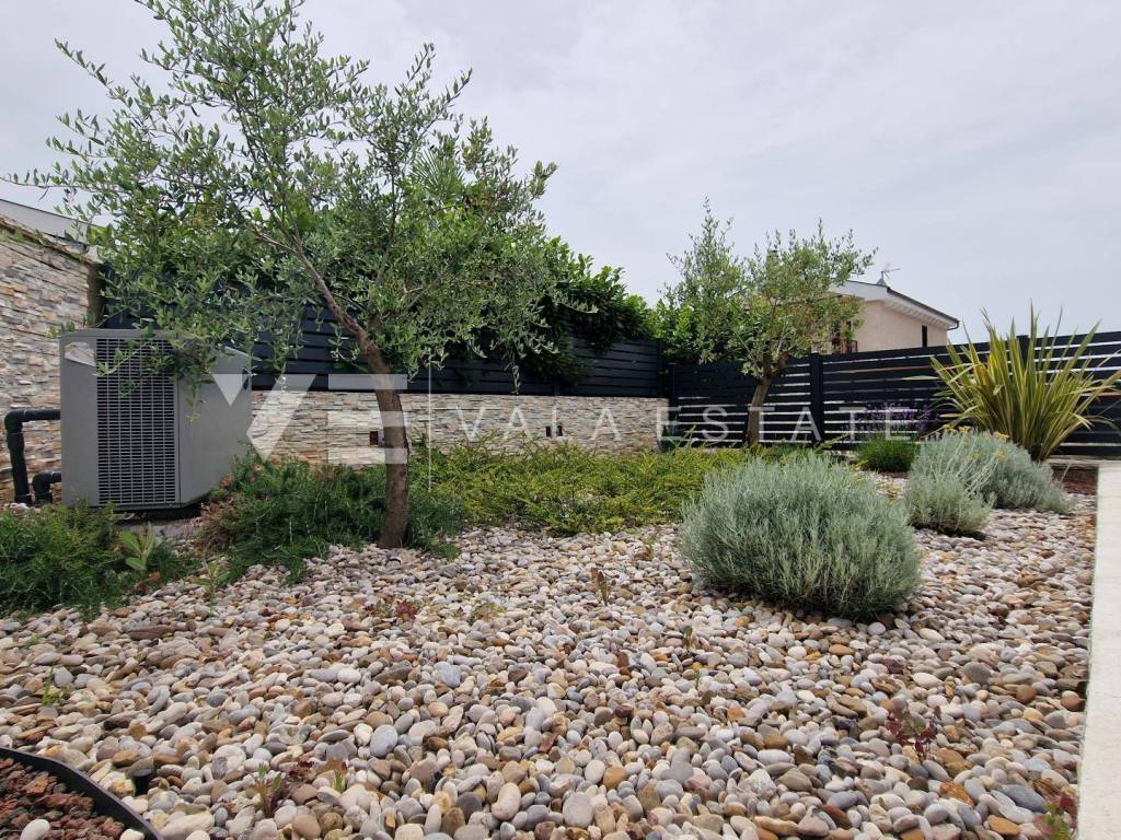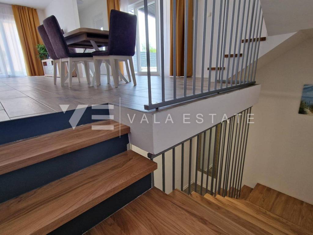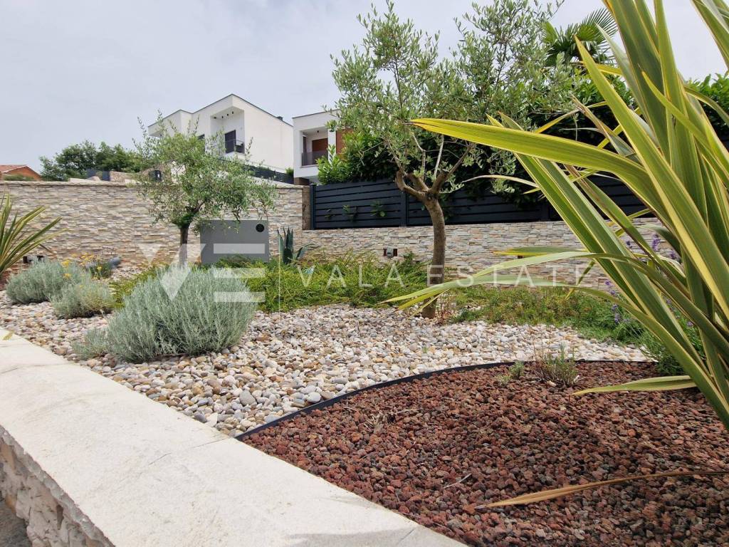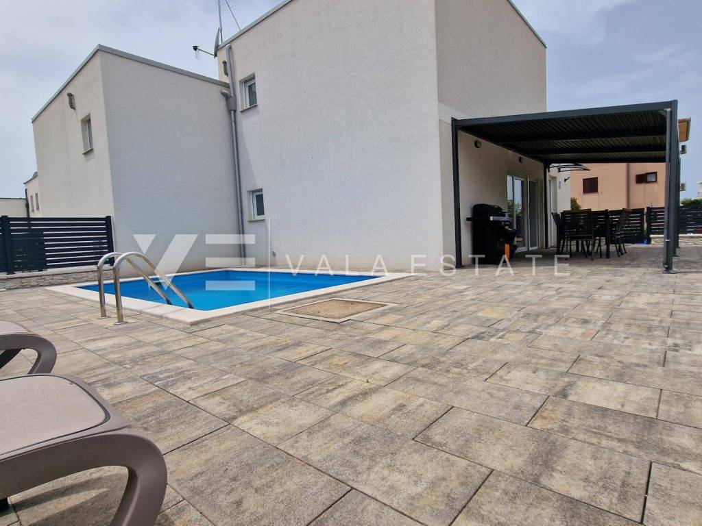 Real estate island Krk, Malinska - modern semi-detached house for sale with a beautifully landscaped garden of 250 m2, where there is a heated swimming pool with a sun deck, a terrace and one parking space. The house extends over three floors with a total living area of 122.64 m2. In the basement there are two bedrooms, a bathroom and an entrance hall. On the ground floor there is an entrance area, a toilet, a kitchen with a dining area and a large living room with access to the terrace and garden. On the floor, which is connected by an internal staircase, there is a bathroom and a large bedroom with access to the terrace. Quality construction and equipment, modern design, multisplit air conditioning, security doors and PVC joinery are just some of the excellent features of this property. It is located in a quiet location only 700 m from the sea and the town center with all facilities. This property is ideal for a real summer vacation, but it is also a good investment opportunity for tourist rental purposes.