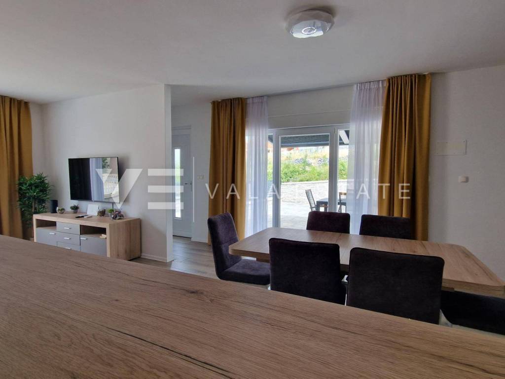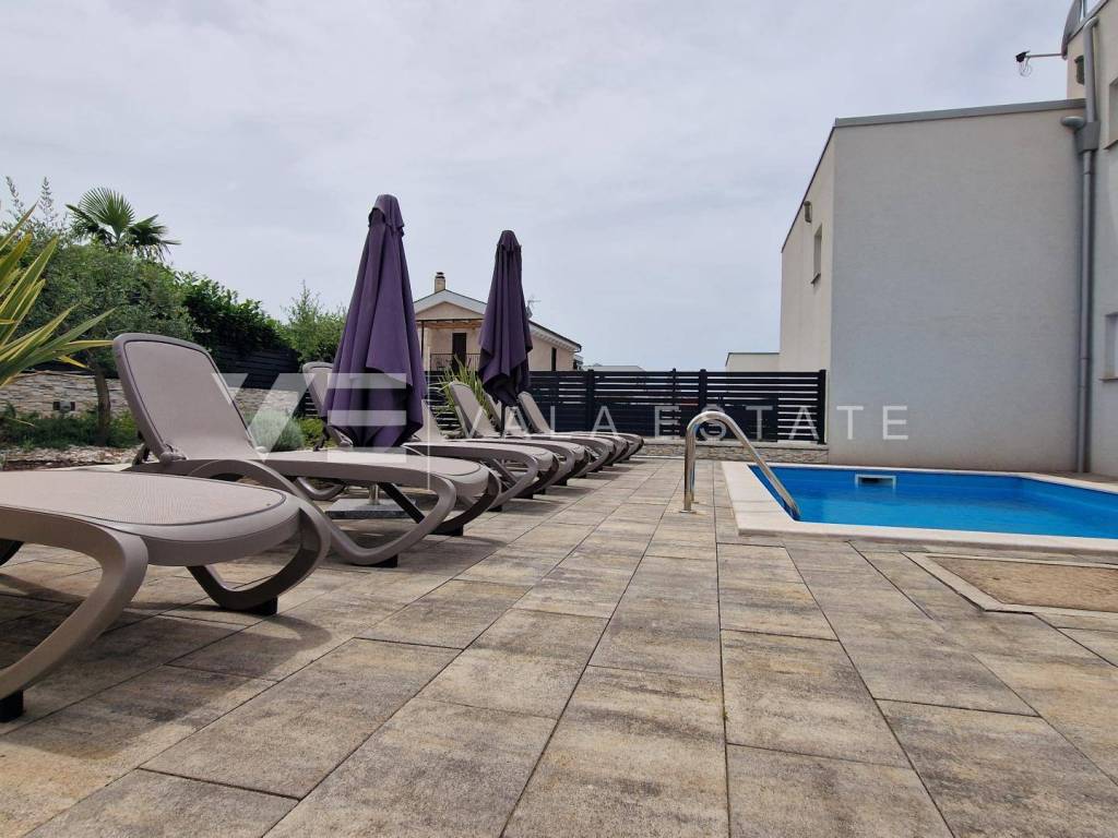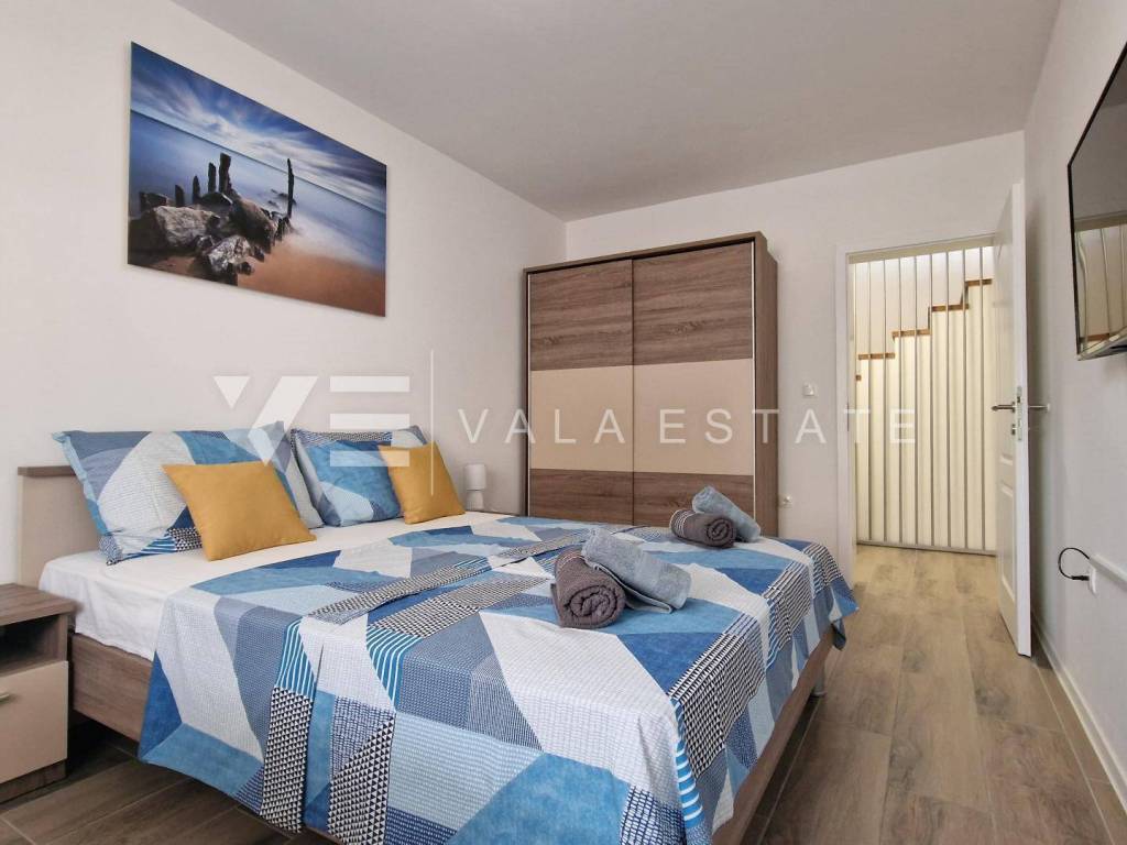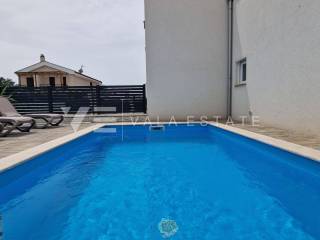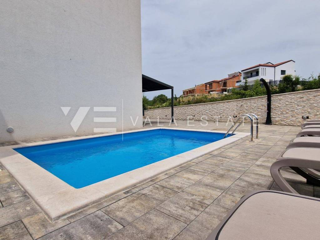 Real estate island Krk, Malinska - modern semi-detached house for sale with a beautifully landscaped garden of 250 m2, where there is a heated swimming pool with a sun deck, a terrace and one parking space. The house extends over three floors with a total living area of 122.64 m2. In the basement there are two bedrooms, a bathroom and an entrance hall. On the ground floor there is an entrance area, a toilet, a kitchen with a dining area and a large living room with access to the terrace and garden. On the floor, which is connected by an internal staircase, there is a bathroom and a large bedroom with access to the terrace. Quality construction and equipment, modern design, multisplit air conditioning, security doors and PVC joinery are just some of the excellent features of this property. It is located in a quiet location only 700 m from the sea and the town center with all facilities. This property is ideal for a real summer vacation, but it is also a good investment opportunity for tourist rental purposes.