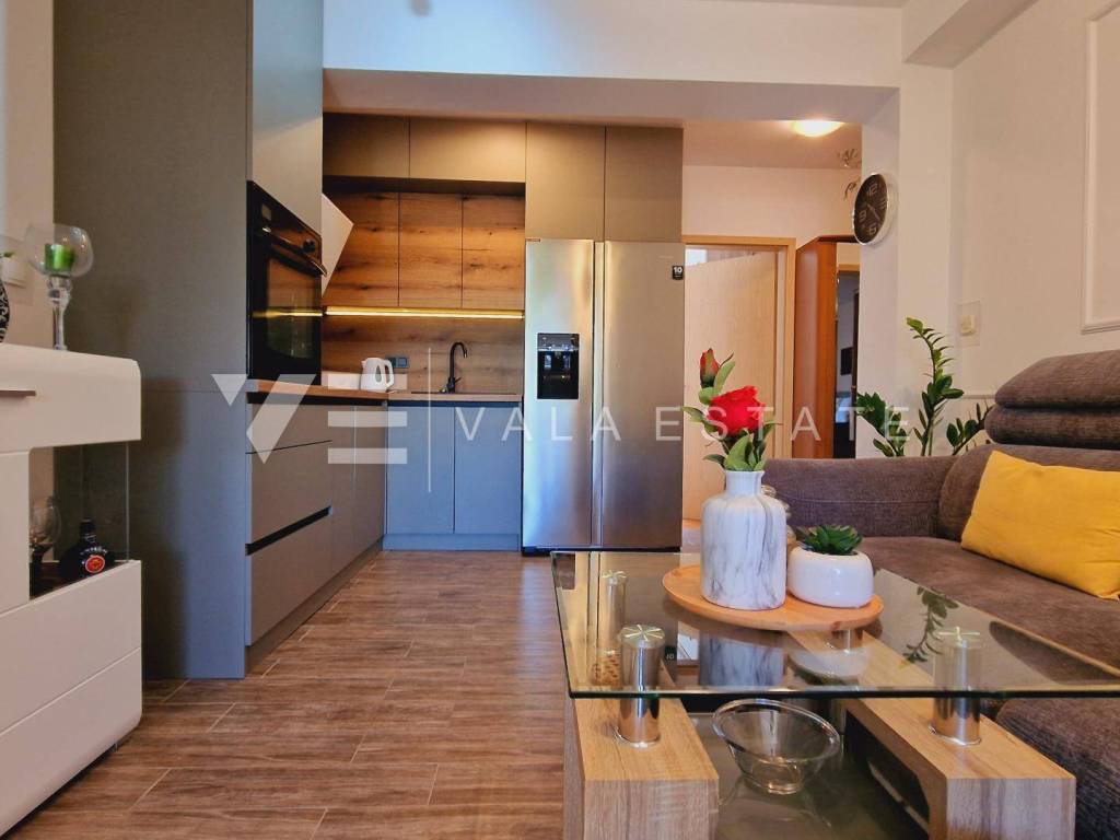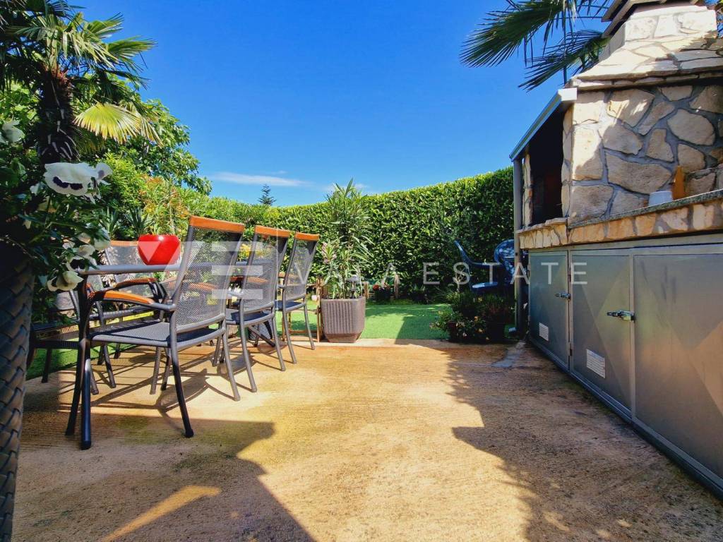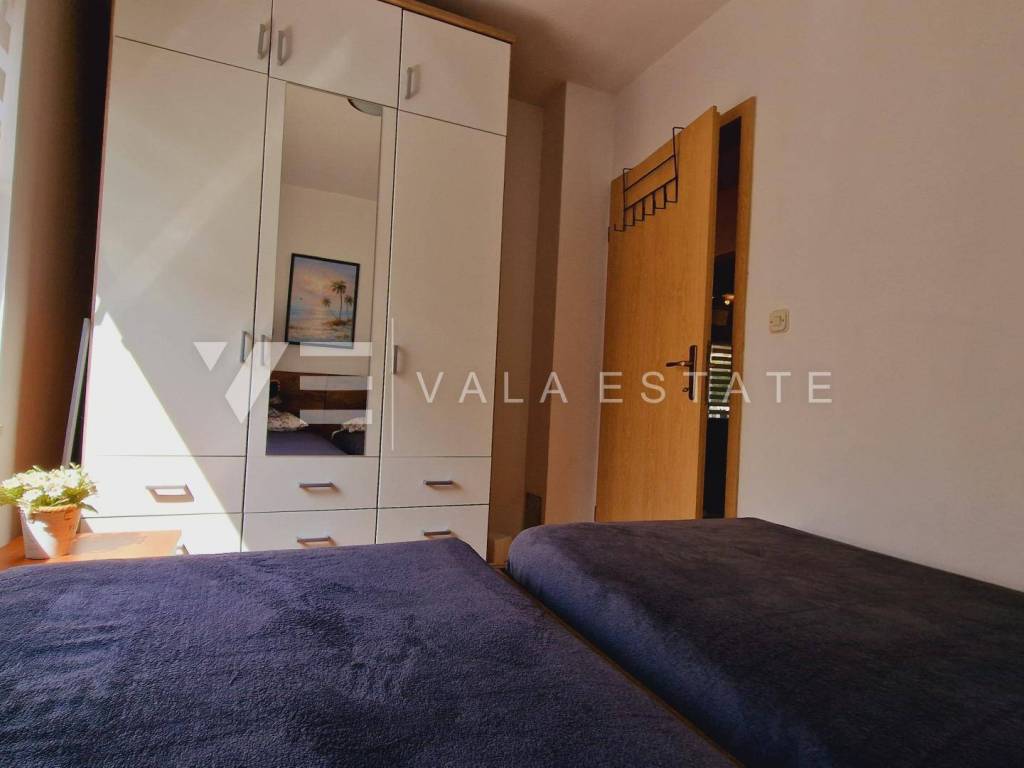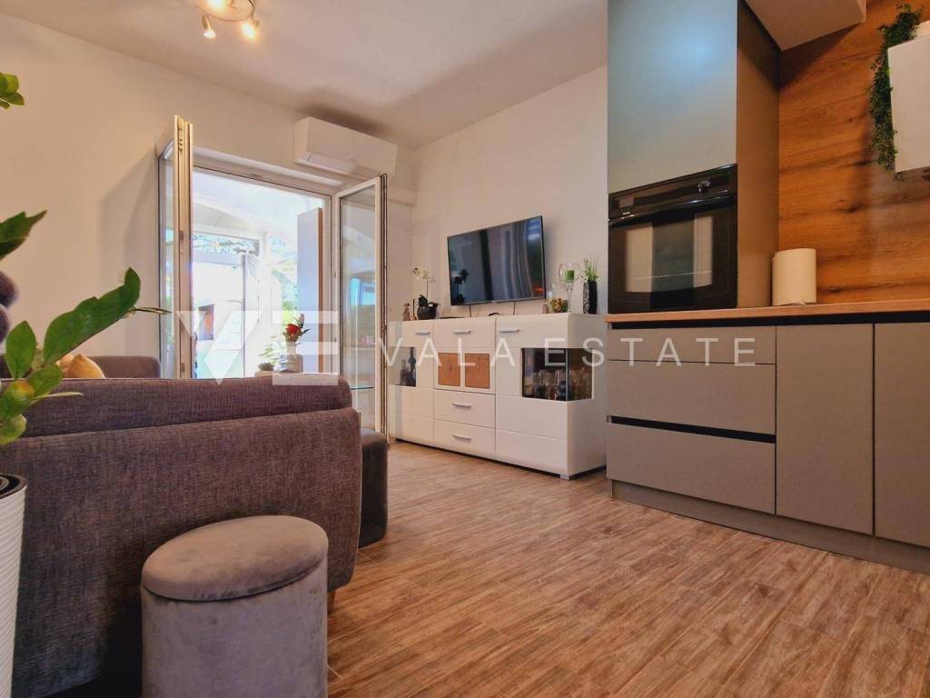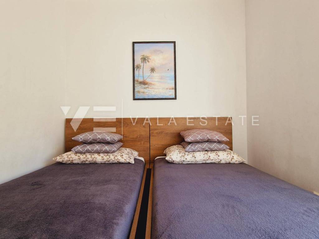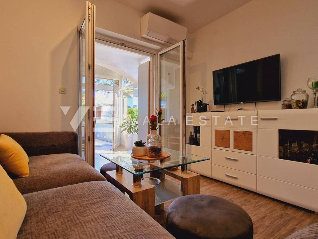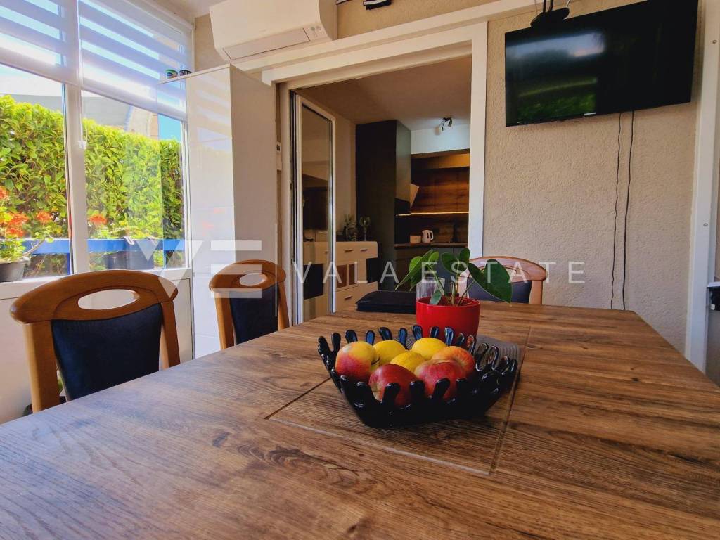 Real estate island Krk, Malinska bay - for sale is an apartment on the ground floor of a residential building located near beautiful beaches and the center with all facilities. The apartment occupies 60.50 m2 of living space divided into an entrance hall, a storage room, a bathroom, two bedrooms, a kitchen with a dining room and a living room with access to a covered terrace and a beautifully decorated and fenced yard with a summer kitchen, grill and storage. The apartment was renovated in 2022, it is fully furnished and equipped, it is air-conditioned, it has PVC exterior joinery, and it has two parking spaces in the common yard of the building. Due to its location, it is a great opportunity for own use or for tourist rental.