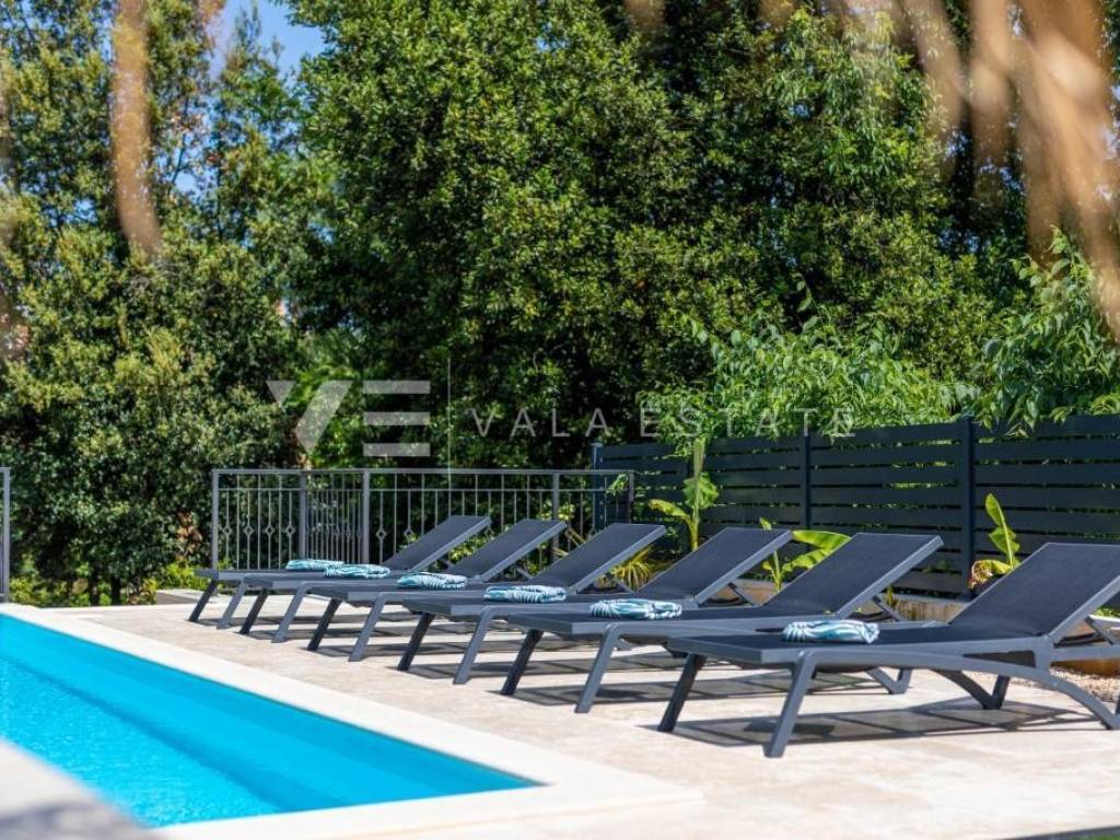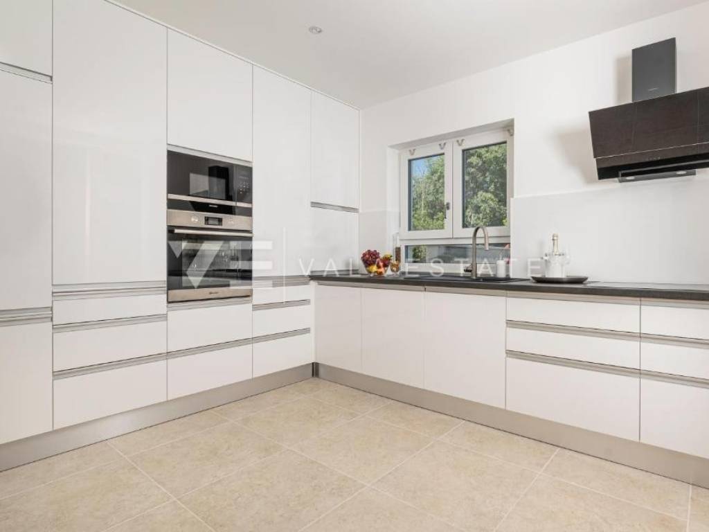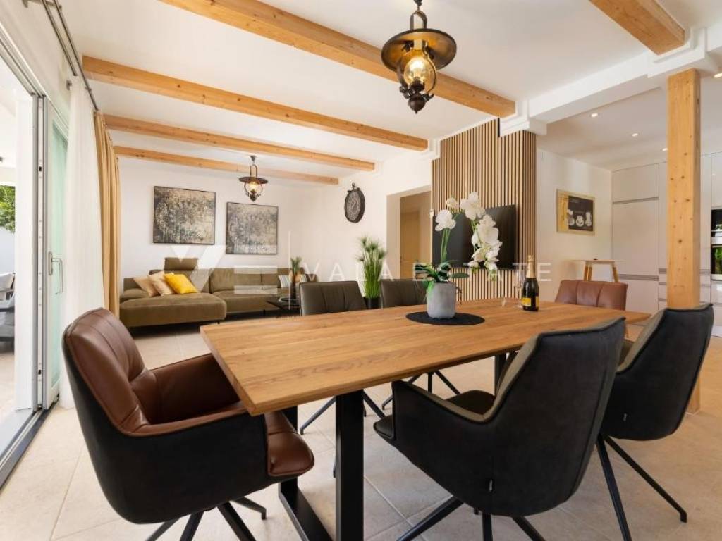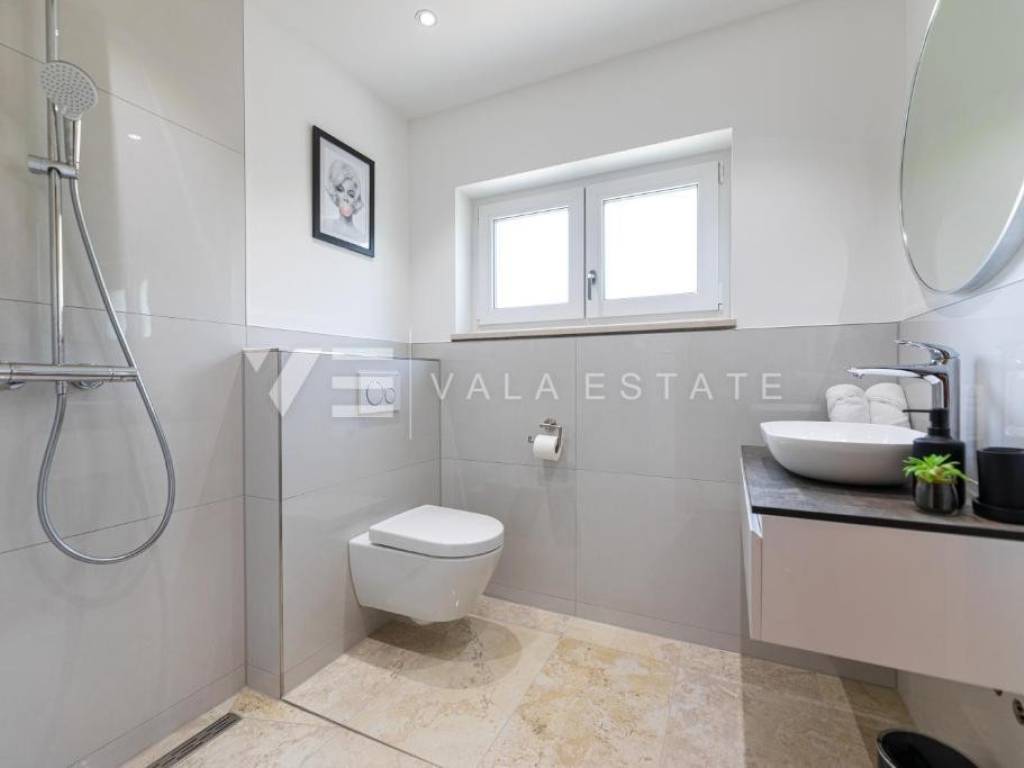 Real estate island Krk, town of Krk - for sale is a luxurious modern villa that exudes elegance and style. The rooms in the house are divided into two floors, covering 200 m2 of living space. On the ground floor there is an entrance area, three storage rooms, one of which can be used as a room, a toilet, a bathroom, a spacious living room, a large kitchen and a dining room with access to a covered terrace and a beautifully landscaped garden with a heated pool and sun deck. On the first floor there is a hallway, three bathrooms, four bedrooms and a loggia. It has a garage and several parking spaces in the garden. The villa is equipped with top-quality equipment and appliances from renowned manufacturers, burglar-proof doors, floor heating with a heat pump in the rooms and bathrooms, multi-split air conditioning, quality floor coverings and sanitary facilities. It is sold fully furnished and equipped and ready to move into. It is located in a very attractive location, just a few minutes' walk from the sea and the center with all amenities.
