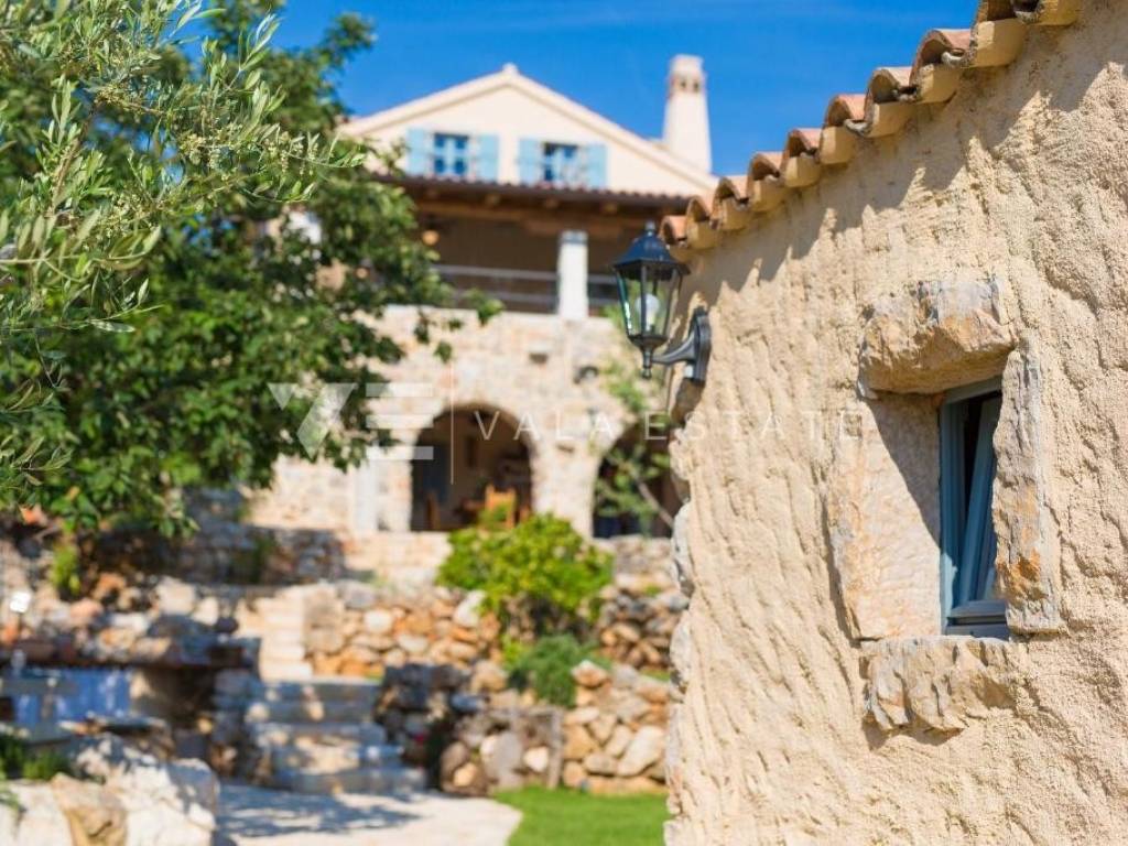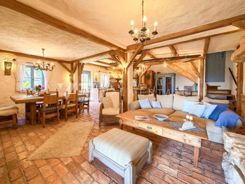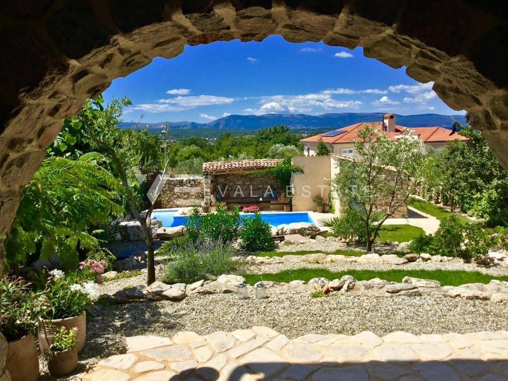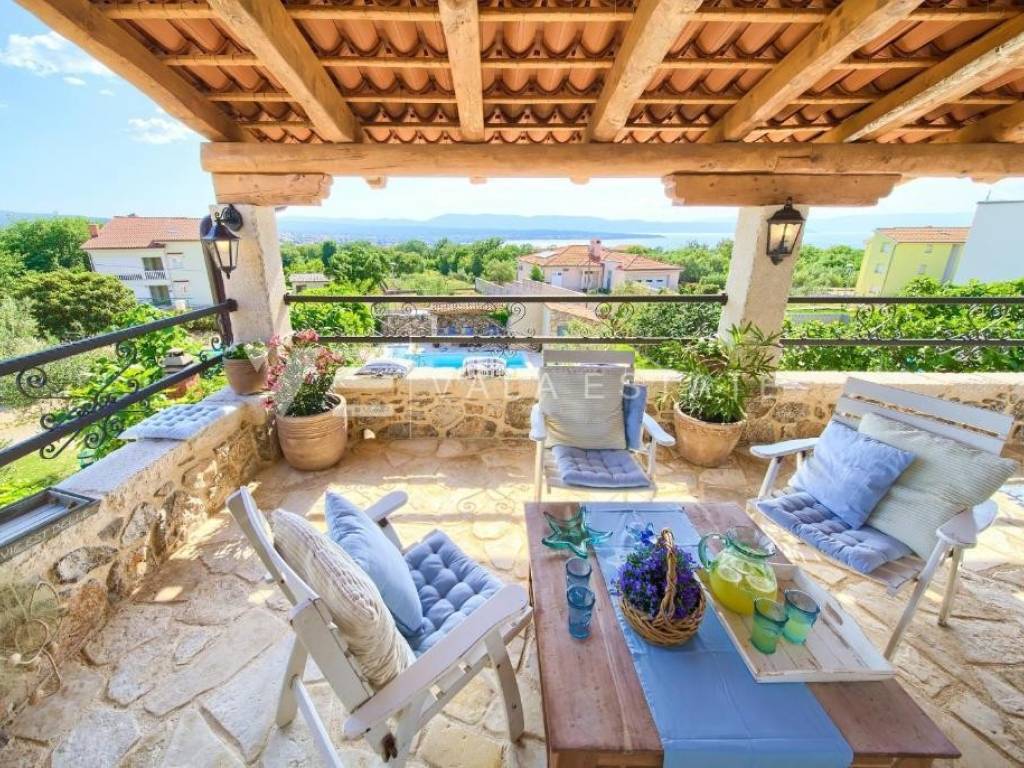 Real estate on the island of Krk, around Malinska - a rustic stone villa for sale with a view of the sea and a swimming pool surrounded by a beautiful garden. It was completely renovated in 2018 and occupies 260 m2 of living space distributed over the basement, ground floor, first floor and high attic. There is a wine cellar in the basement. The ground floor includes a toilet, a kitchen with a dining area and a comfortable living room with a fireplace and access to a covered terrace. On the first floor there are two bedrooms, a bathroom and a large covered terrace with a view of the sea. There are two more bedrooms and a bathroom in the high attic. The villa is very tastefully decorated in a traditional Mediterranean style with a lot of stone details and is fully equipped and furnished to high standards, of which it is worth highlighting the heat pump heating system, air conditioning system, internal fan convector for heating and cooling with a regulation system for each individual room, high-quality wooden joinery, installed new installations, installed new Mediterranean tiles and other quality features. A summer kitchen, barbecue, stone table for ten people, saltwater pool, sunbathing area, bowling alley, ancillary facility with pool equipment and several parking spaces are located on the fenced garden that provides privacy. It is enriched with Mediterranean herbs and has an automatic irrigation system. The location is beautiful and peaceful, surrounded by greenery and located about 1000 m from the sea and all amenities.