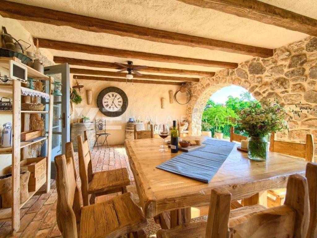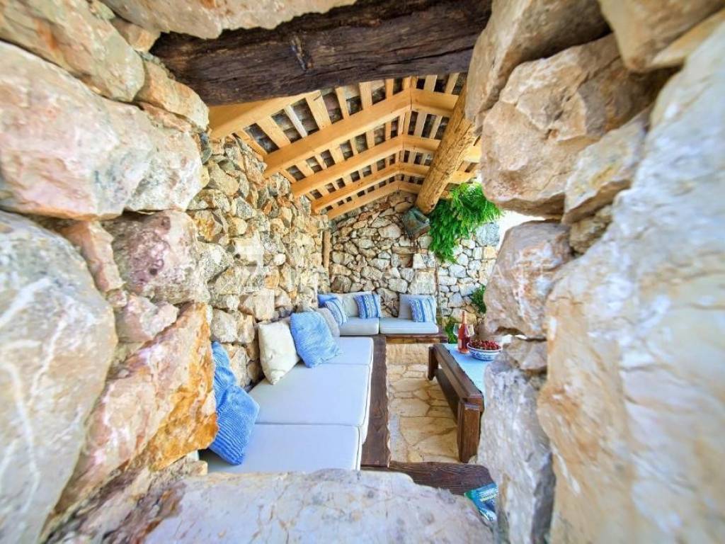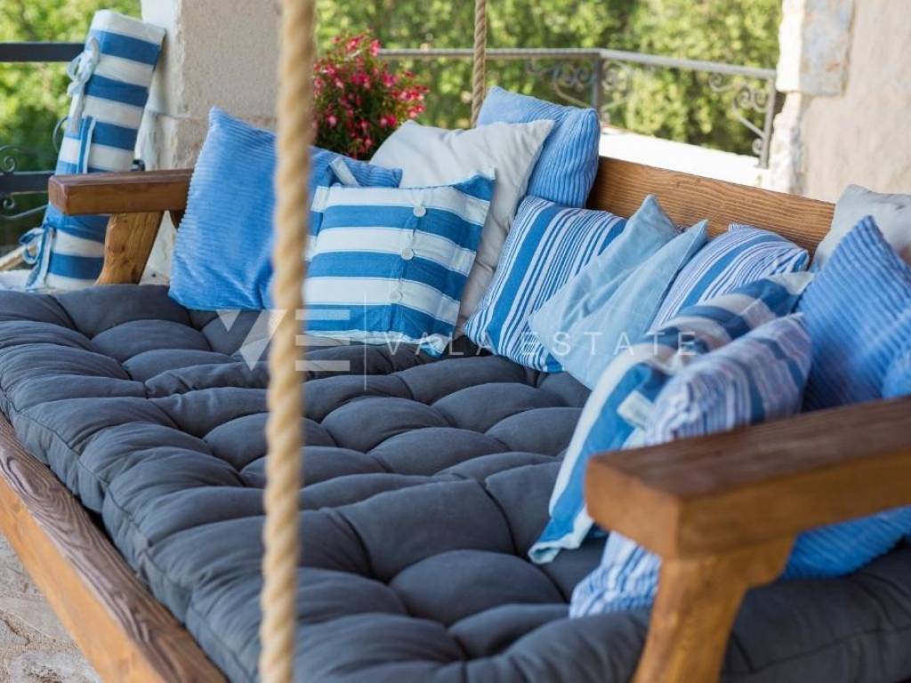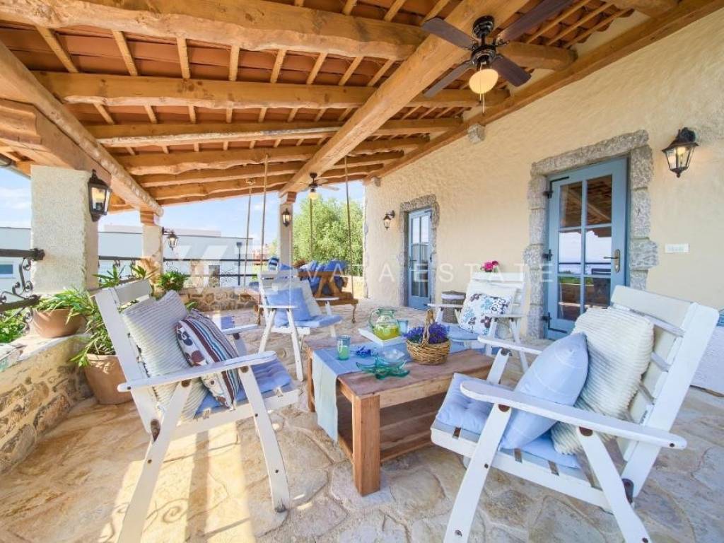 Real estate on the island of Krk, around Malinska - a rustic stone villa for sale with a view of the sea and a swimming pool surrounded by a beautiful garden. It was completely renovated in 2018 and occupies 260 m2 of living space distributed over the basement, ground floor, first floor and high attic. There is a wine cellar in the basement. The ground floor includes a toilet, a kitchen with a dining area and a comfortable living room with a fireplace and access to a covered terrace. On the first floor there are two bedrooms, a bathroom and a large covered terrace with a view of the sea. There are two more bedrooms and a bathroom in the high attic. The villa is very tastefully decorated in a traditional Mediterranean style with a lot of stone details and is fully equipped and furnished to high standards, of which it is worth highlighting the heat pump heating system, air conditioning system, internal fan convector for heating and cooling with a regulation system for each individual room, high-quality wooden joinery, installed new installations, installed new Mediterranean tiles and other quality features. A summer kitchen, barbecue, stone table for ten people, saltwater pool, sunbathing area, bowling alley, ancillary facility with pool equipment and several parking spaces are located on the fenced garden that provides privacy. It is enriched with Mediterranean herbs and has an automatic irrigation system. The location is beautiful and peaceful, surrounded by greenery and located about 1000 m from the sea and all amenities.