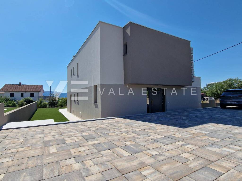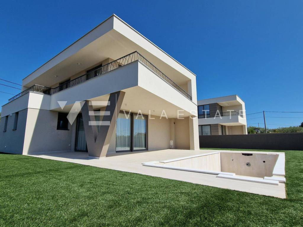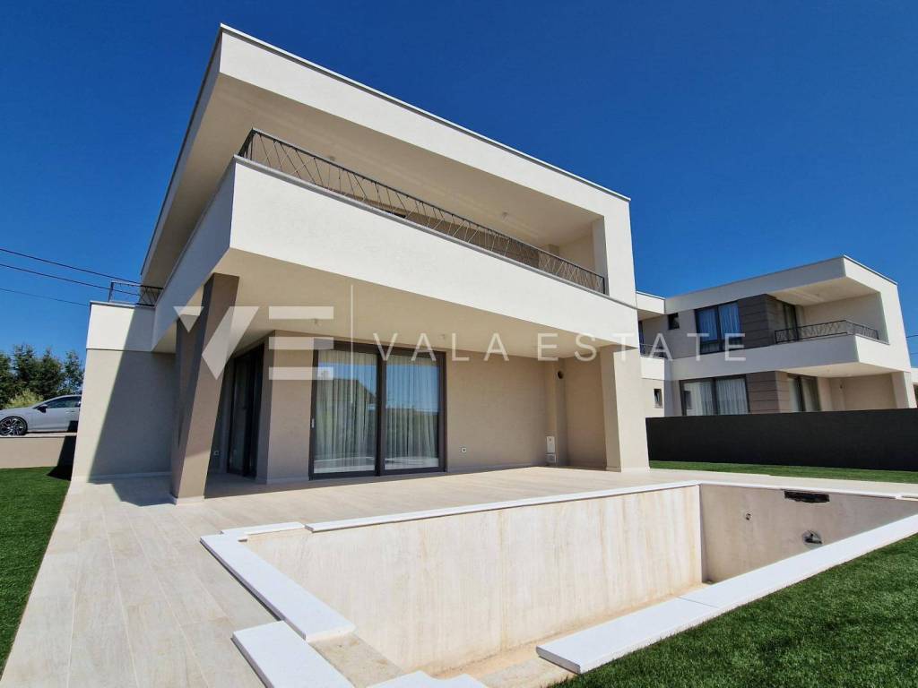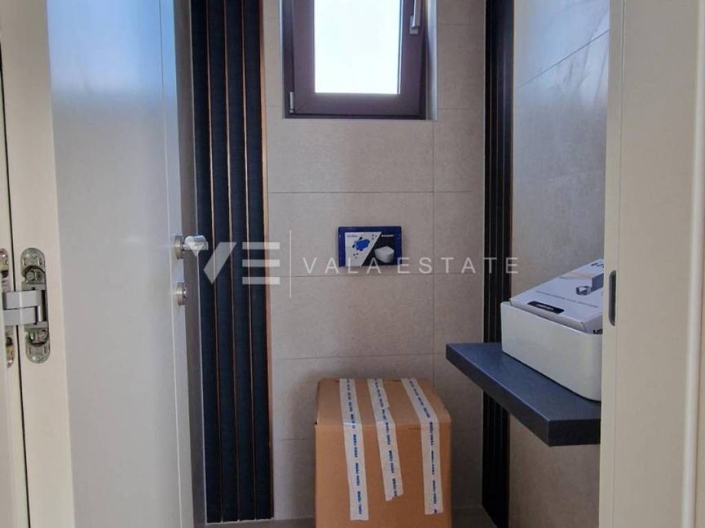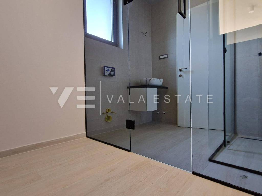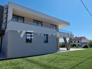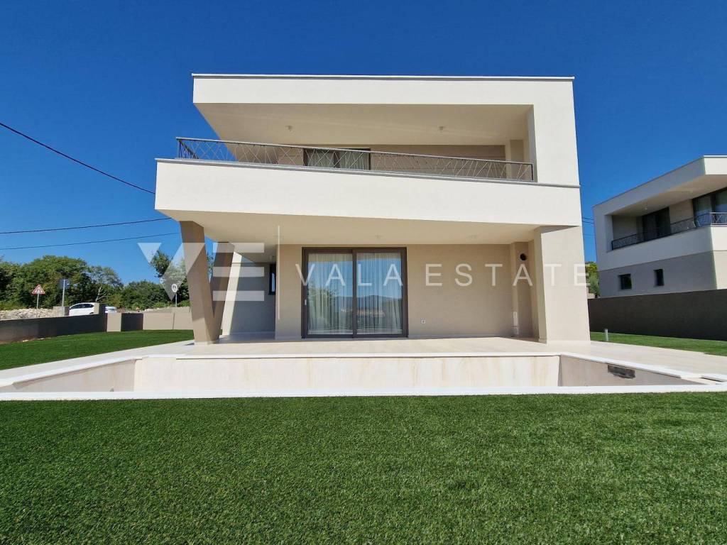 Real estate on the island of Krk, around the town of Krk - in a quiet environment of family houses and nature, a new detached villa for sale with a beautiful view of the sea. The villa is spread over two floors with a total of 212.99 m2 of living space. On the ground floor there are two storage rooms, a toilet, a sauna, one bedroom with its own bathroom, a kitchen and a dining area, and a living room with access to a covered terrace and a landscaped garden with a swimming pool and sunbathing area. On the first floor there are two bathrooms, a dressing room and three bedrooms, each with its own exit to a covered terrace with a view of the sea. High quality construction and equipment, underfloor heating, multi-split air conditioning, video surveillance are just some of the characteristics of this beautiful new villa. The exterior decoration and Mediterranean vegetation will give the villa complete privacy, and there are also two parking spaces in the fenced yard. The planned completion of construction is by June 2024. The location is quiet, approx. 1500 m from beautiful beaches.