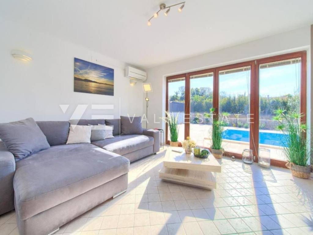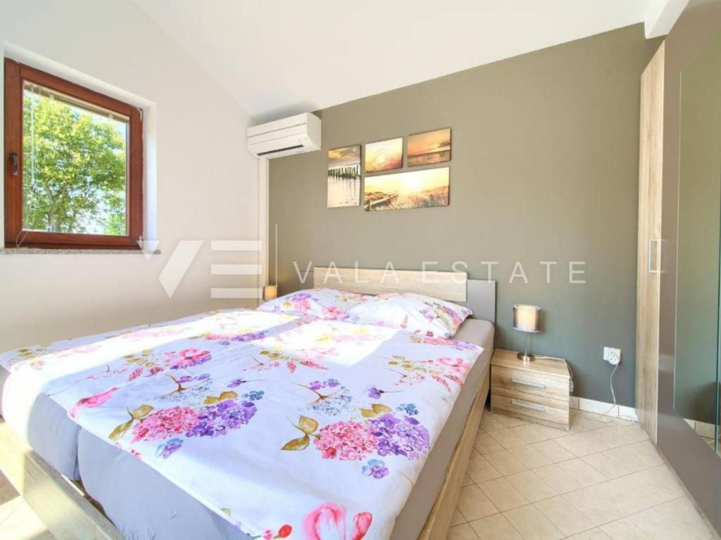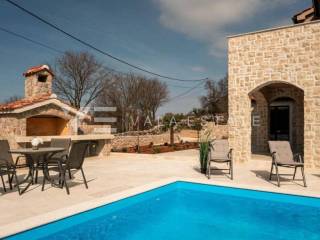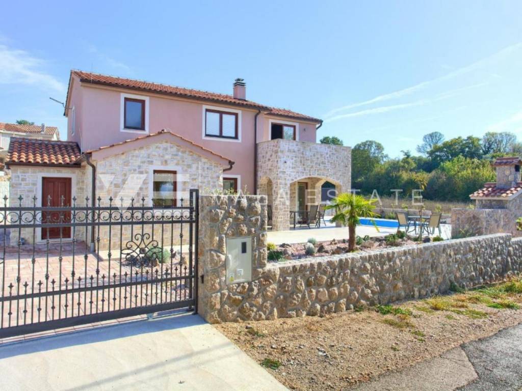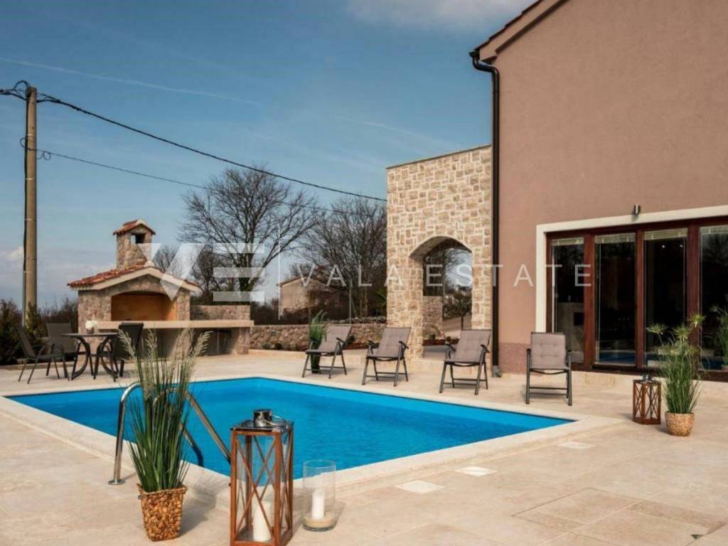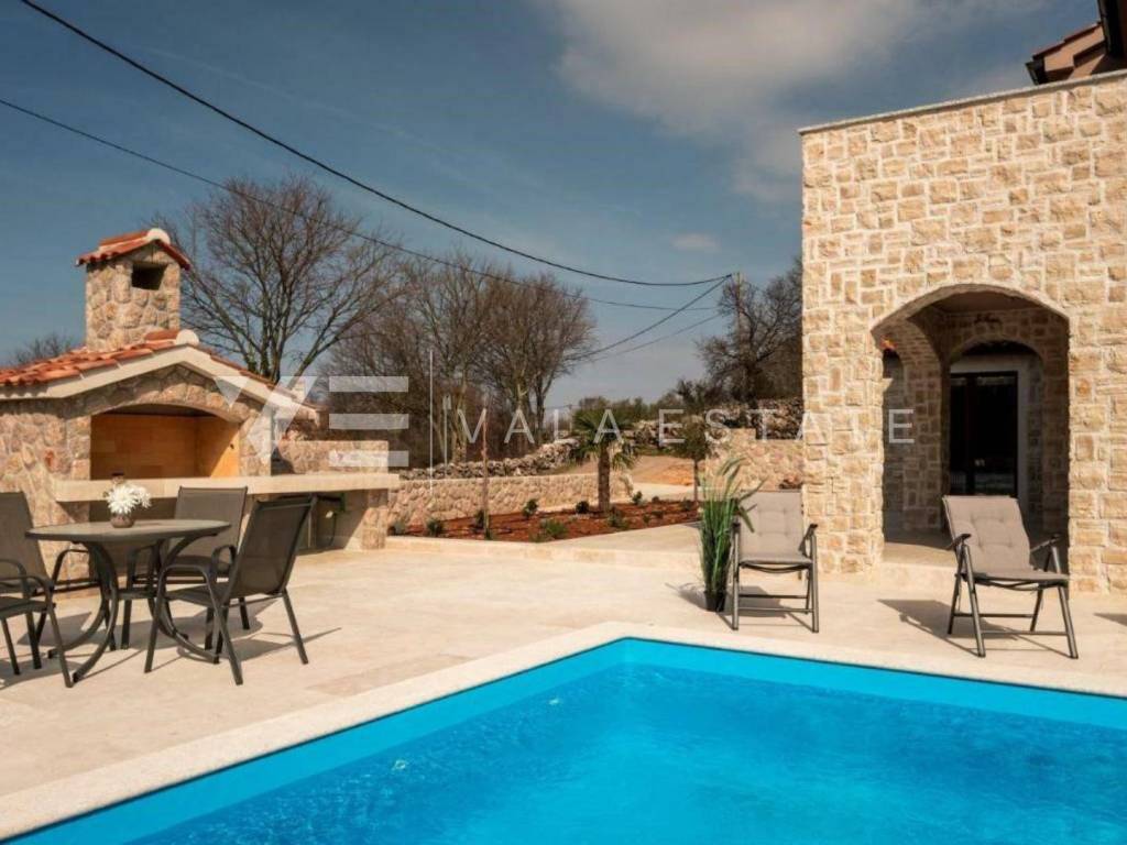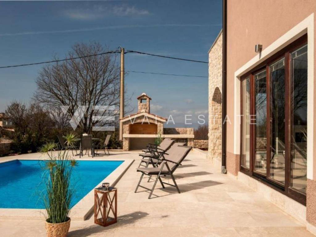 Real estate island of Krk, around Malinska - for sale is a newer detached partly stone villa with a swimming pool located in a quiet rural location in the vicinity of Malinska. The villa was built on a plot of 510 m2 and consists of a ground floor where there is an entrance hall, a storage room, a bedroom and a space that unites the living room with a kitchen and dining room, and an upper floor where there are a bathroom and two bedrooms, one of which has an exit to the balcony with sea view. The ground floor leads to a covered terrace and a beautifully landscaped garden with its own swimming pool, sun deck, brick outdoor grill and parking for two cars. The villa is of high quality construction and equipment, has multisplit air conditioning, is tastefully furnished and is being sold as such. It is categorized for tourist rental and already has a well-established business, and is located in a quiet area surrounded by nature and greenery and not far from beautiful beaches and the center of Malinska.