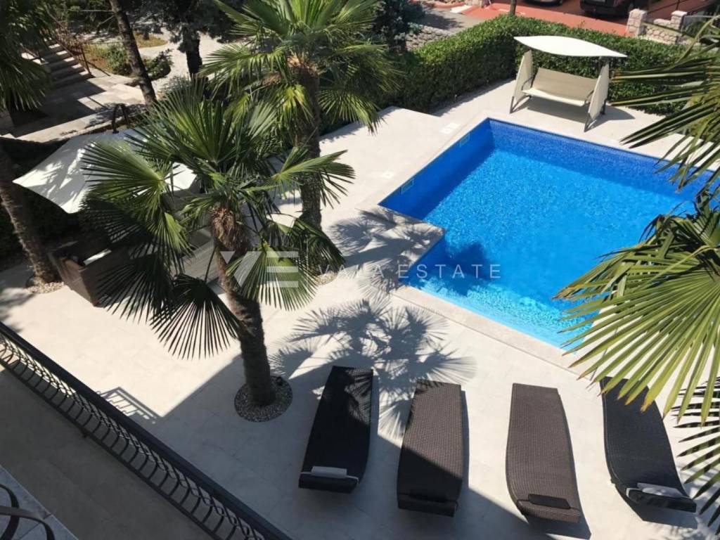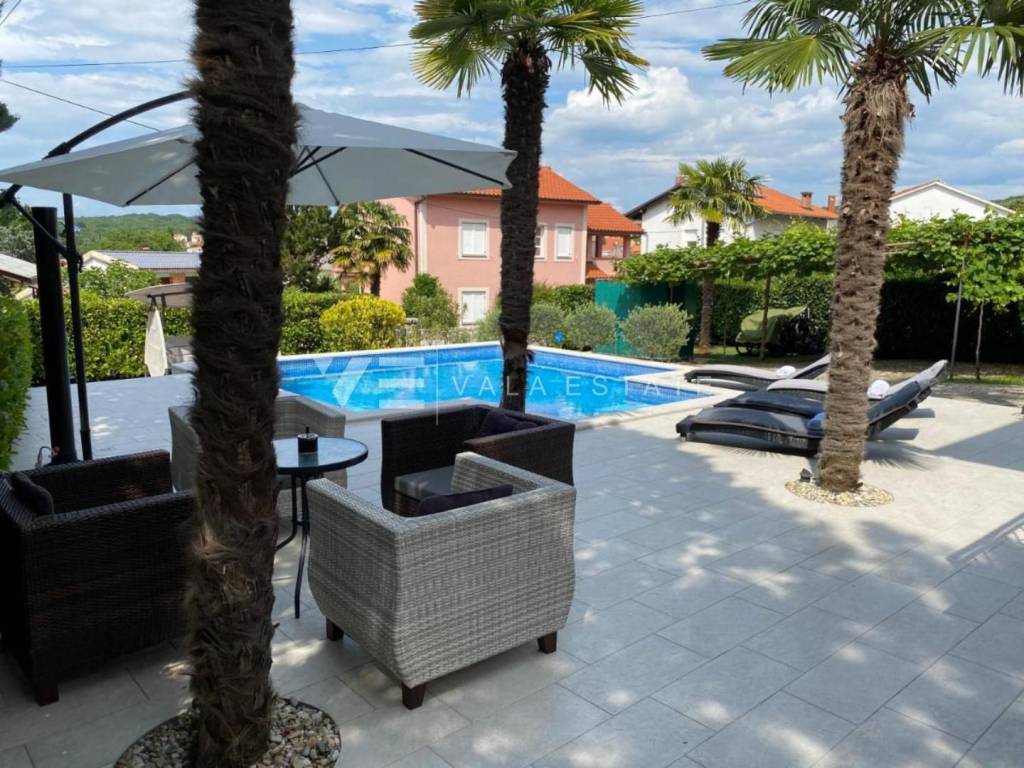 Real estate Island of Krk, Malinska - a detached house for sale with a large garden and swimming pool in an excellent location only 500 m from the sea and the center of Malinska. It covers 150 m2 of living space and consists of a ground floor and a first floor with two separate residential units with separate entrances. On the ground floor of the house there is an apartment with two bedrooms, a bathroom, a toilet, a kitchen with a dining room and a living room with access to a large terrace. There is an apartment on the first floor, which has the same layout and square footage as the one on the ground floor. There is a swimming pool, a sunbathing area and a barbecue on the beautifully landscaped garden. The house is located near the sea and beautiful beaches and is an excellent choice as a vacation home or investment for tourist rental because it already has a long-established business.