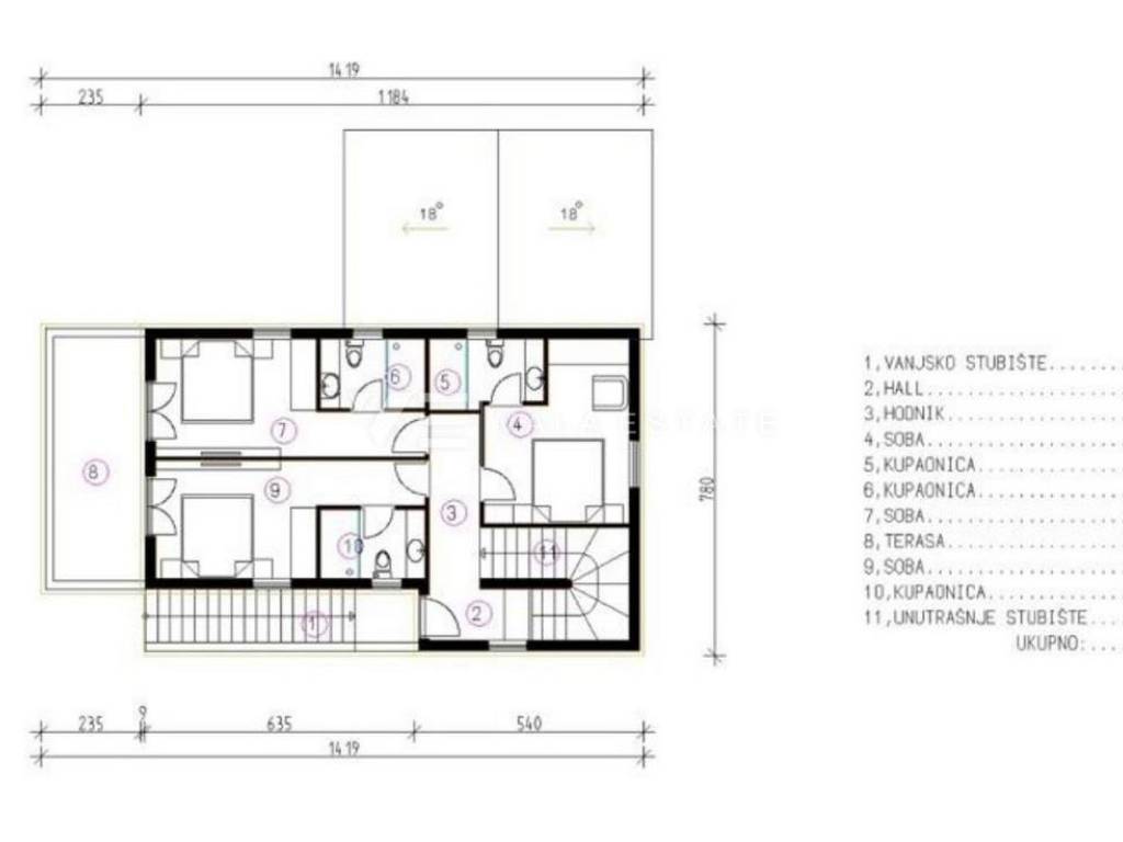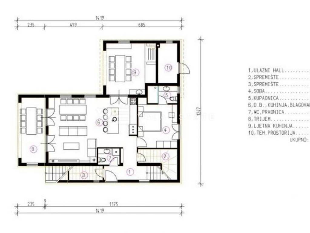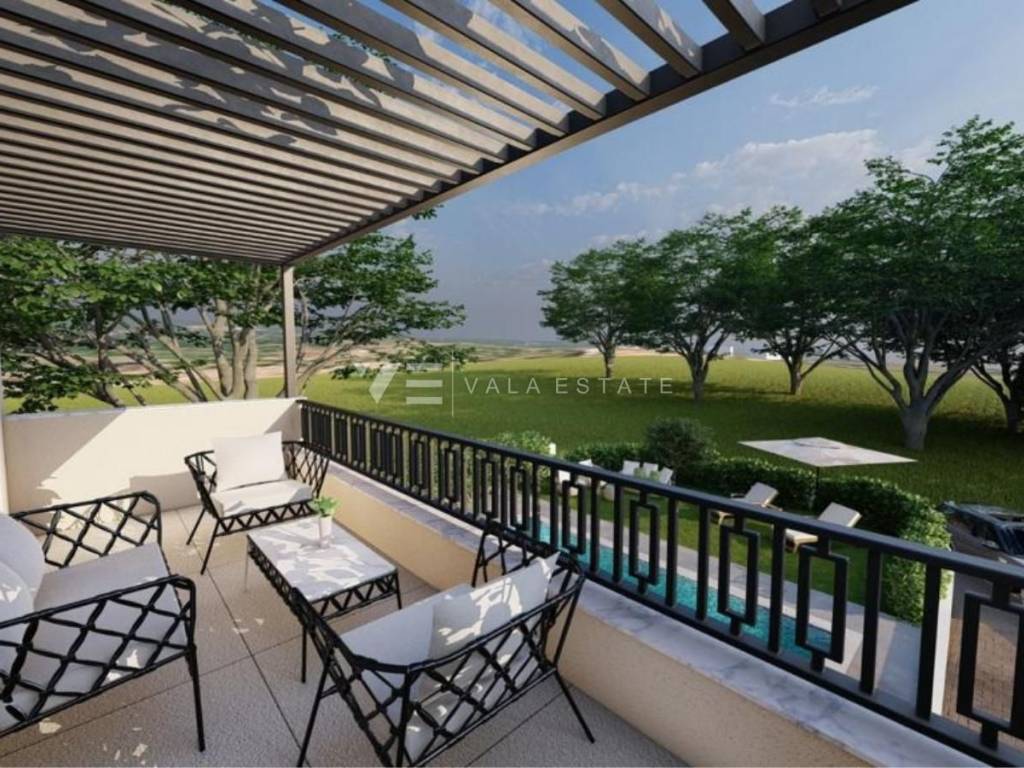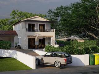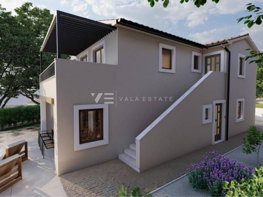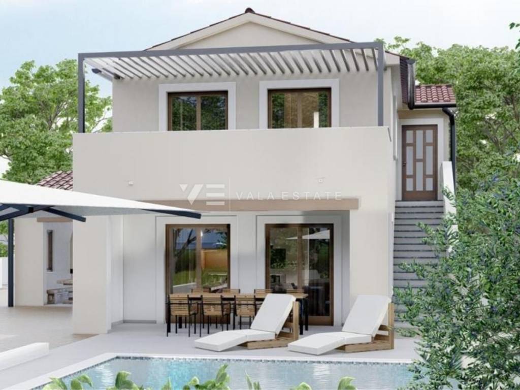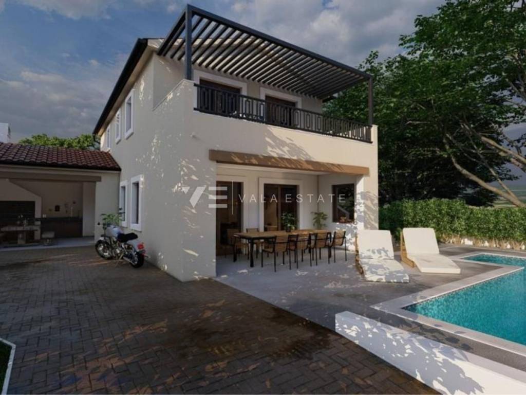 Real estate on the island of Krk, around Malinska - for sale is a new villa designed in an autochthonous coastal style in a quiet rural location in the immediate vicinity of Malinska. The living area of the villa of 196.58 m2 is distributed on the ground floor and first floor. On the ground floor there is an entrance hall, two storage rooms, a technical room, a summer kitchen, a bedroom, a bathroom, a toilet with a laundry room and a spacious living room with a kitchen and a dining room with access to a covered porch. Internal and external stairs lead to the first floor where there is a hallway, three bedrooms, three bathrooms and a balcony with a view of the sea and the Kvarner Bay. There is a swimming pool with a sunbathing area and parking for three cars on a beautifully landscaped and green garden of 662 m. High-quality construction and equipment, multi-split room air conditioning, heat pump floor heating, top-quality carpentry, floor coverings and sanitary equipment. The location where it is located is surrounded by greenery and peace, and at the same time it is close enough to the sea and beautiful beaches and the center of Malinska. The property is currently in the initial phase of construction, and the planned completion and occupancy is by the end of 2023.