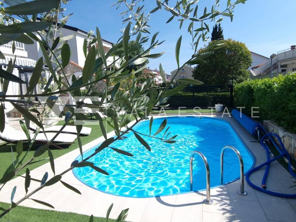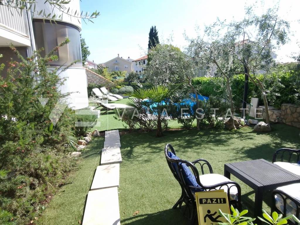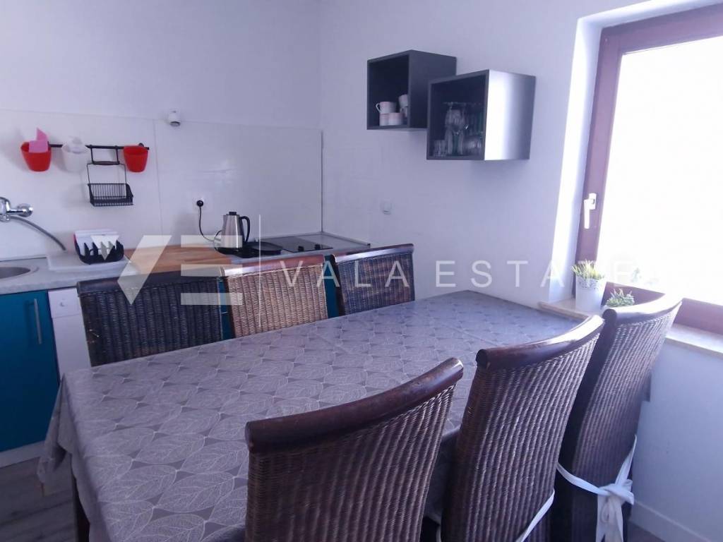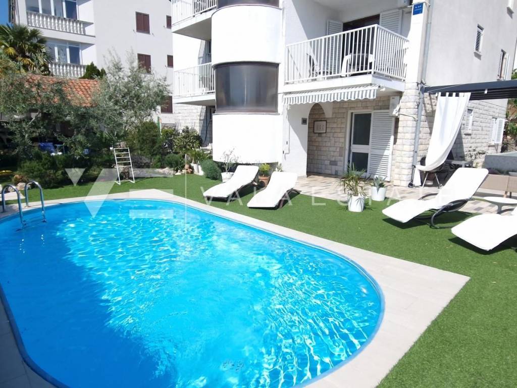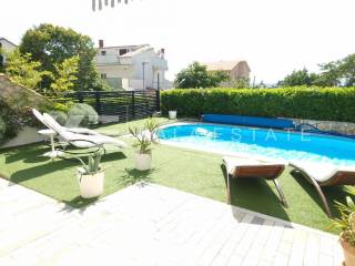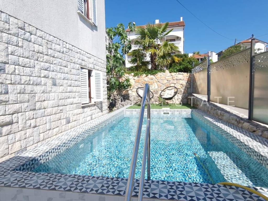 Real estate Krk island - in the center of Malinska for sale is an attractive detached house on three floors with six beautifully decorated apartments, distributed within 400 m2, intended for tourist rent. The house was built in 2001 and renovated in 2019. The ground floor has a comfortable two-bedroom apartment, one studio apartment, storage and a space that serves as a laundry room. On the first floor there are two more two-bedroom apartments with balconies of about 60 m2, and on the second floor, or high attic there are two more one-bedroom apartments. Each apartment is fully furnished and air-conditioned and has a kitchen with a dining area, living room, bathroom, comfortable bedrooms and balconies overlooking the sea. The landscaped garden of 704 m2 has a common pool measuring 7 x 3.5 m2 with a sunbathing area, summer kitchen with barbecue and terrace.