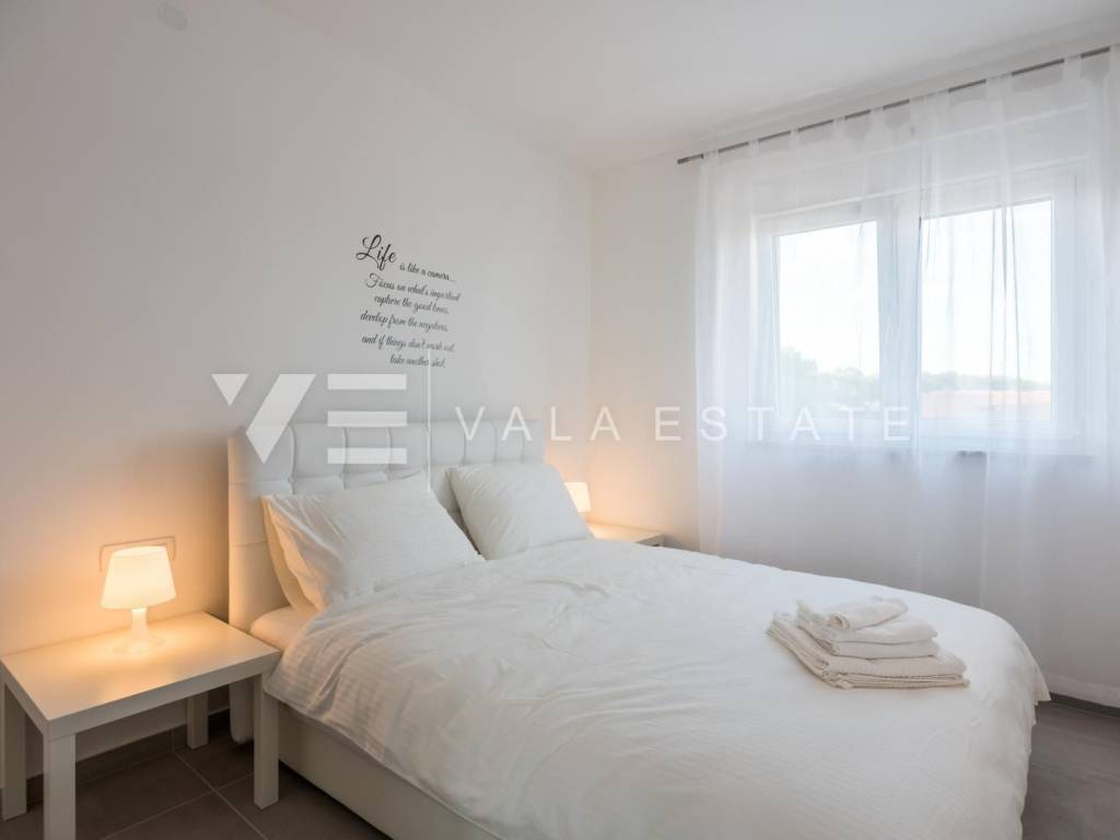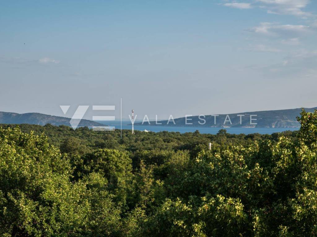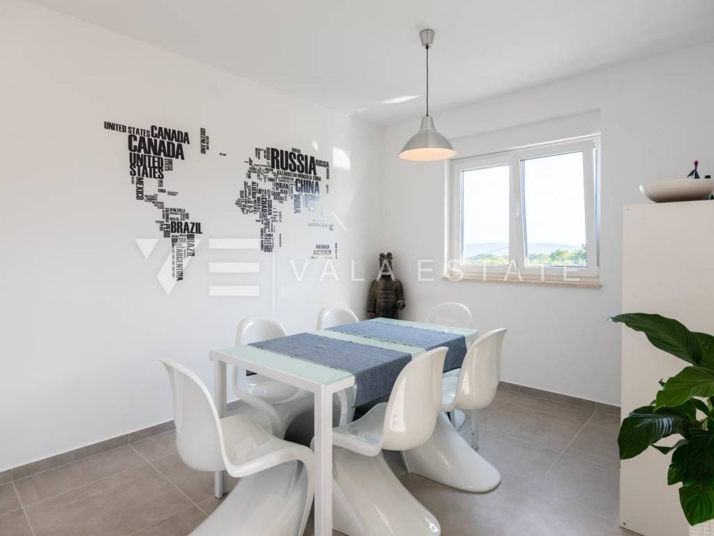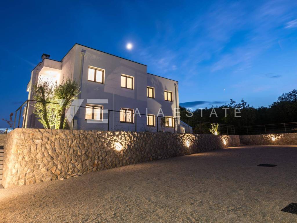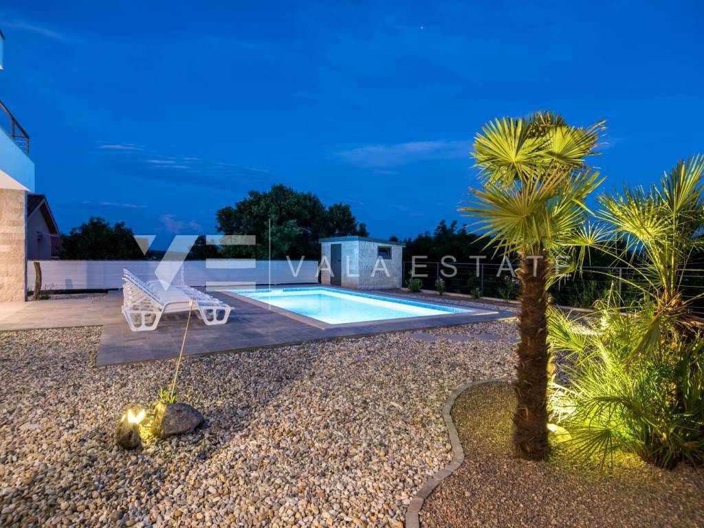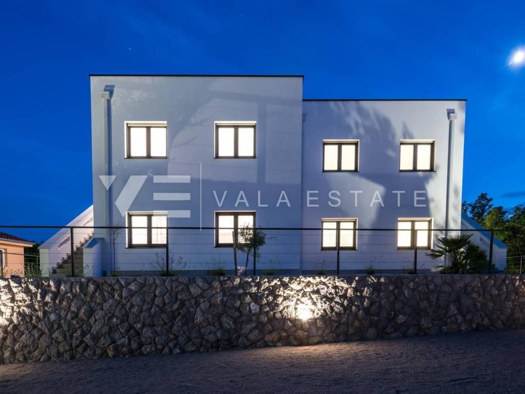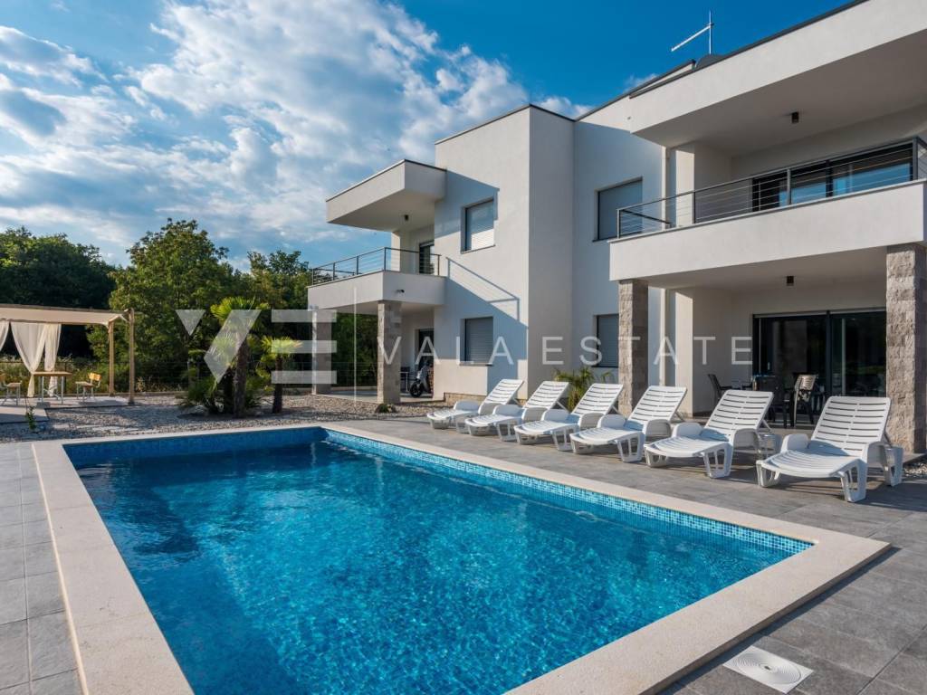 Real estate Krk island, Krk town, wider area - for sale is a new, fully furnished and very tastefully designed villa with a total of 300 m2, located in a quiet location 2500 meters away from the sea. The villa was built in 2018 and extends to two floors with a total of four residential units categorized as tourist rentals. All apartments have a living area of 75 m2 and consist of a kitchen with dining area, living room, two bedrooms and a bathroom. The apartments on the first floor have their balconies with a beautiful sea view. For the construction of the building were used top quality materials, floor coverings as well as high quality sanitary equipment. The villa has underfloor heating and multi-split air conditioning. On a beautifully landscaped and enclosed garden of 839 m2 there is a 26 m2 swimming pool with a sunbathing area and a covered terrace. There are also eight parking spaces in the yard, two for every apartment. Great investment for holiday rental with a running business.