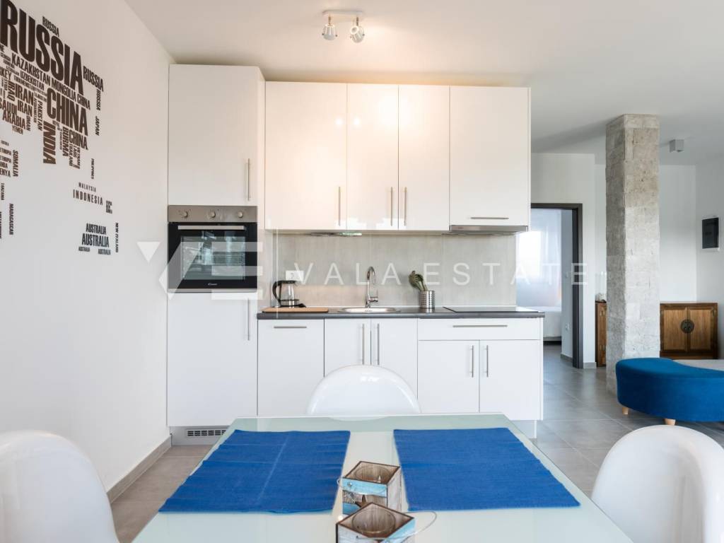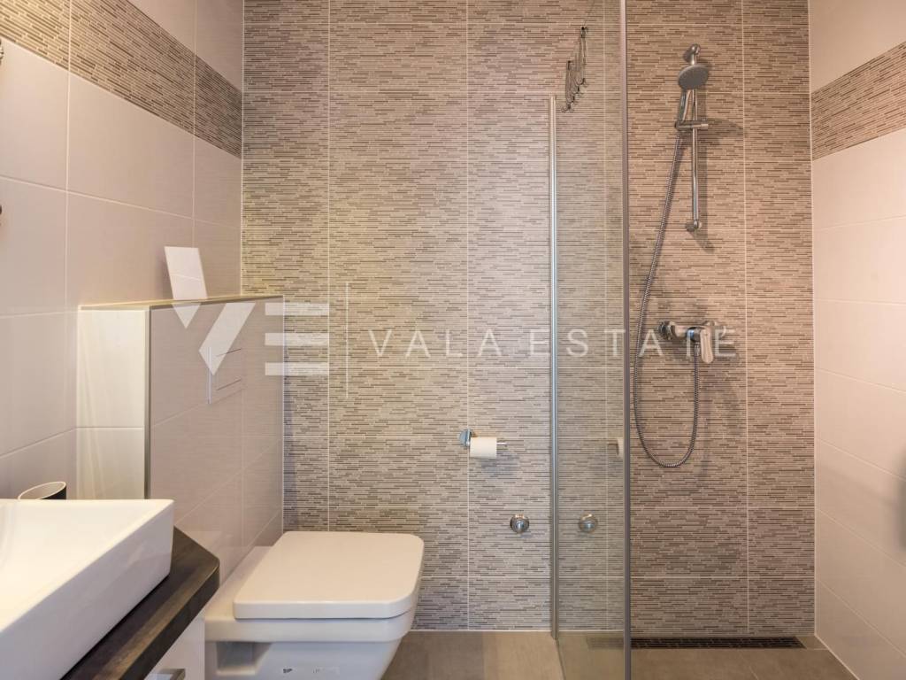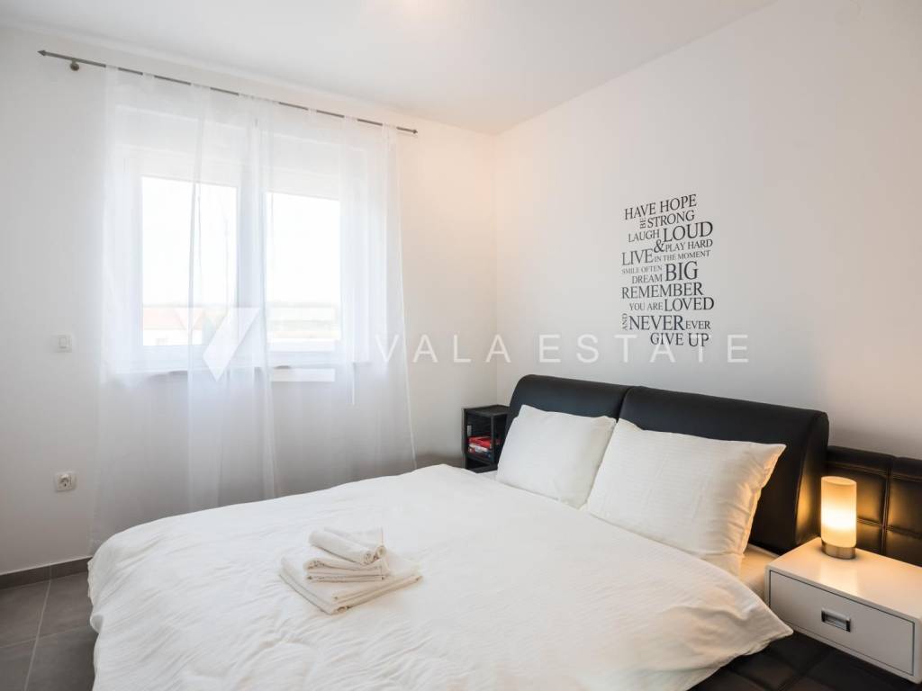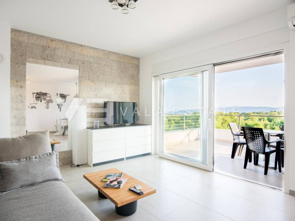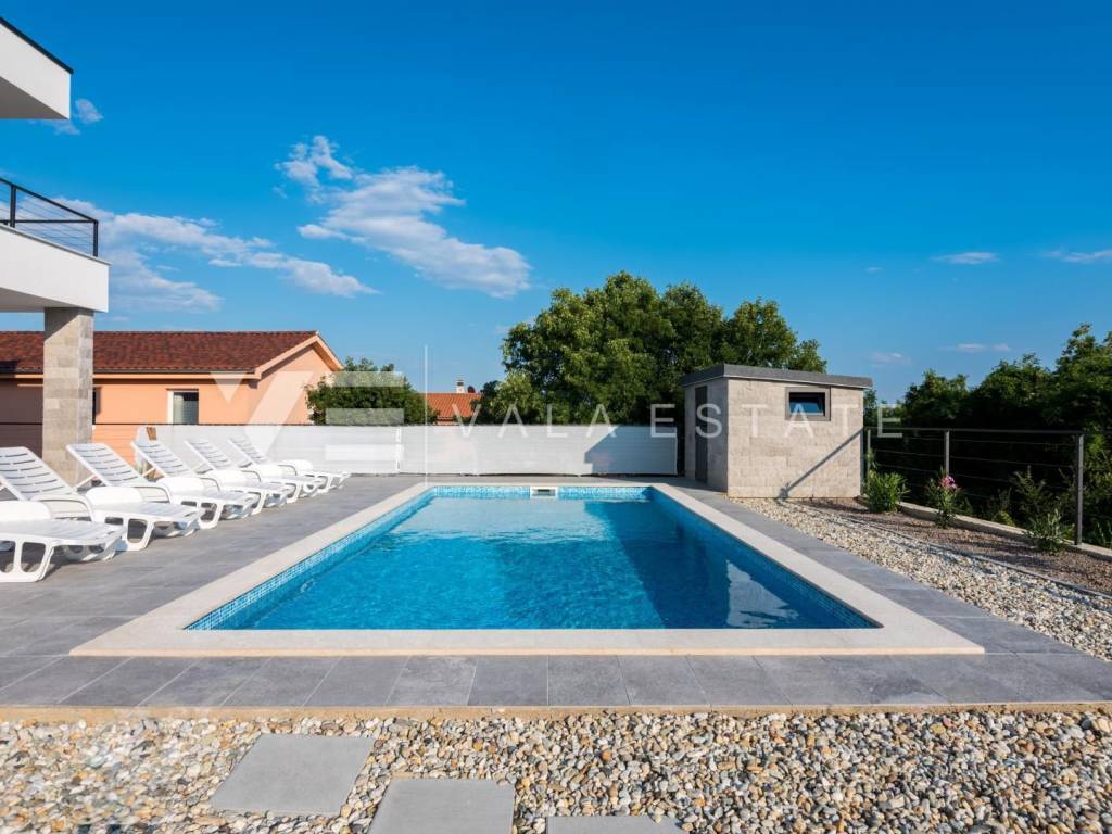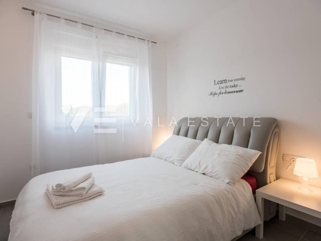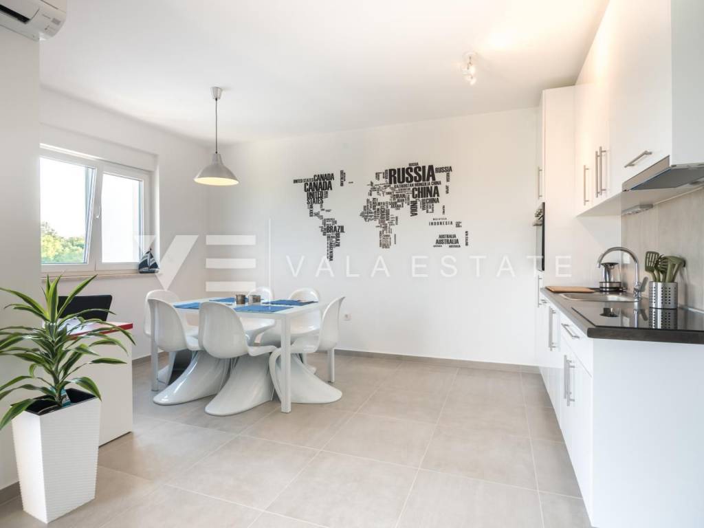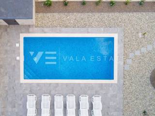 Real estate Krk island, Krk town, wider area - for sale is a new, fully furnished and very tastefully designed villa with a total of 300 m2, located in a quiet location 2500 meters away from the sea. The villa was built in 2018 and extends to two floors with a total of four residential units categorized as tourist rentals. All apartments have a living area of 75 m2 and consist of a kitchen with dining area, living room, two bedrooms and a bathroom. The apartments on the first floor have their balconies with a beautiful sea view. For the construction of the building were used top quality materials, floor coverings as well as high quality sanitary equipment. The villa has underfloor heating and multi-split air conditioning. On a beautifully landscaped and enclosed garden of 839 m2 there is a 26 m2 swimming pool with a sunbathing area and a covered terrace. There are also eight parking spaces in the yard, two for every apartment. Great investment for holiday rental with a running business.