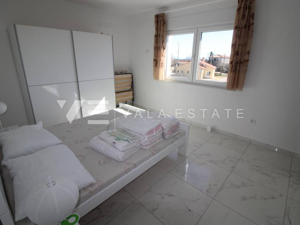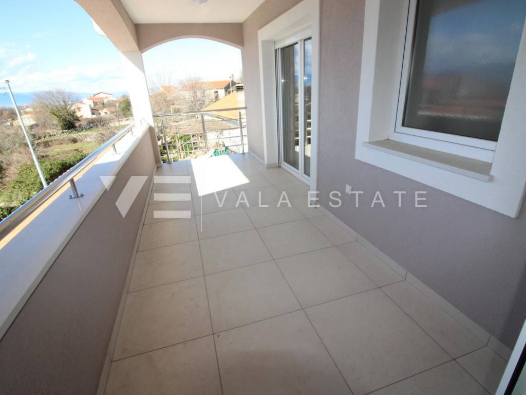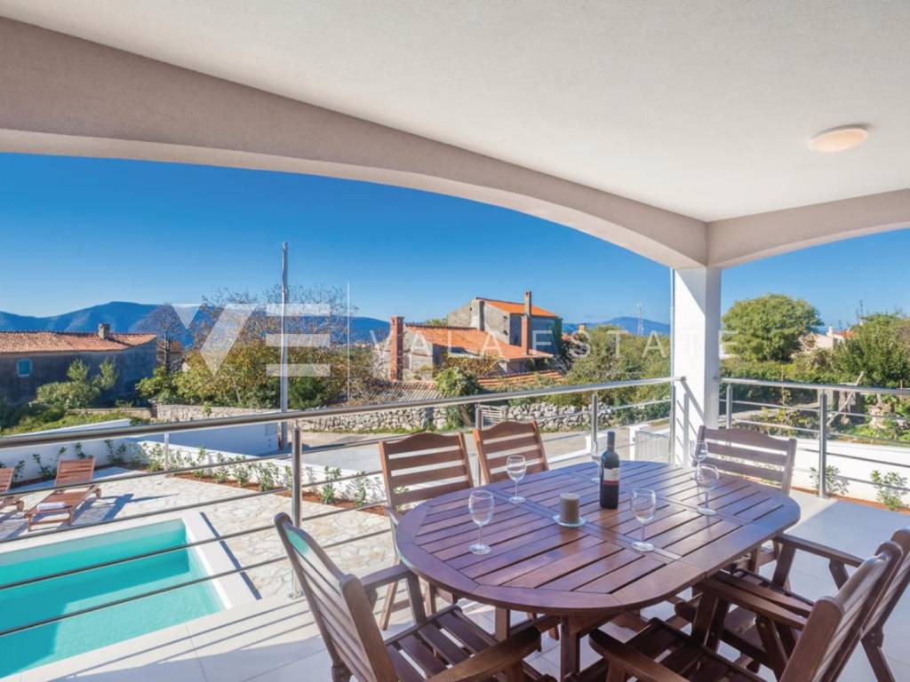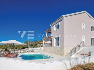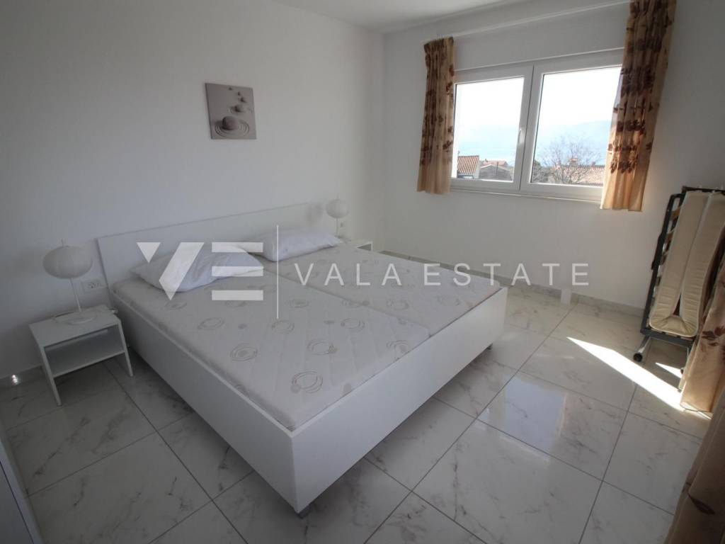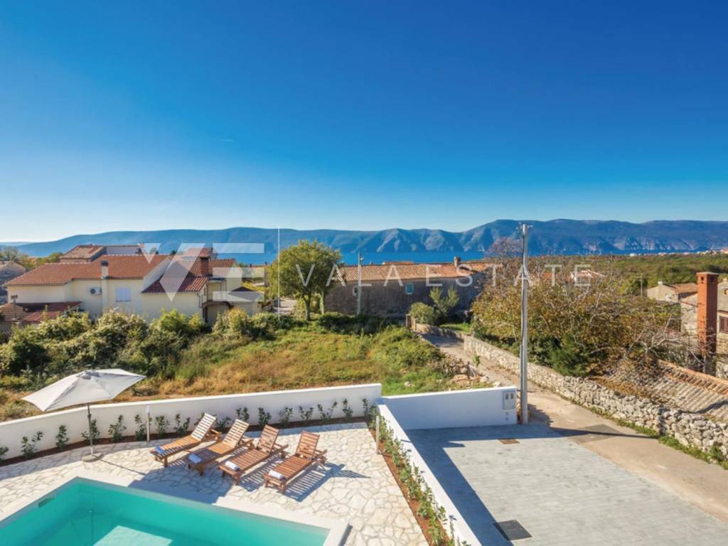 Real Estate Island of Krk - new free-standing house with 135 m2 living area built on the plot of 513 m2. The house consists of a higher ground floor where you have an entrance hallway, spacious living room, kitchen with dining area, guest toilette, one bedroom with a private bathroom and a spacious terrace, and first floor with three bedrooms with a private bathroom and a balcony with beautiful sea view. On a beautiful courtyard, there is a swimming pool of 24 m2, sun deck, grill and 3 parking spaces. Air-conditioned, preparation for central heating. Distance from the sea: 2000 m.