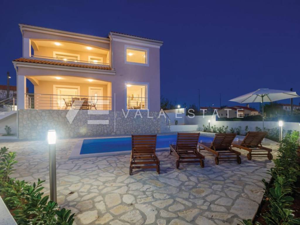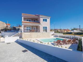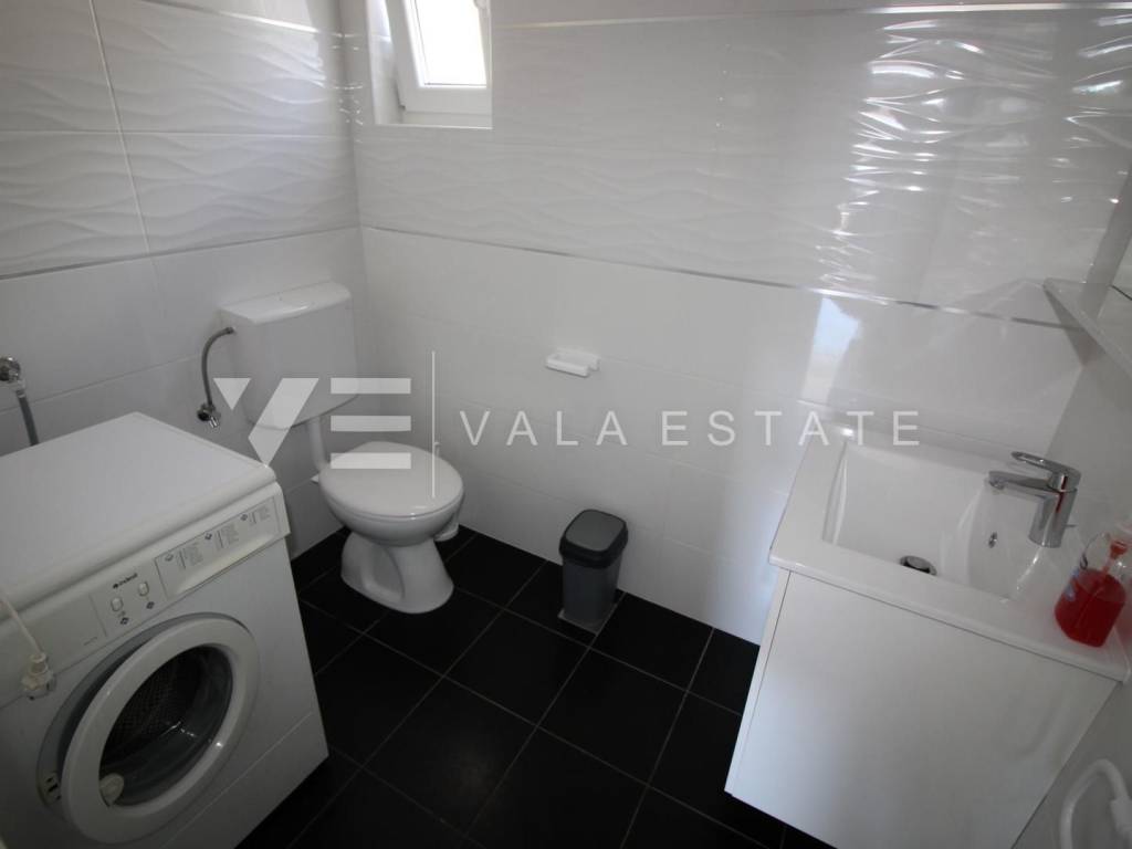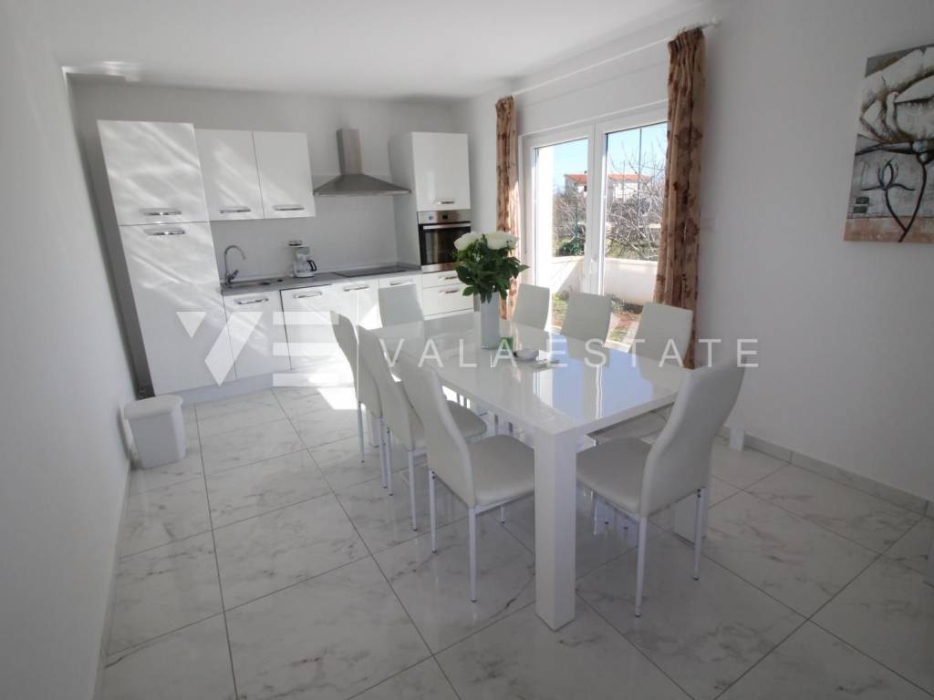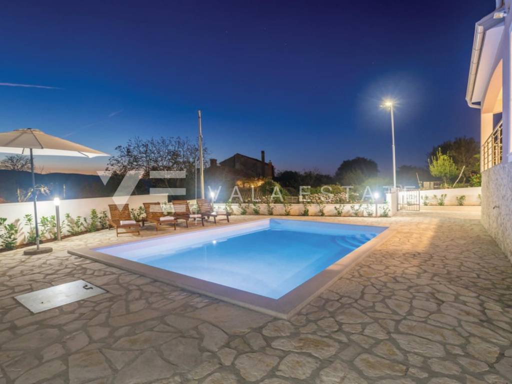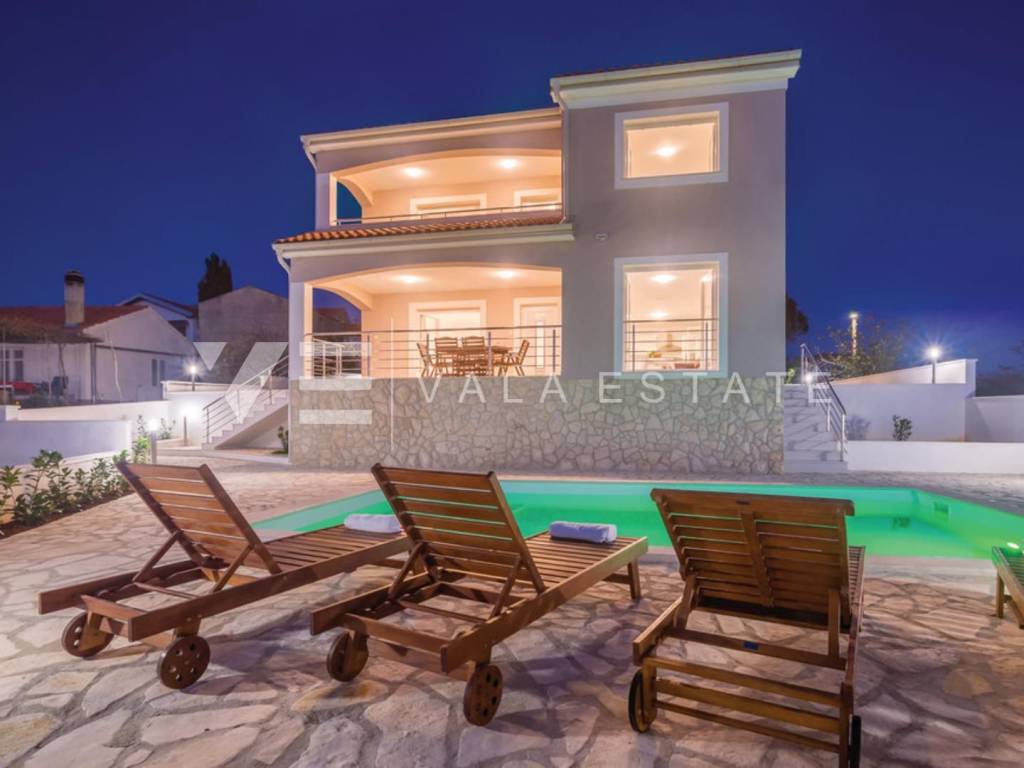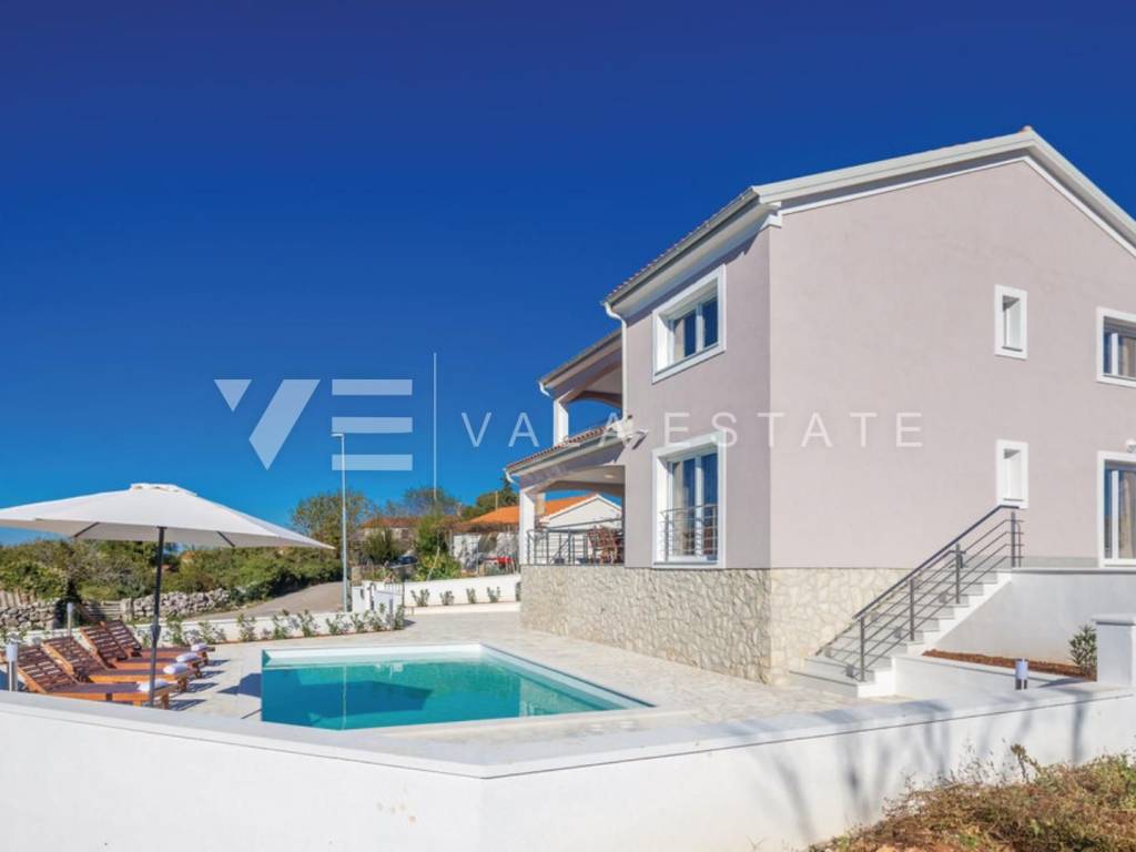 Real Estate Island of Krk - new free-standing house with 135 m2 living area built on the plot of 513 m2. The house consists of a higher ground floor where you have an entrance hallway, spacious living room, kitchen with dining area, guest toilette, one bedroom with a private bathroom and a spacious terrace, and first floor with three bedrooms with a private bathroom and a balcony with beautiful sea view. On a beautiful courtyard, there is a swimming pool of 24 m2, sun deck, grill and 3 parking spaces. Air-conditioned, preparation for central heating. Distance from the sea: 2000 m.