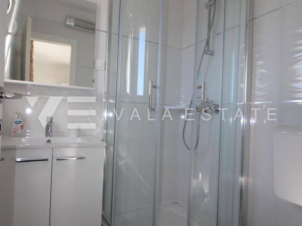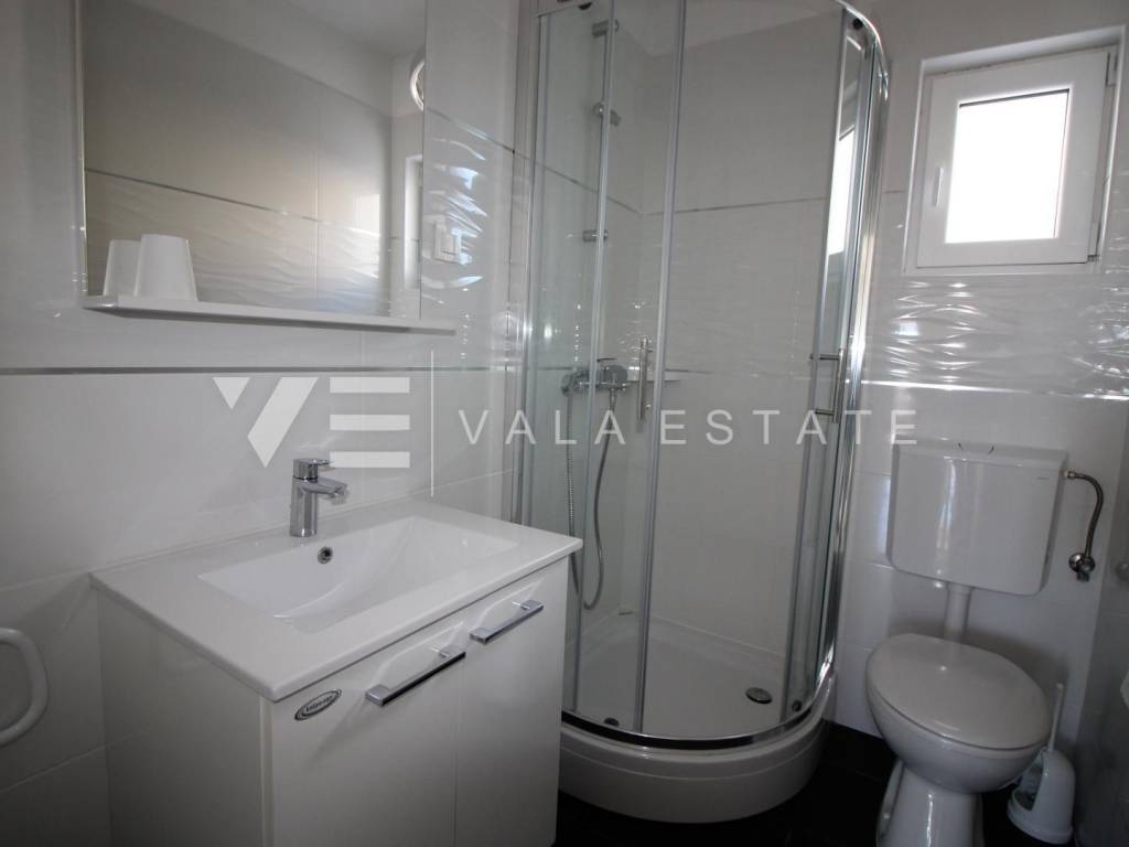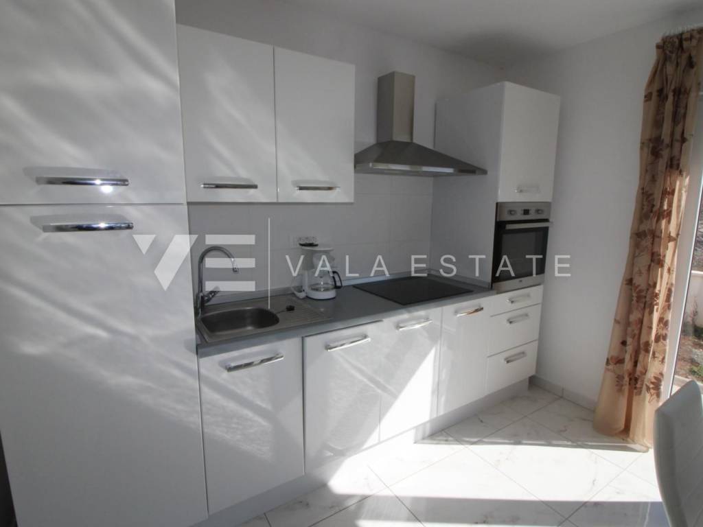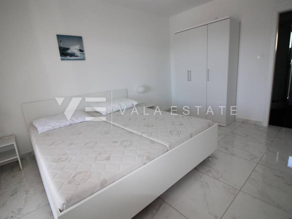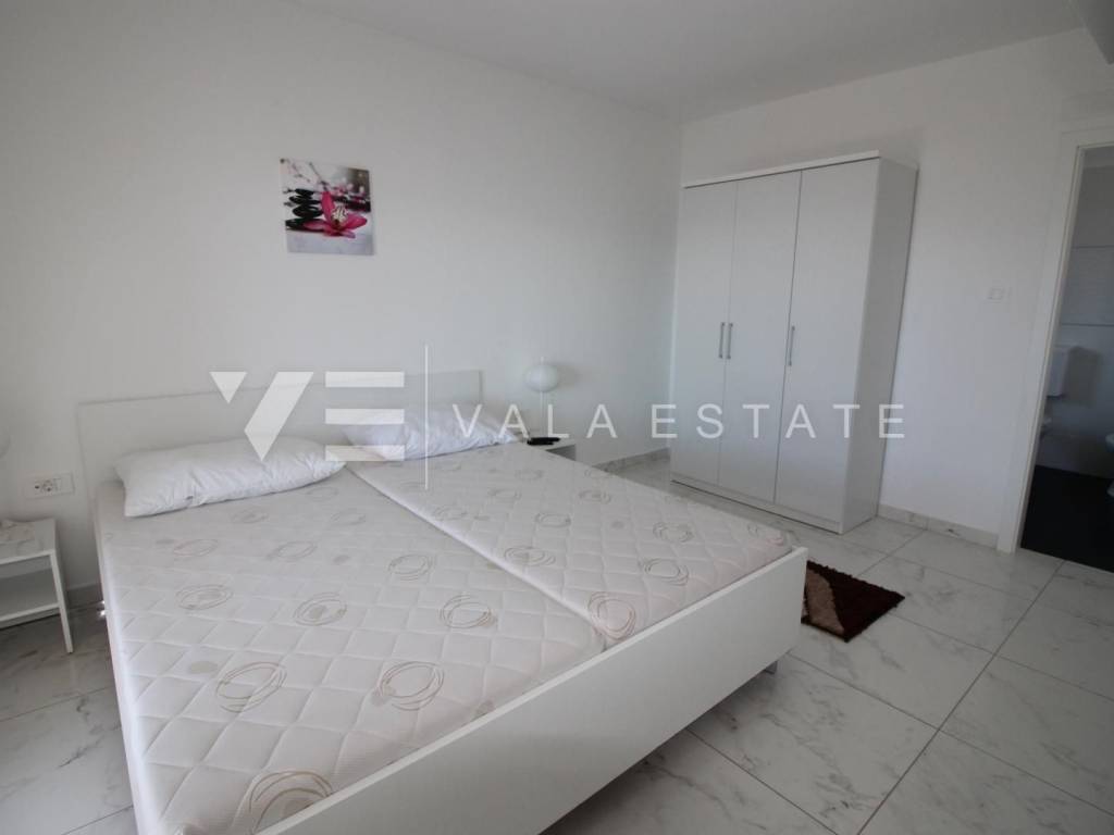 Real Estate Island of Krk - new free-standing house with 135 m2 living area built on the plot of 513 m2. The house consists of a higher ground floor where you have an entrance hallway, spacious living room, kitchen with dining area, guest toilette, one bedroom with a private bathroom and a spacious terrace, and first floor with three bedrooms with a private bathroom and a balcony with beautiful sea view. On a beautiful courtyard, there is a swimming pool of 24 m2, sun deck, grill and 3 parking spaces. Air-conditioned, preparation for central heating. Distance from the sea: 2000 m.