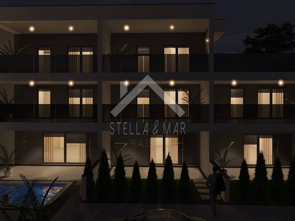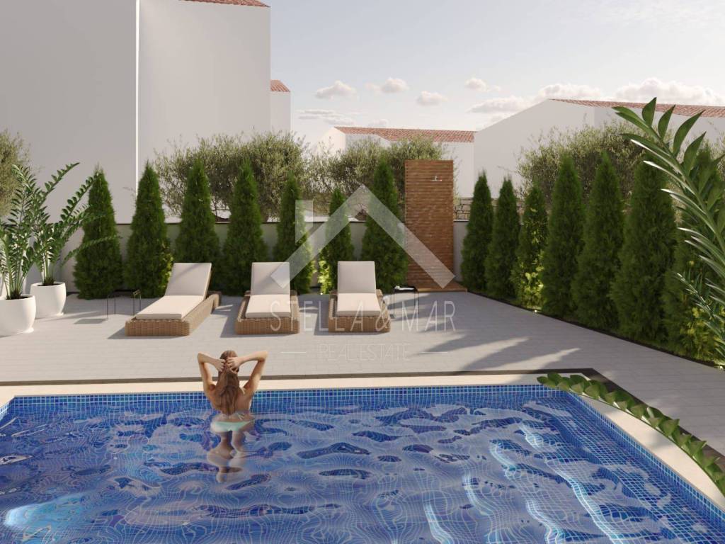 Luxury apartment for sale in a new building near the sea on the island of Vir. It is located in a row of smaller residential buildings, and extends over 3 floors. It also has a pool in the yard with an area of 11 m2. The property was built to a very high standard, according to the highest construction standards. The apartment is ideal for a peaceful and relaxing vacation. Also, an excellent investment for a tourist rental.