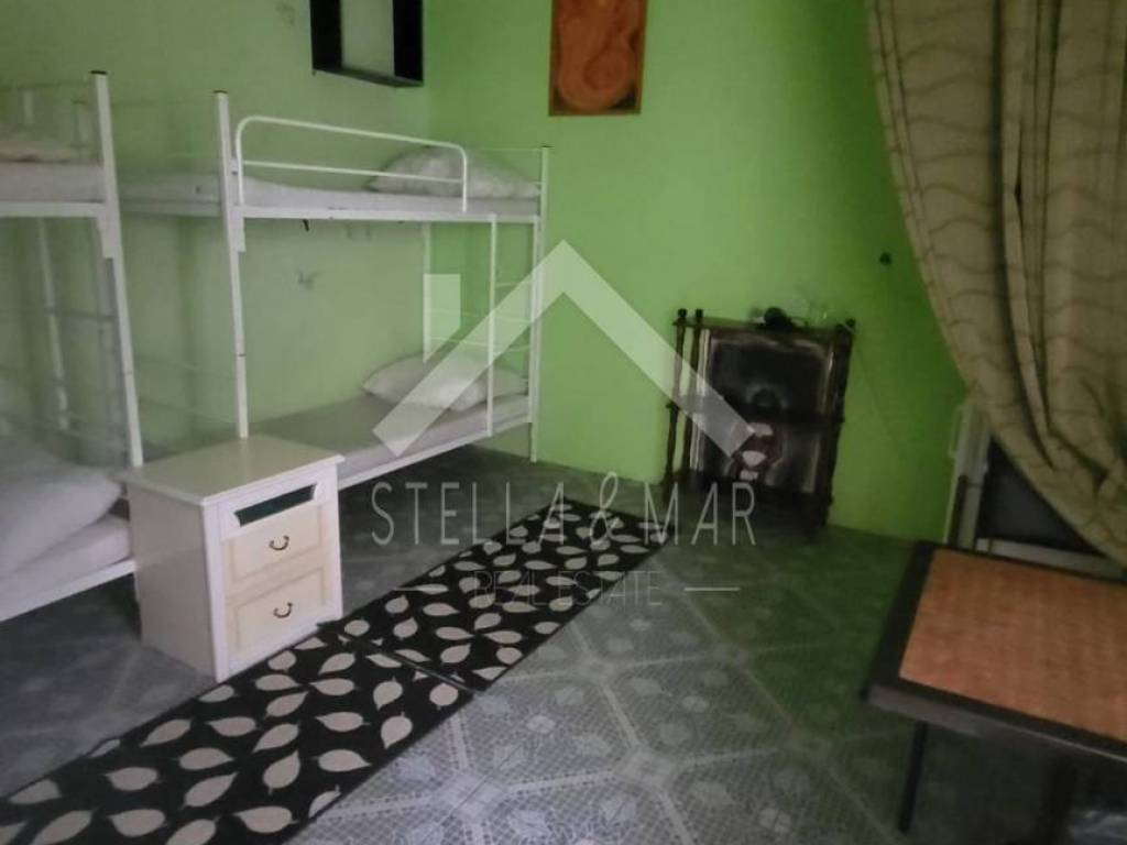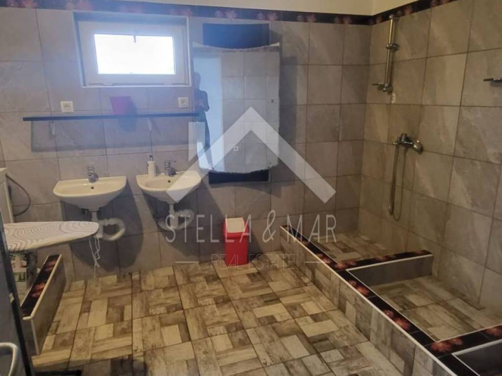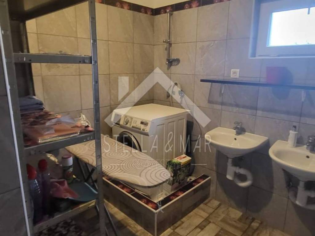 Sastoji se od spavaće sobe, kuhinje sa blagovaonicom, dnevnog boravka, hodnika, velike kupaonice + vešeraj, wc sa 3 sanitarna čvora. Također, kako smo prethodno naveli, 2 zatvorene terase. Prije no što su ga vlasnici preuredili u apartman, korišten je kao ugostiteljski objekt nekoliko godina.