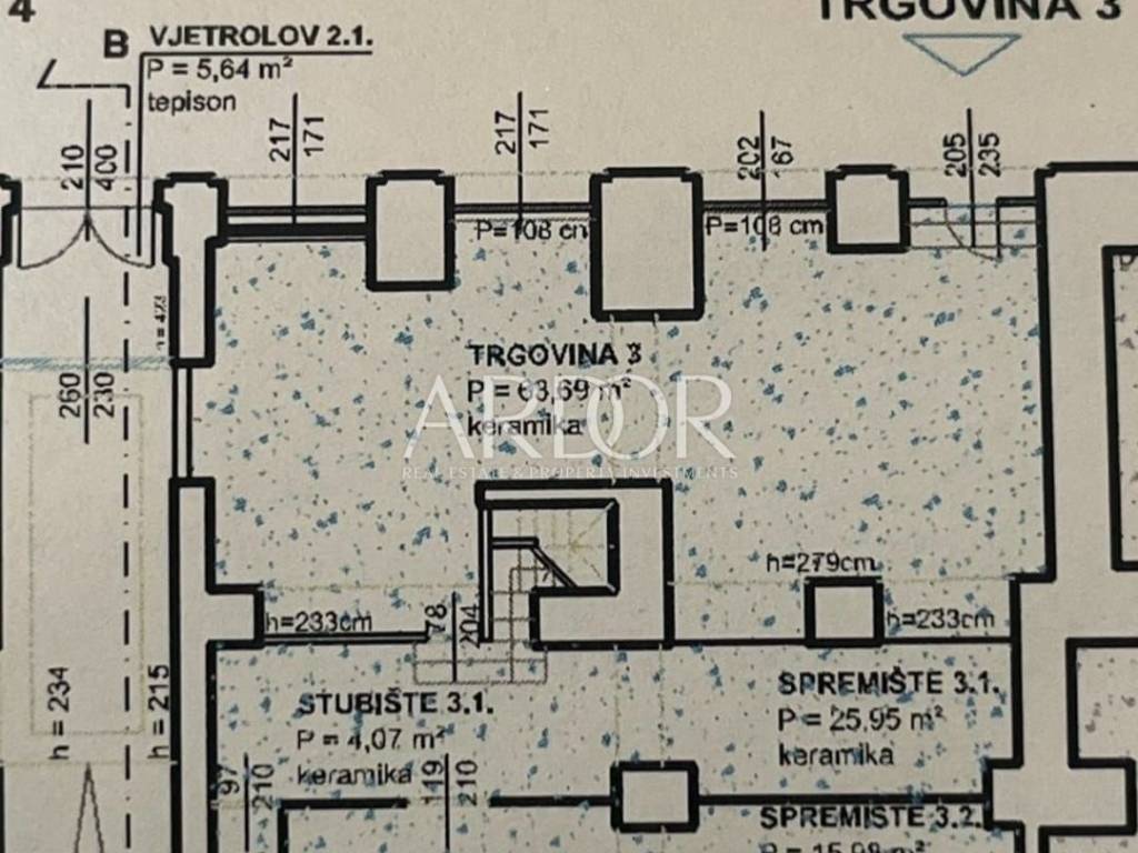 Dvoetažni poslovni prostor od 135m2 poslovnog prostora i 35m2 skladišnog ili uredskog prostora u strogom centru grada uz glavnu prometnicu nasuprot Korzu daje se u zakup. Prostor ima tri velika izloga s direktnim pogledom prema Korzu i mogućnost organizacije prostora u više dijelova.