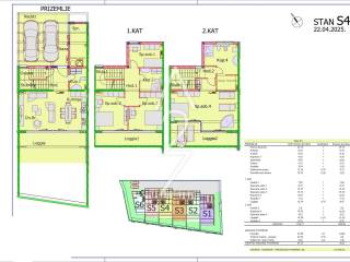 Residential unit S4 has a net living area of 217.98 m², consisting of a ground floor, first floor, and second floor, and includes a private yard and two covered parking spaces under a pergola. The apartment price ranges from €4,000 to €4,500 per m².