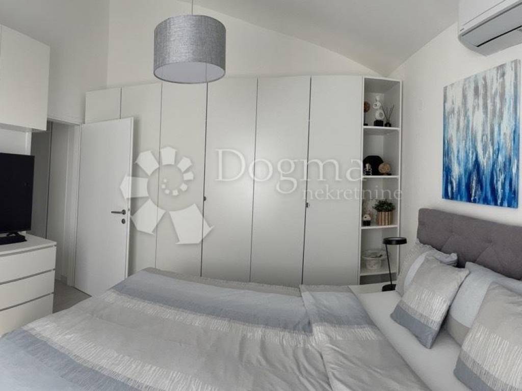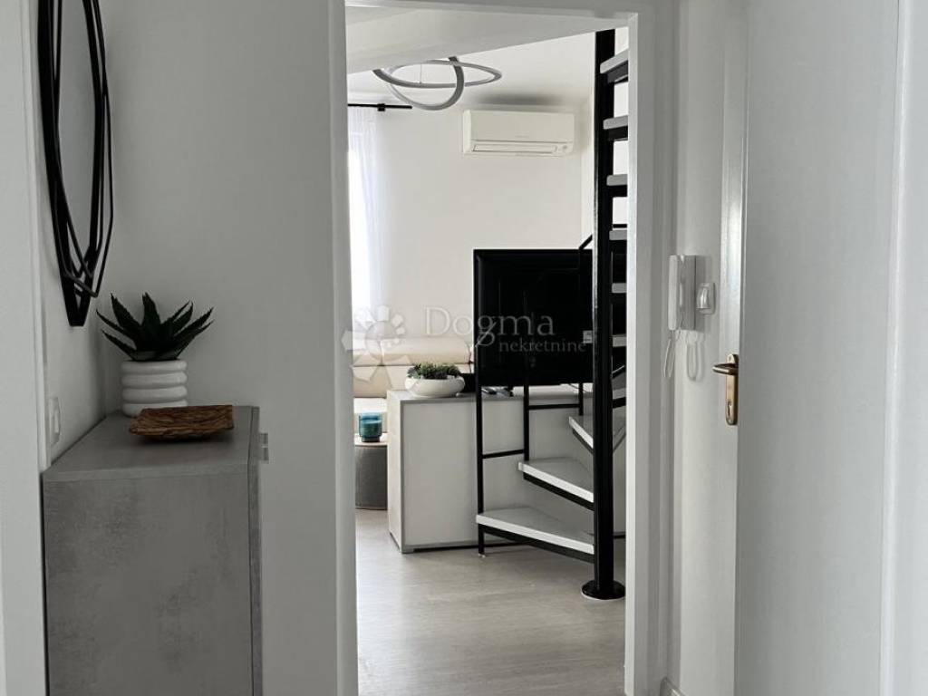 A modern, newly renovated apartment is for sale in Malinska on the island of Krk offering the perfect blend of functionality, aesthetics, and an attractive location. Situated on the second floor of an apartment building, the 47 m unit features a well-thought-out layout: entrance hallway, spacious bedroom, bathroom, kitchen, and living room with access to a covered balcony. The balcony provides an open sea view, making this property particularly desirable. An internal staircase leads to a gallery with an additional bedroom, increasing the total usable space to 65 m.