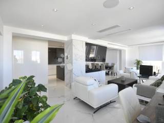 The open-plan living and dining area, joined by a marble-clad fireplace, welcomes light and sea through large windows and French doors. The kitchen, equipped with top-of-the-line Miele and Liebherr appliances and quartz worktops, is the heart of the home designed for beauty and function, where mornings begin with coffee and evenings end with wine and sea views.
