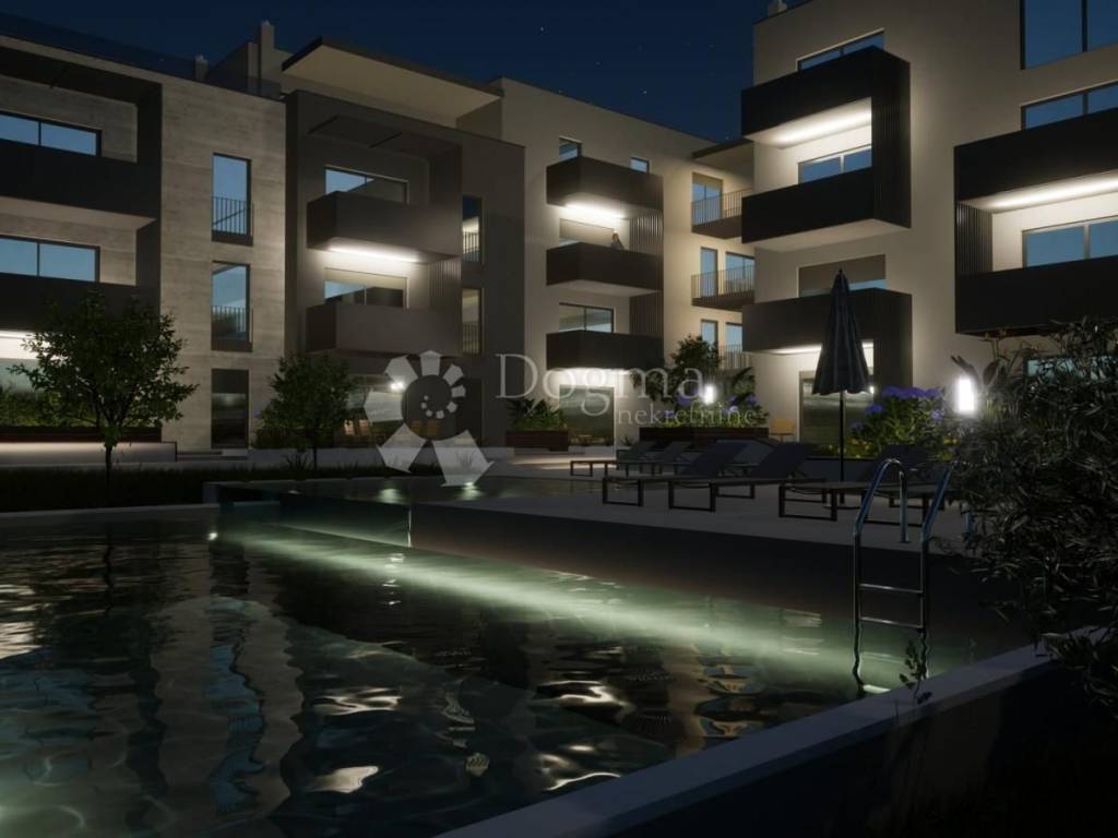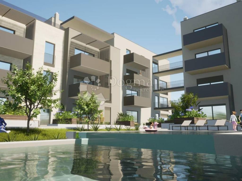 POREČ (surroundings) Luxurious apartment with garden, swimming pool and garage In the vicinity of Poreč, construction of an exclusive residential complex consisting of 26 apartments in 2 buildings with 13 residential units each is underway. This exclusive apartment number 10 is for sale on the 2nd floor of a modern residential building with a swimming pool. This apartment of 84.73m2 consists of a hallway, living room and dining room, kitchen, 3 bedrooms, bathroom, guest toilet and a spacious balcony of 7.20m2. The terrace offers a beautiful view of nature. There is a huge communal swimming pool in the courtyard, and a separate pool for children. The apartments have air conditioning and underfloor heating throughout except in the bedrooms. The building has an elevator and is adapted for the disabled. Each apartment has one parking space and one garage space of 25m2. The buildings will be made of top-quality materials and are being built by a proven investor. The price is stated with VAT included. For all information and viewing, please contact Marija Šantor Licensed agent Mob. 0922827379 marija.santor@dogma-nekretnine.com