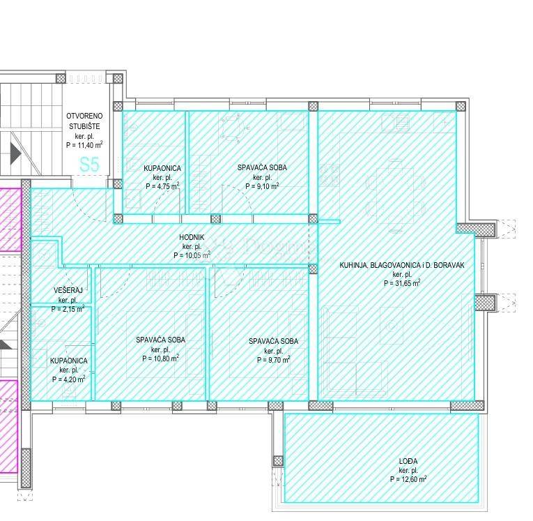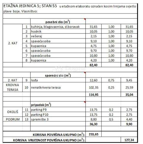 It consists of a hallway, kitchen, dining and living room, three bedrooms, a laundry room, and two bathrooms. The apartment has a large loggia of 12.60m, a storage room of 8.80m, and two parking spaces. The apartment also includes a spacious rooftop terrace of 102.35m with a panoramic sea view.