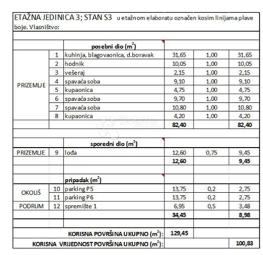 It consists of a hallway, kitchen, dining and living room, three bedrooms, two bathrooms, and a laundry room. The apartment has a large loggia of 12.60m, a spacious storage room of 6.95m, and two parking spaces.