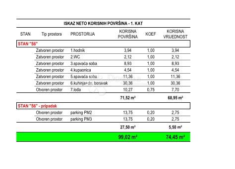 In Ričine, in a quiet part of Zadar, close to schools, shops, kindergartens and public transport, there is a modern building with high energy efficiency and top-quality construction. The microlocation is a top position in a well-maintained street with newer construction and neat parking. Apartment S6 on the first floor offers two bedrooms, a living room connected to the kitchen, a bathroom, a separate toilet and a hallway. The calculated net usable area of the apartment with its accessories is 74.45 m2. The closed residential part consists of a living room with a kitchen of 30.36 m2, bedrooms of 11.36 m2 and 8.93 m2, a bathroom of 4.54 m2, a separate toilet of 2.12 m2 and a hallway of 3.94 m2. The apartment has a loggia of 10.27 m2 and two parking spaces PM2 and PM3 of 13.75 m2 each.