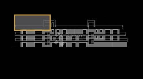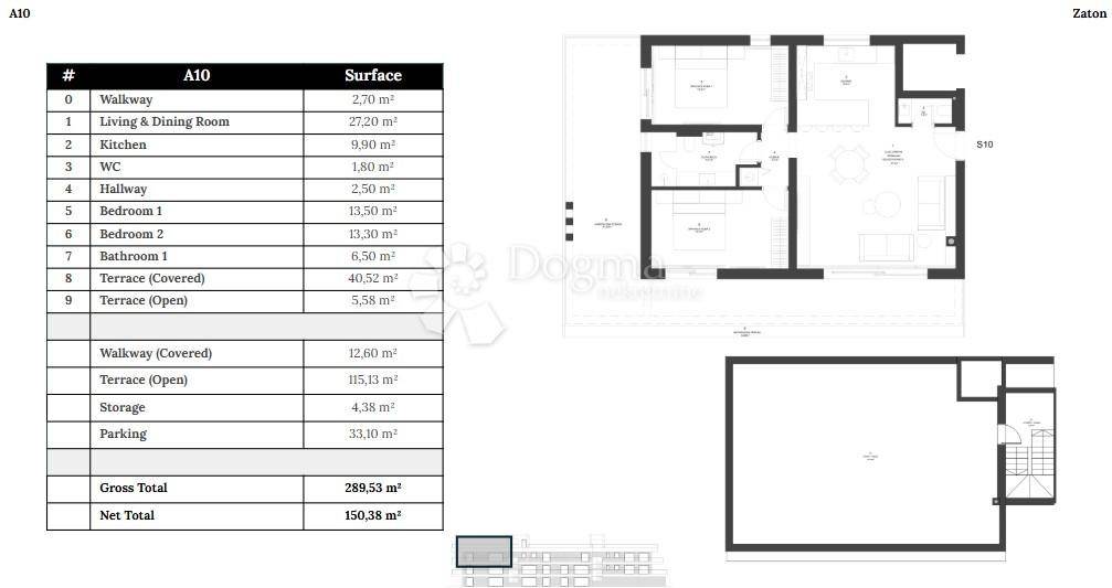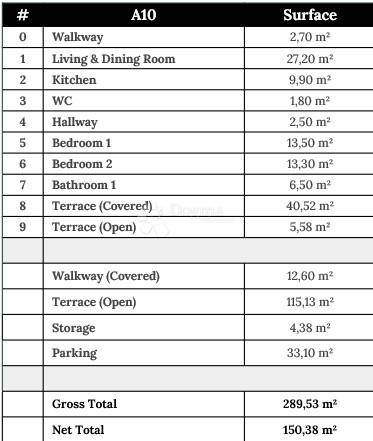 Apartment A10 is a duplex penthouse with 150.38 m of net living space. The lower level offers a bright 27 m living and dining area, a 9.9 m kitchen, two bedrooms, a bathroom, and an additional WC. A 40.5 m covered terrace extends the living area outdoors, accompanied by a smaller open terrace.