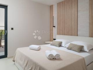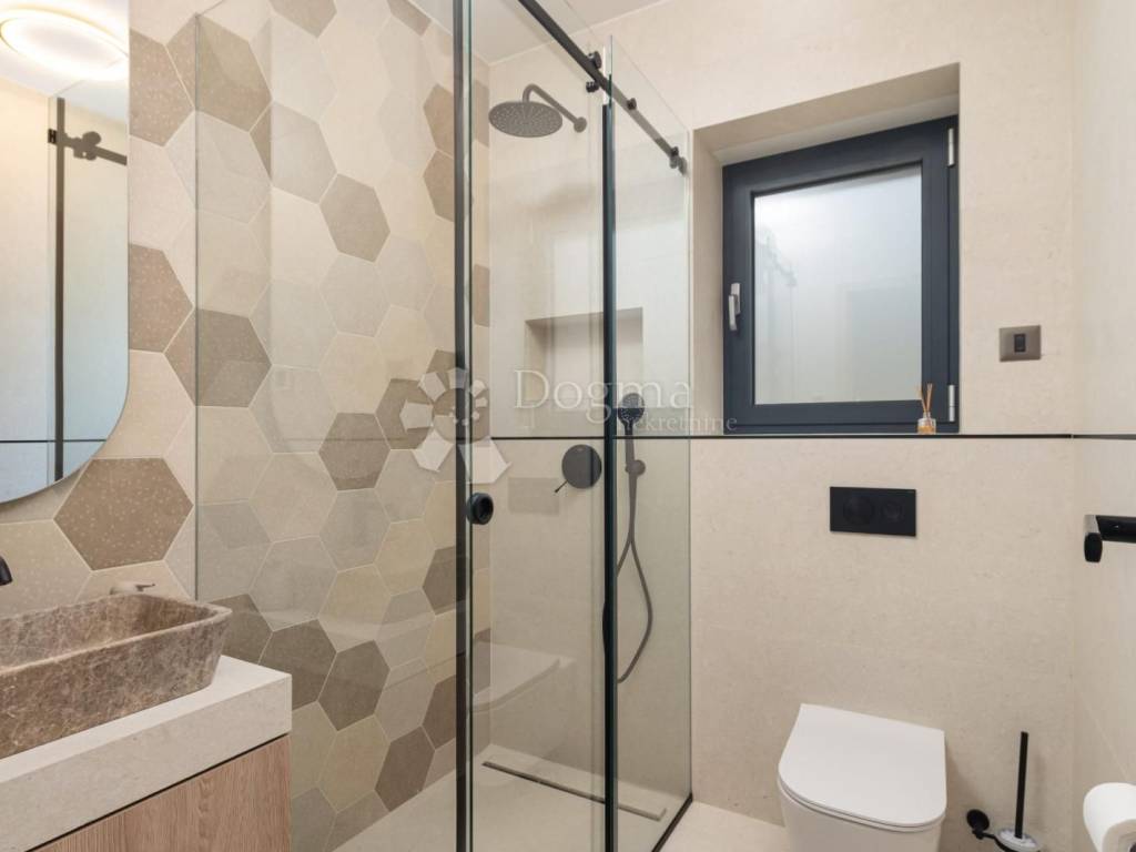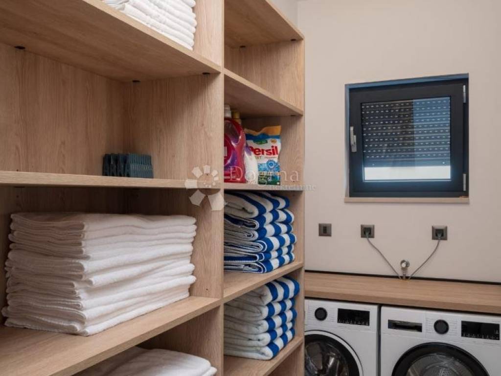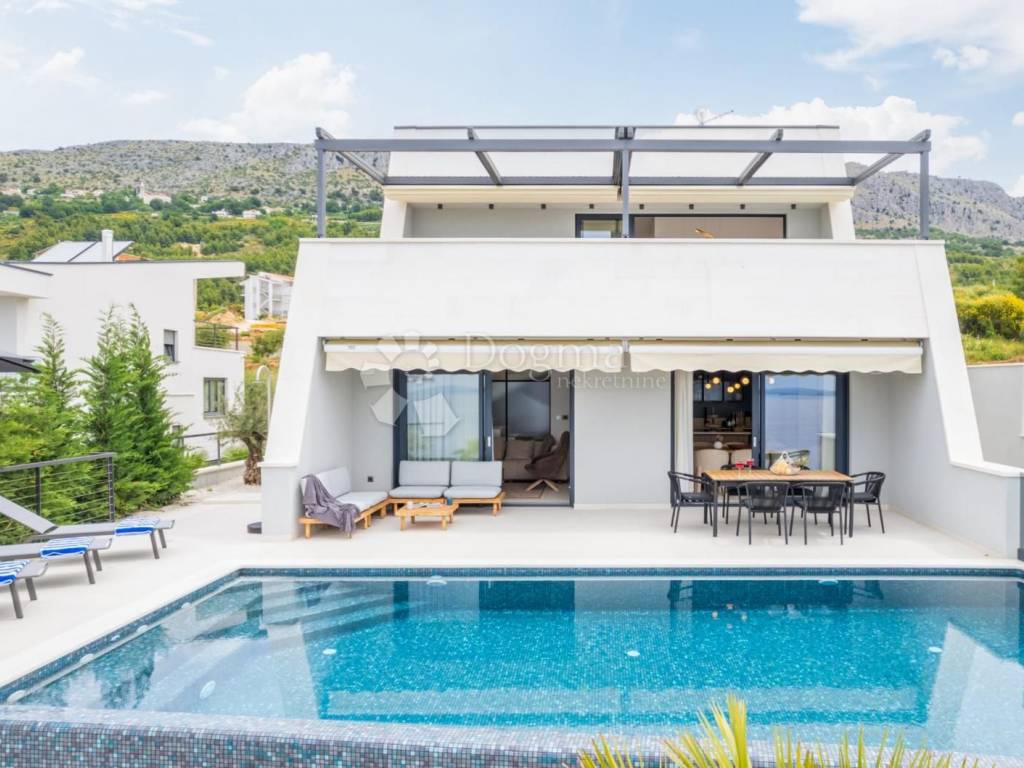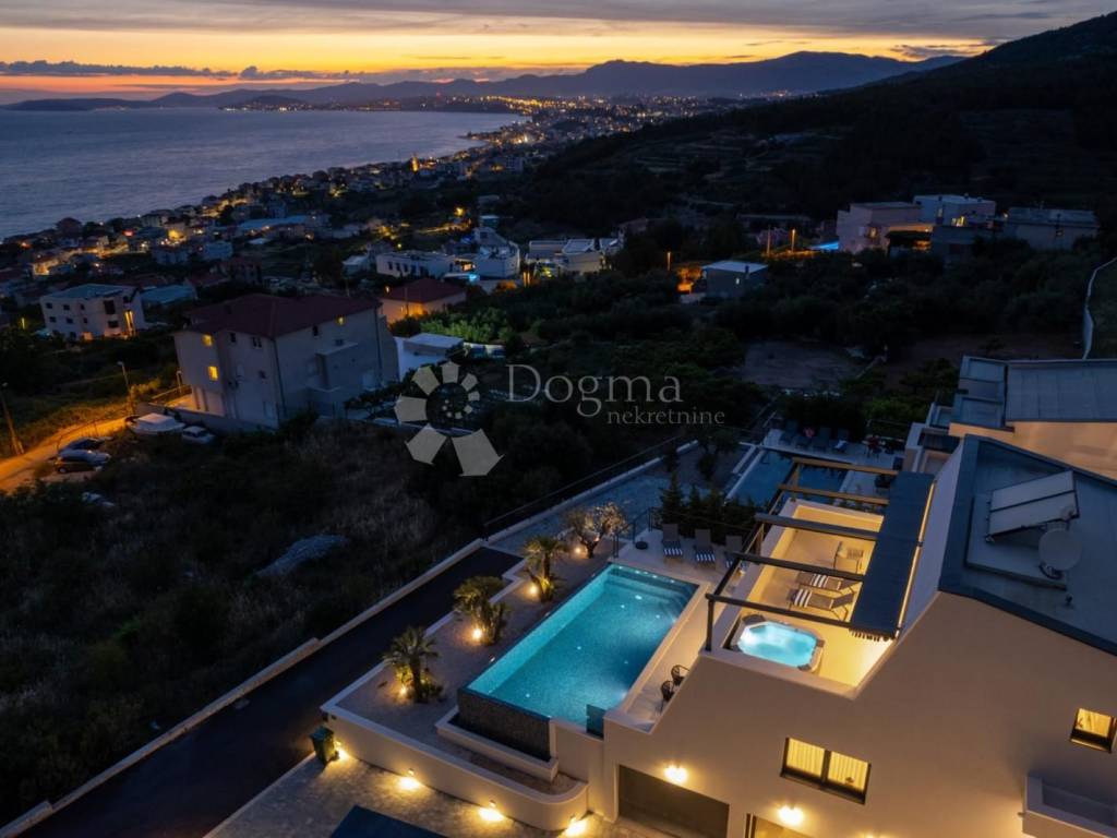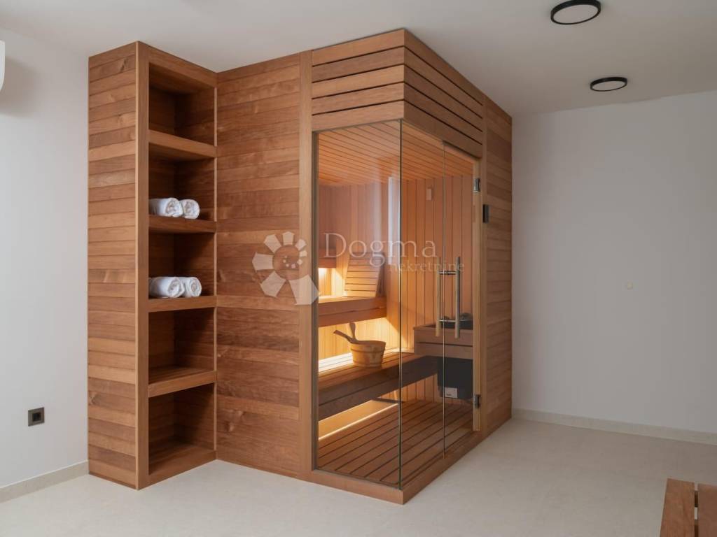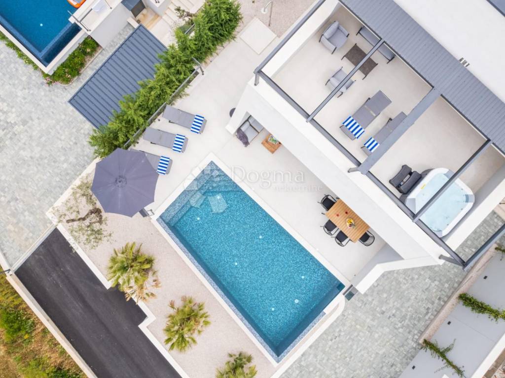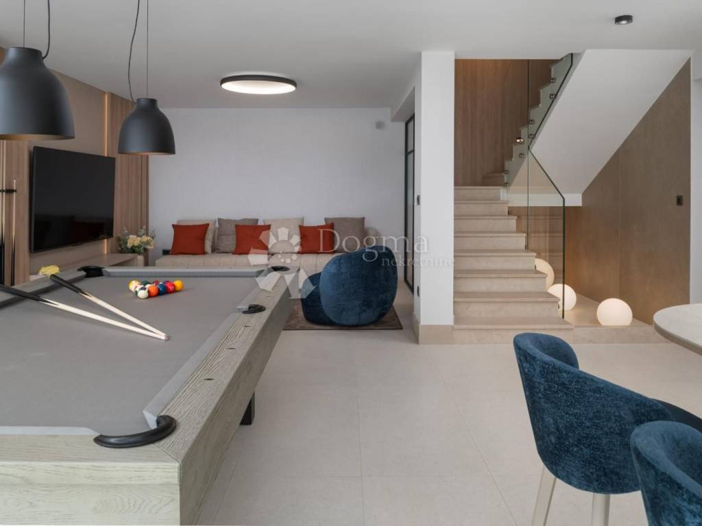 and for sale is an exclusive luxury villa situated in an elevated position with a beautiful panoramic sea view. The villa is located within a prestigious complex of modernly designed villas, providing a high standard of living, complete privacy and a peaceful atmosphere. Basic features: Land area: 620 m Living area: 300 m Number of floors: three basement, ground floor and first floor Space layout Basement: The basement is designed as a zone for relaxation and entertainment. It contains a spacious garage for two cars, a storage room, a wellness area with a sauna and jacuzzi, a home cinema, billiards and a fully equipped kitchen with an elegant bar. Ground floor: The ground floor consists of a spacious open-space living area that combines the kitchen, dining room and living room, creating the perfect space for socializing and family gatherings. On this floor there is also a master bedroom with its own luxurious bathroom. Large glass walls allow plenty of natural light and water directly into the landscaped courtyard with a swimming pool, creating a perfect connection between the interior and exterior. Floor: On the first floor there are three elegantly decorated bedrooms, each with its own bathroom, providing complete privacy and comfort. Additional information Only the highest quality materials were used in the construction of the villa, and the interior is fully equipped and furnished with luxurious furniture from renowned Italian brands. The villa stands out with its modern architecture, top functionality and impressive views of the surrounding nature. This property offers the perfect balance of luxury, comfort and privacy, ideal for those seeking an elegant and sophisticated lifestyle on the Adriatic.
