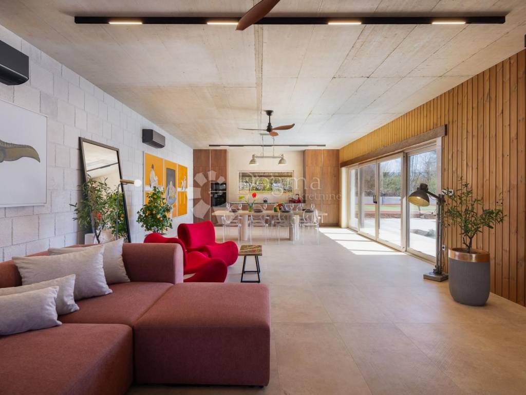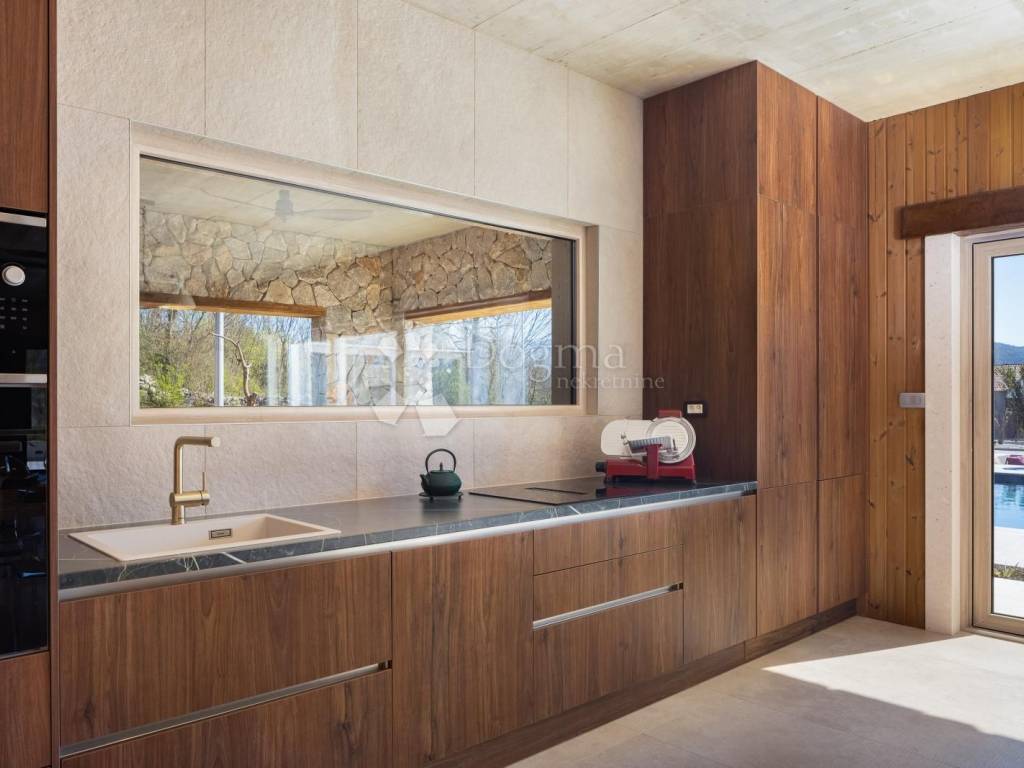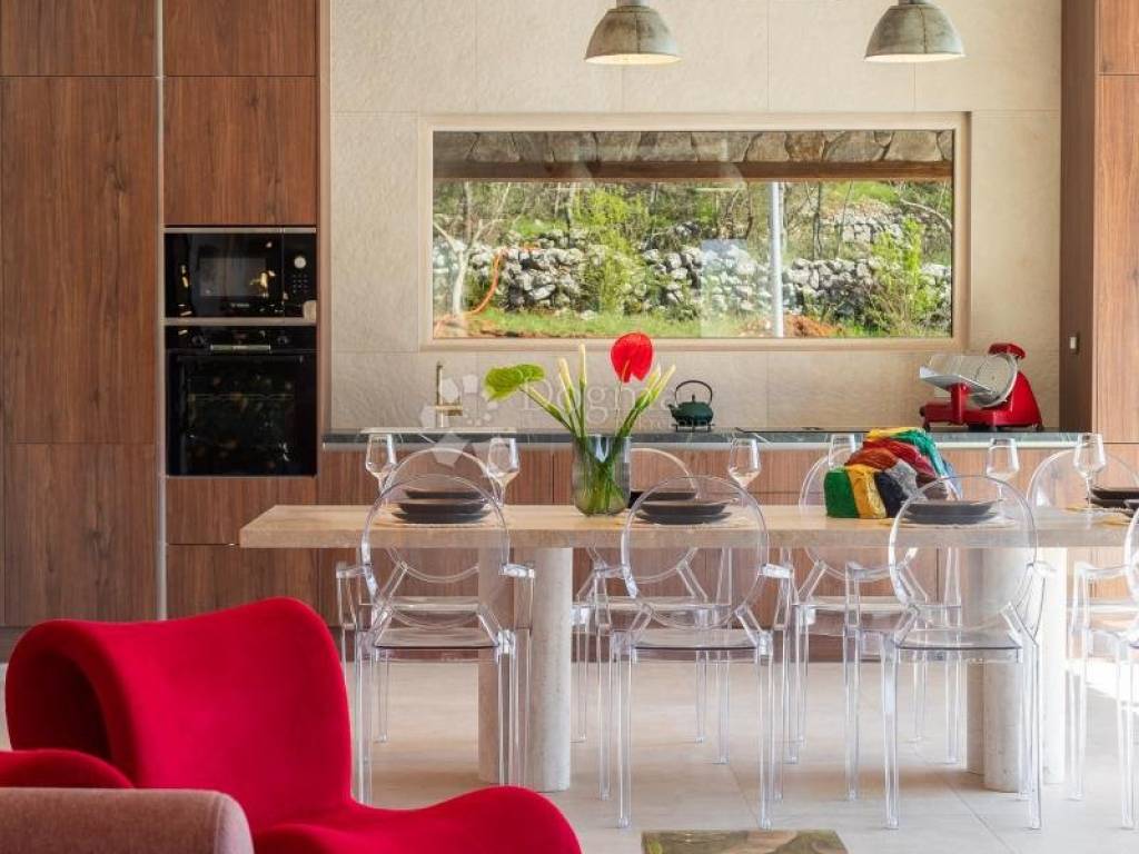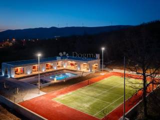 On a spacious plot of almost 3,000 m, surrounded by olive trees, there is a newly built villa that provides a perfect balance between seclusion and proximity to the city. The villa covers 240 m and is a combination of modern and traditional Dalmatian style. Glass walls connect the modern kitchen and dining room and the spacious living room with the outdoor terrace. Everything is equipped with top-quality furniture and artwork, and attention was paid to every detail: the house is fully air-conditioned, and has underfloor heating with the possibility of adjusting it by room. The villa also has four bedrooms with private bathrooms and access to a large covered terrace of 250 m, covered with natural stone, where there is a heated pool of 45 m with sun loungers, an outdoor shower with hot water and a Serbian toilet. Next to the pool there is also an outdoor kitchen with a grill, ideal for outdoor dinners. A private tennis court with artificial grass additionally contributes to the impression of luxury, as well as a landscaped garden with an automatic irrigation system, and the entire plot is walled with a forged fence with a remote-controlled gate. This villa is not only a peaceful oasis to escape from everyday life, but also an excellent investment with high potential for tourist rental. Whether you are looking for a vacation home, permanent residence or a business opportunity, this property offers a unique combination of natural beauty, privacy and supreme comfort, all about 20 km from Split and the Adriatic coast.