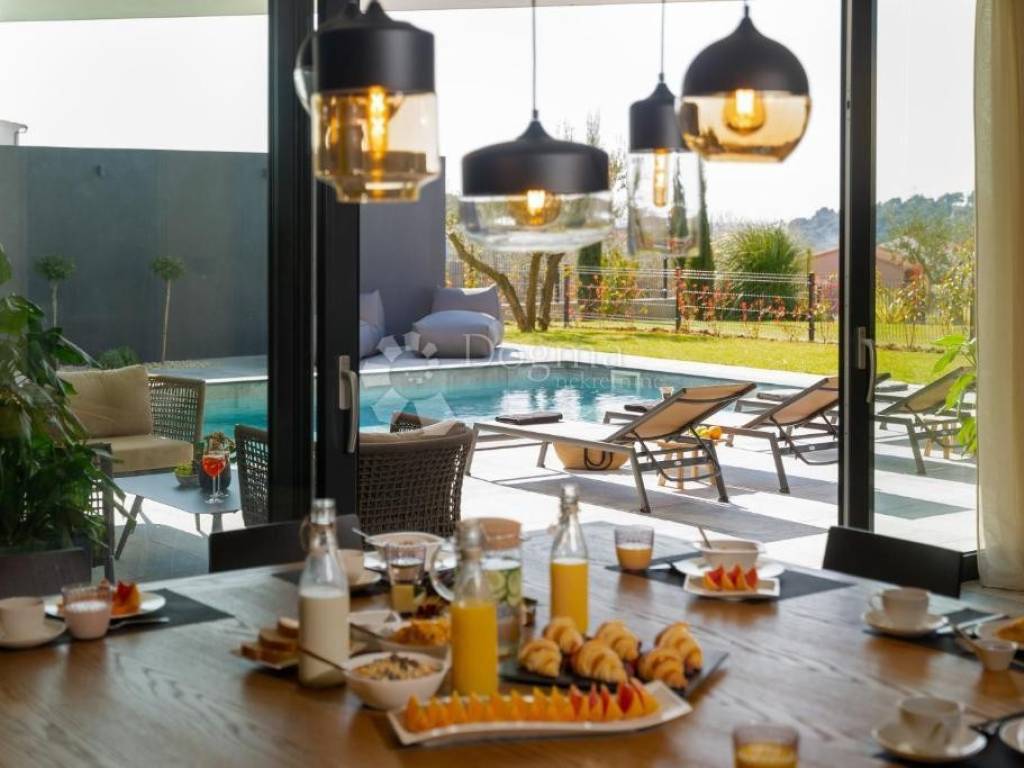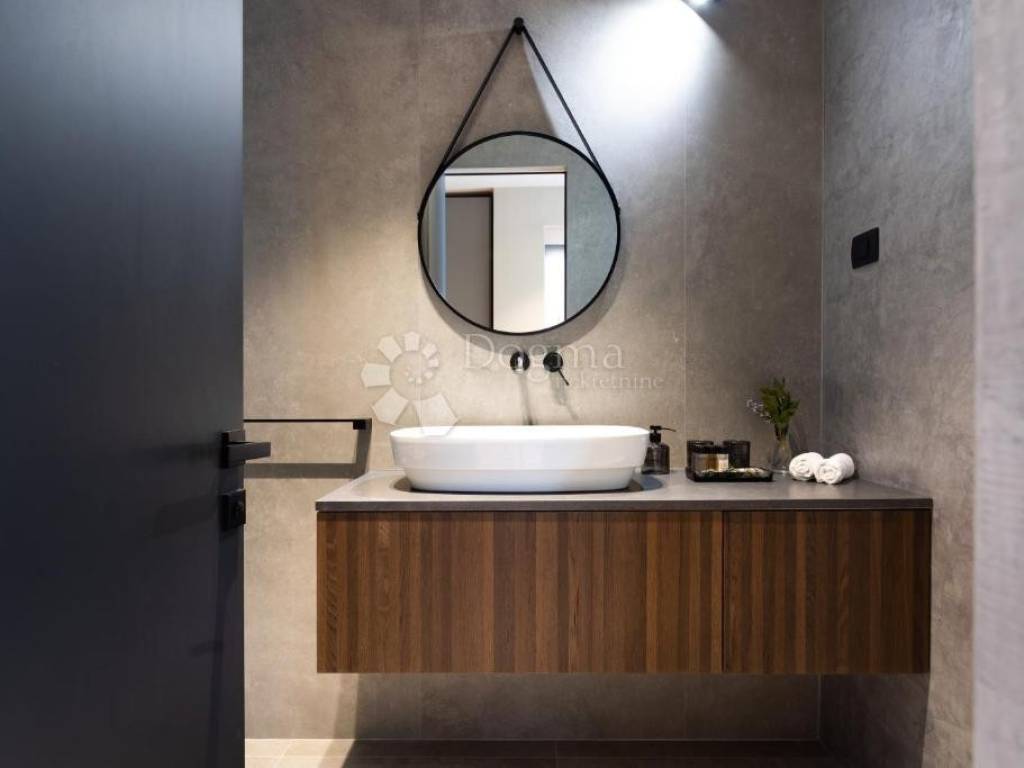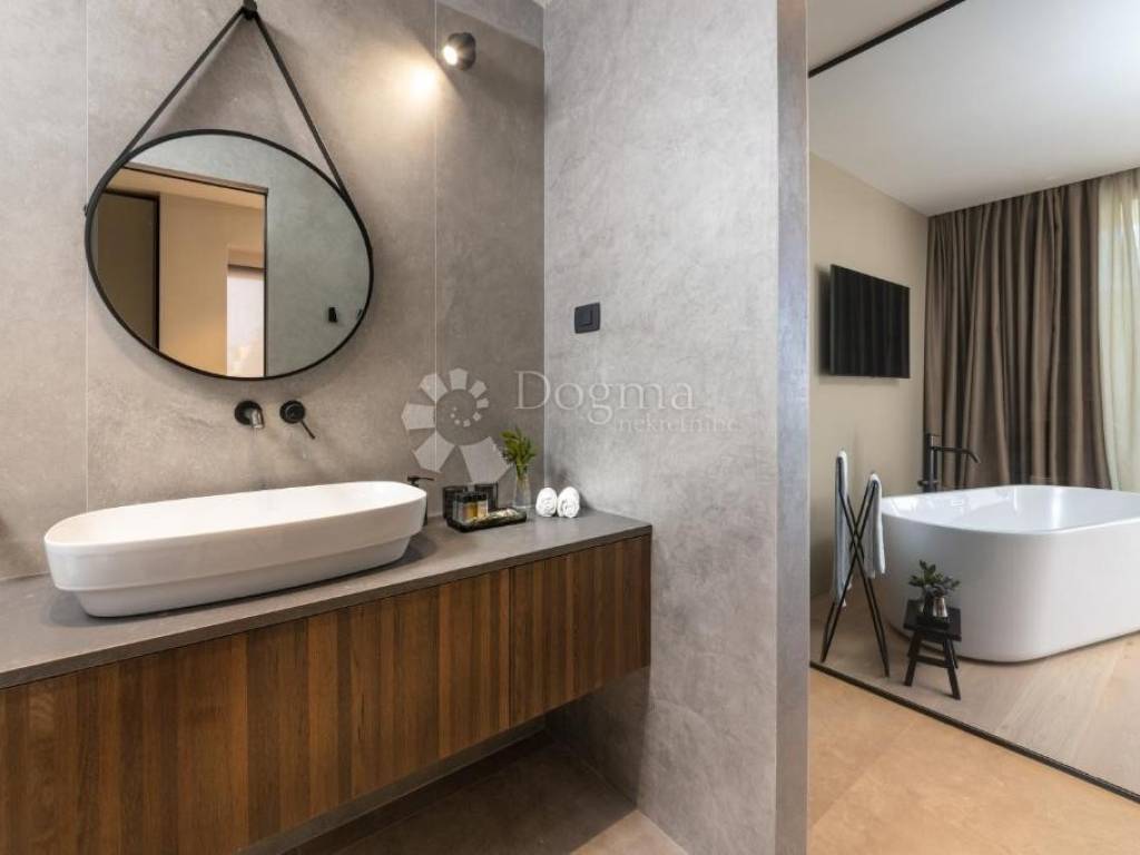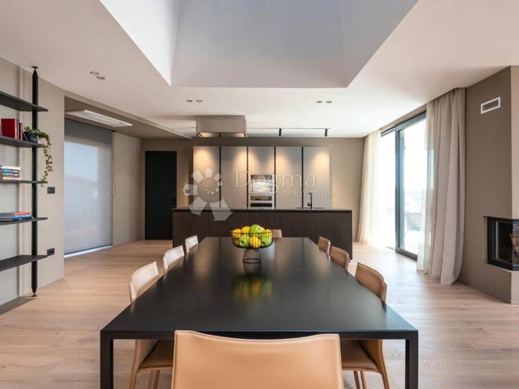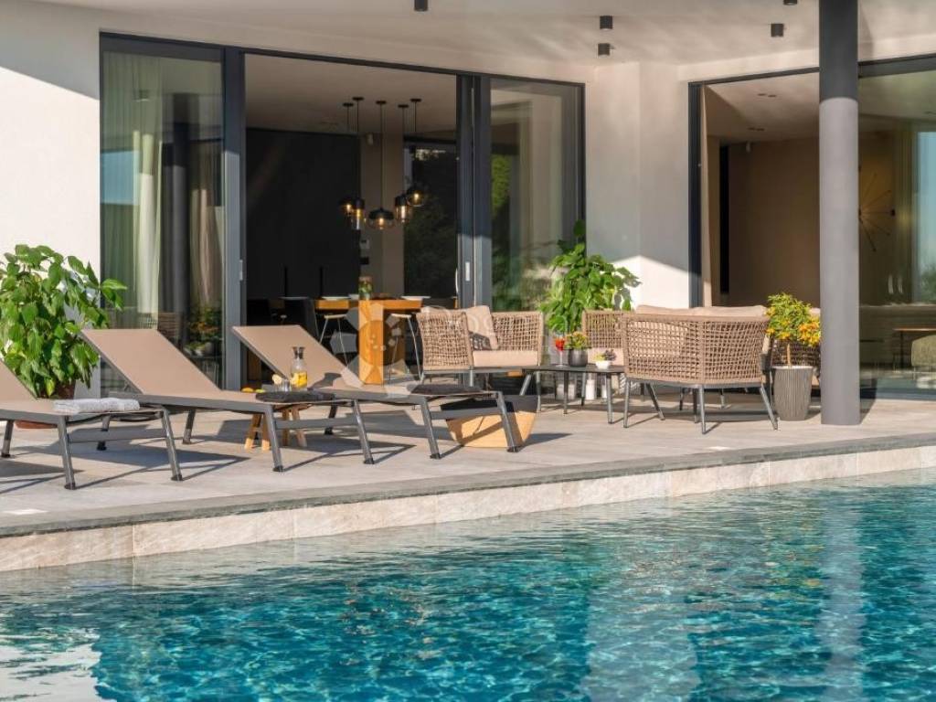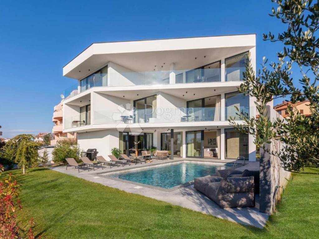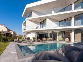 A luxury villa with unique architecture and excellent position. The villa is located in Pula, in a quiet area in a prime location with an open view of the Brijuni Islands. It has an area of 568m2 and consists of five bedrooms, each with its own balcony and bathroom, two large living rooms and two kitchens with dining rooms. The exterior of the house is equipped with a luxurious swimming pool and a space for sunbathing and enjoying the landscaped garden with a jacuzzi and sauna. The villa also has a beautiful landscaped roof terrace. The interior and exterior were designed by a famous designer, and the entire villa is equipped with only the best materials, top-quality furniture and other top-quality equipment. For more information or to arrange a viewing, please feel free to contact us! M: +385 91 732 5577