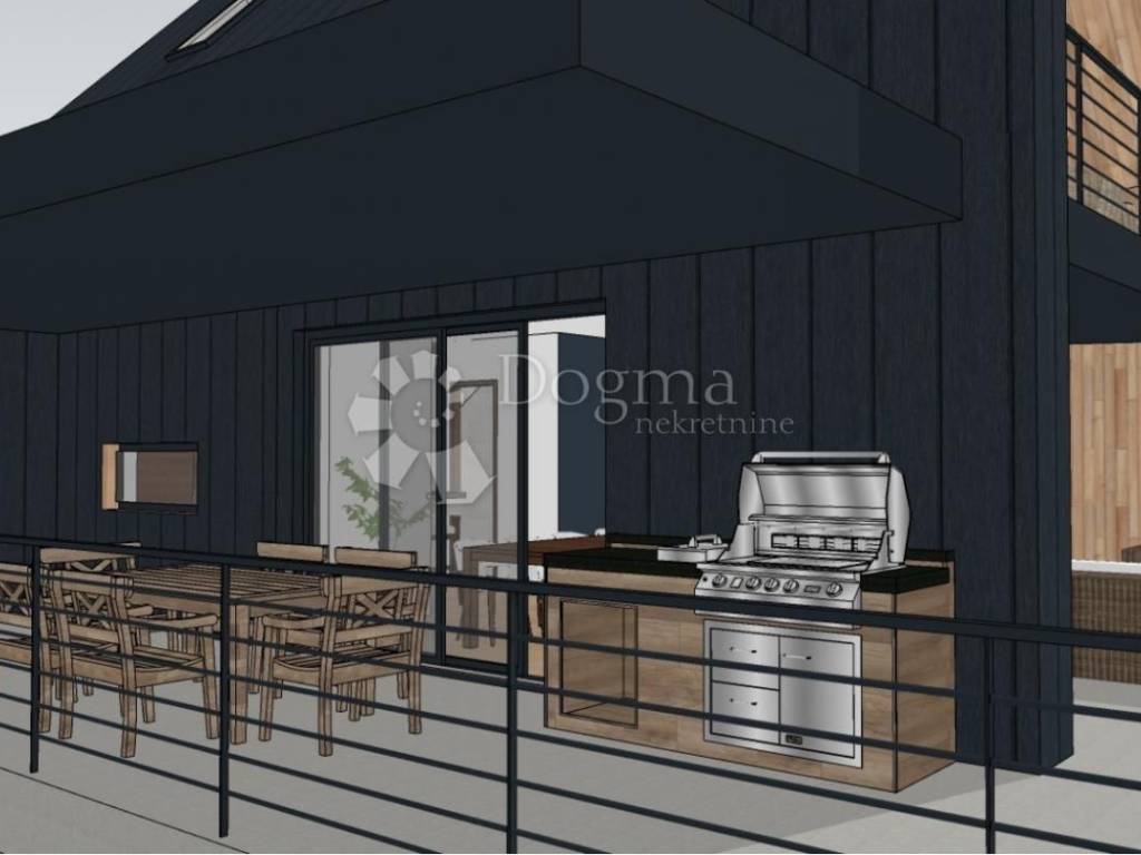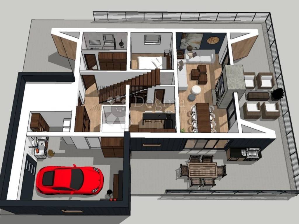 Prodajemo veliko zemljište sa idejnim projektom za obiteljsku kuću. Nekretnina bi bila koncipirana kao P+1. U prizemnom dijelu je zamišljena kuhinja i veliki dnevni dio, kupaonica, spavaća soba, velika terasa sa vanjskom kuhinjom, te garažom iz koje bi se ulazilo u stambeni dio. Na katu bi bile još tri sobe sa kupaonicom i natkrivenim balkonom.