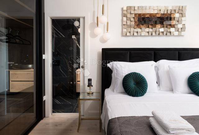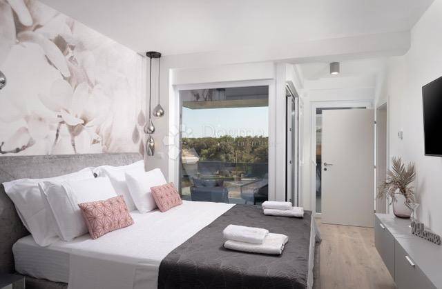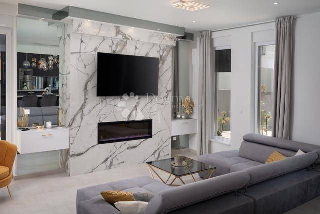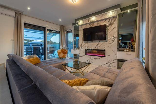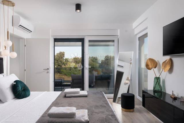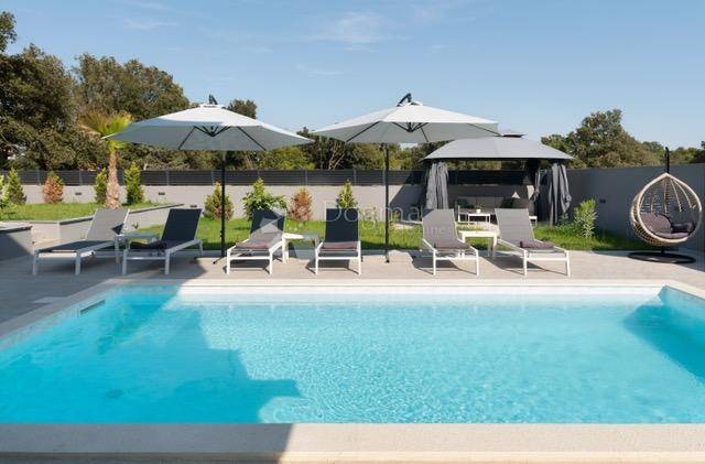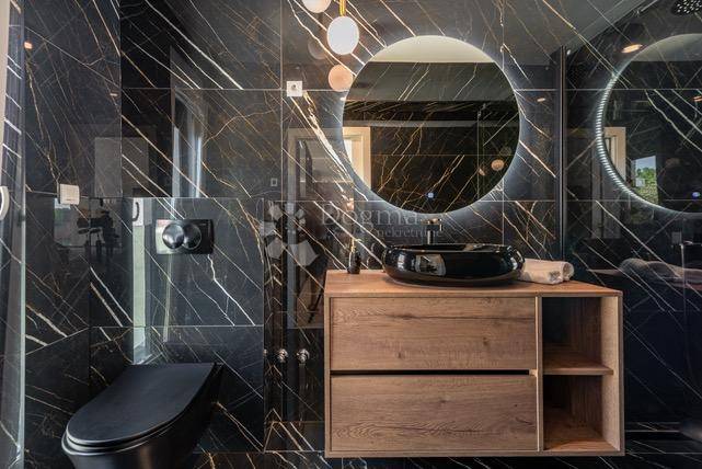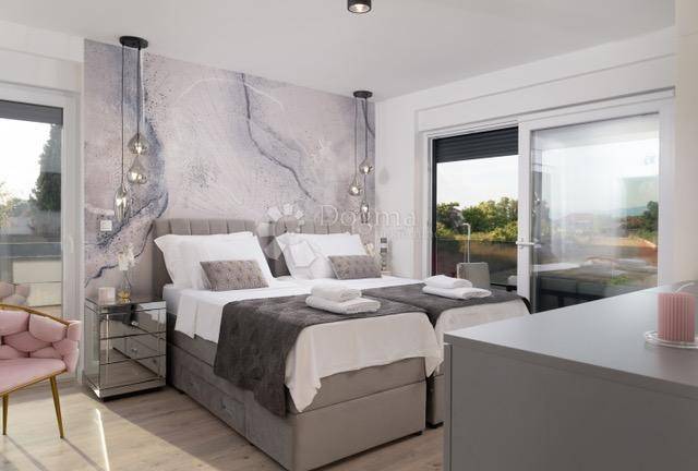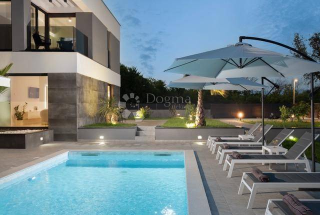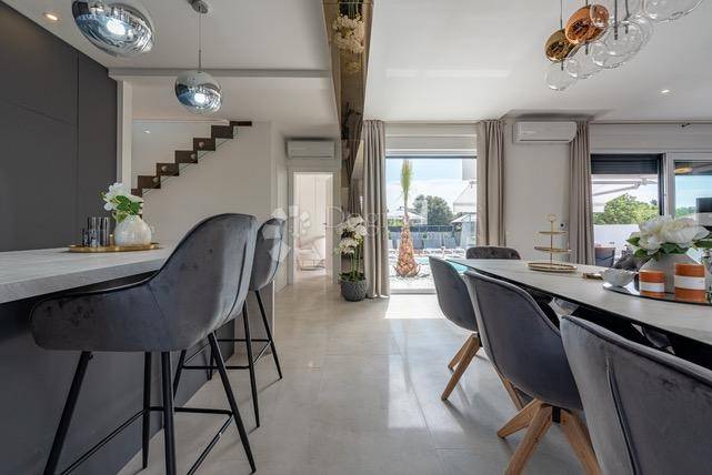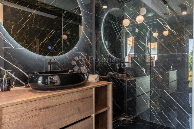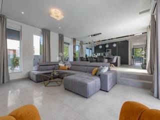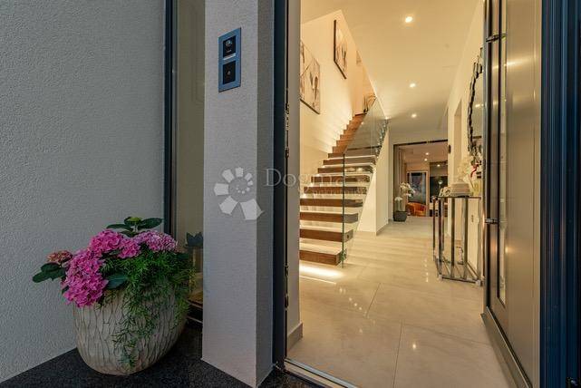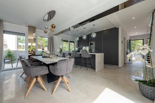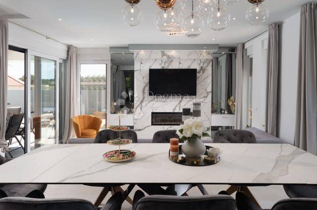 A luxury house for sale in the peaceful and picturesque Zaton, located just 500 meters from the sea. This impressive 220 m2 villa is spread over two floors, each 110 m2, and every detail has been approached with care and elegance, creating the perfect blend of comfort, privacy and modern design. The house is spread over a 750 m2 plot, which features a swimming pool, barbecue, gazebo, terrace and several parking spaces. The open-plan living room, kitchen and dining area, located on the ground floor, is perfectly connected to the outdoor terrace, creating a flawless environment for family gatherings or pleasant socializing with friends. The first floor consists of 4 bedrooms, each with its own bathroom, which allows for maximum privacy and comfort. A spacious terrace with a large dining table, a 30 m2 heated swimming pool, a gazebo and a poolside barbecue provide the perfect setting for relaxation and enjoyment of the Mediterranean climate. A landscaped garden with palm trees, Mediterranean plants and a children's area offers a peaceful and relaxing atmosphere. The villa is equipped with modern, designer furniture, including luxurious chandeliers by Cattelan and a handmade ceramic table. Each room exudes luxury and carefully selected details that make this property special. The glass walls of the living room allow for plenty of natural light and an impeccable view of the environment, while outdoor lighting on photovoltaics creates a romantic atmosphere at night. Underfloor heating with heat pumps and air-conditioned spaces guarantee comfort throughout the year. The project plans to build a gym with a pool table of 20 m2, providing space for relaxation and an active lifestyle. The villa is located in a quiet, private location that offers complete privacy, while at the same time being close to the historic towns of Nin and Zadar, which allows you to access all the necessary amenities, restaurants, shops and cultural attractions. This villa is ideal for all those looking for luxury, comfort and privacy. Enjoy the silence, peace and privacy while being close to all the beauties of the Adriatic coast. Contact us for more information and to arrange a viewing of this luxurious villa. Silvija Galić +385 98 797 144