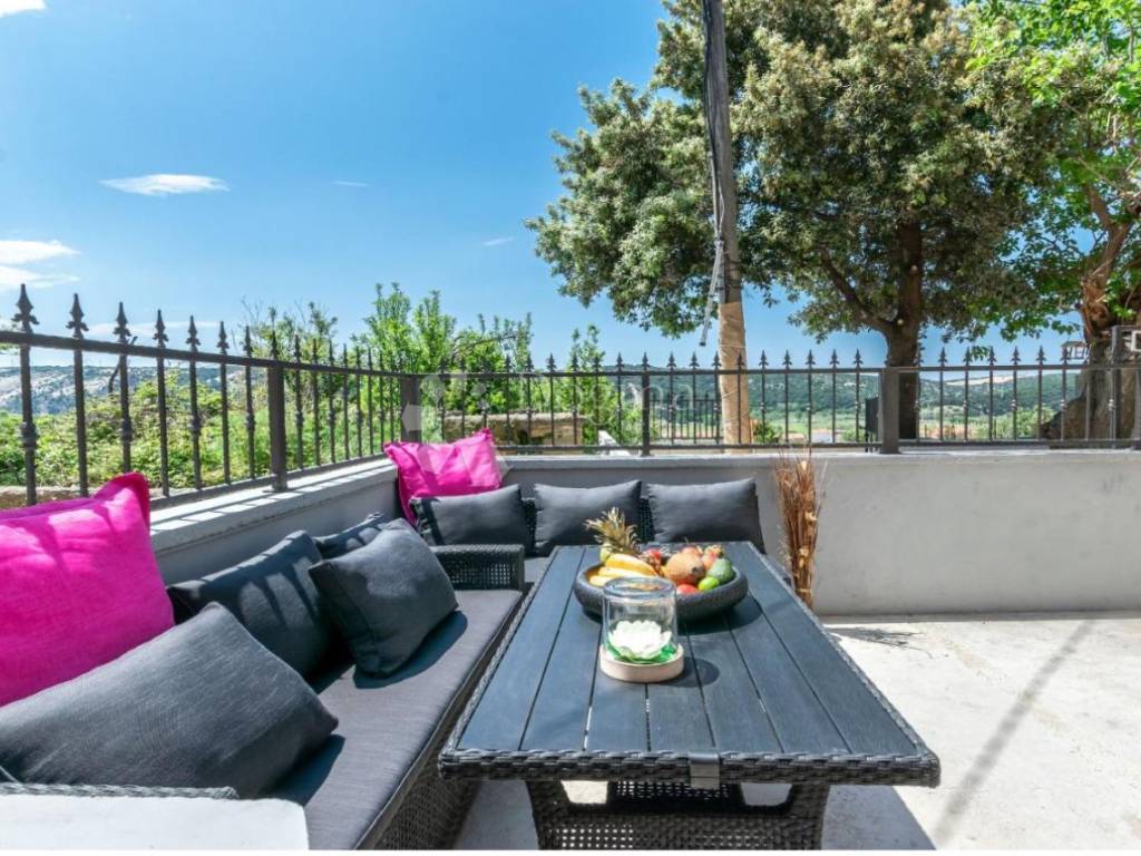 The house is equipped with air conditioners on each floor, high-quality PVC windows with mosquito nets and Mediterranean blue shutters, a functional chimney with a wood stove, and a video surveillance system. It also features two enclosed yards 34 m in front of the house with a working well, and a 150 m garden with electricity and water connections. There is great potential for further development, including the possibility of adding a pool and barbecue area. An outdoor shower is already installed.