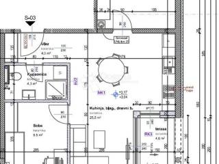 Apartment S3 has a total area of 61.60 m and is located on the first floor of the building. It consists of two bedrooms, a living room with a dining area and kitchen, a bathroom, a hallway, and a terrace. From the hallway, you access the living room, and from the living room, you exit onto the terrace.