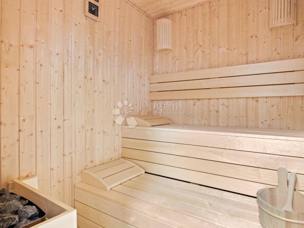 For added comfort, the villa is equipped with air conditioning units that provide heating and cooling throughout the year. A special feature of this property is the large sauna, which offers a perfect place for relaxation and rejuvenation, ideal after a long day or during the colder months.