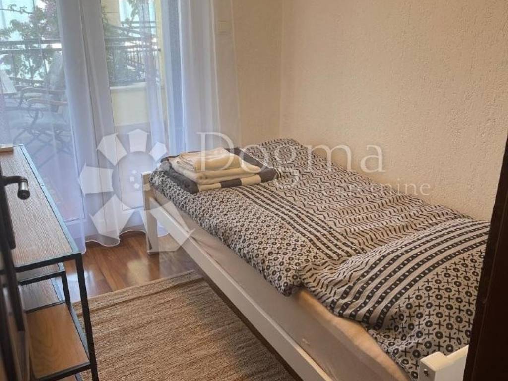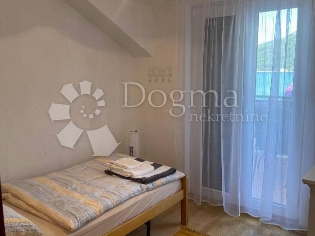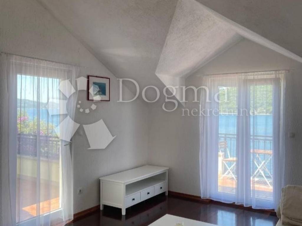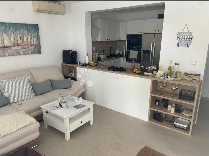 There are two identical apartments on the first and second floor. Each apartment has a spacious living area consisting of a kitchen and a living room connected into one unit, which continues to the terrace with a spectacular view of the sea. There are also two smaller and one larger bedroom and a bathroom. All rooms have their own air conditioning