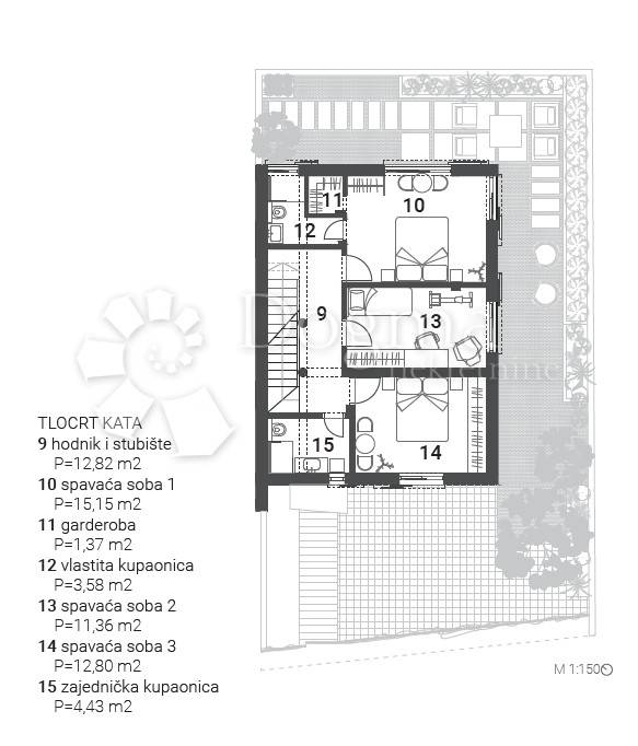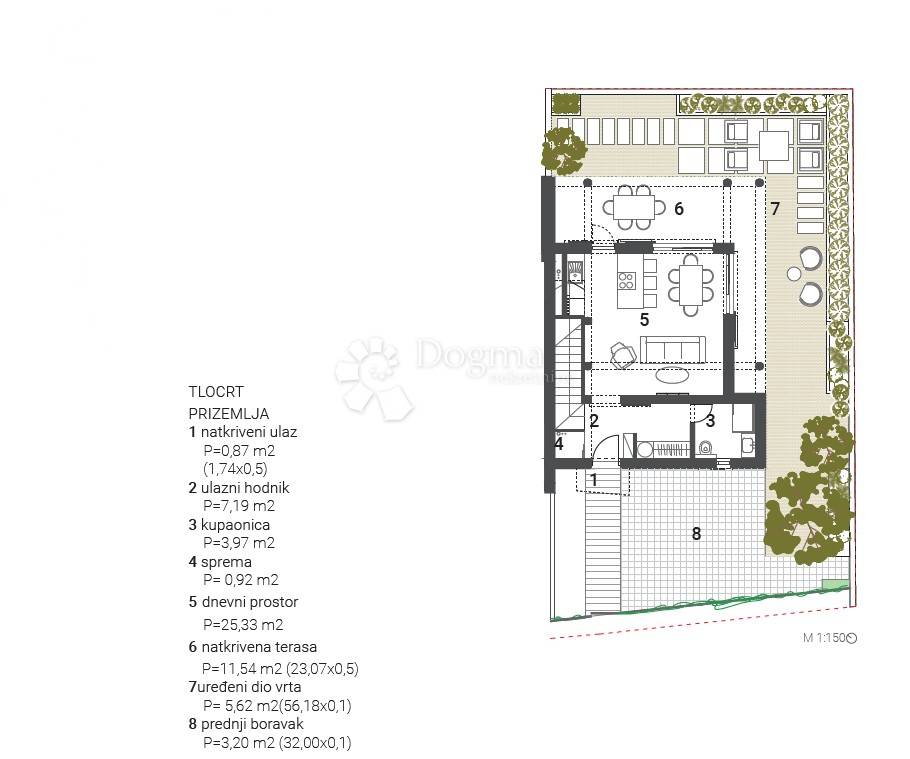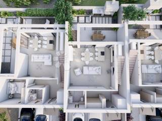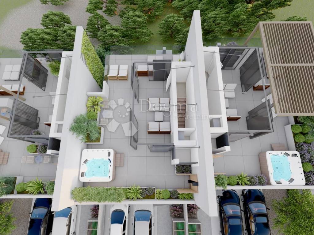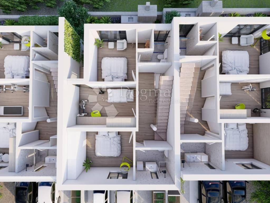 The building consists of three residential units arranged next to each other, and they are staggered in plan and height. The units are cascaded relative to the sloping terrain. The impression of row houses is achieved by plan and height displacement. Each residential unit has its privacy in the gardens on the ground floor as well as on the roof terraces, achieved by building walls between the gardens of individual units, as well as walls between the roof terraces. Sales are based on the "turnkey" model, implying fully equipped bathrooms, outdoor lighting, surroundings with preparation for planting plants, preparation for irrigation, wired preparation for video surveillance, water supply, electricity, drainage to the yard (for barbecue, smaller storage needs), preparation for a jacuzzi or small pool on the roof terraces, aluminum pergola, wired internet and satellite connection in each room, electric underfloor heating on the ground floor and all bathrooms (WiFi remote control), air conditioning with heating and cooling in each room (WiFi remote control), all switches and sockets, and preparation at positions for indoor lighting.