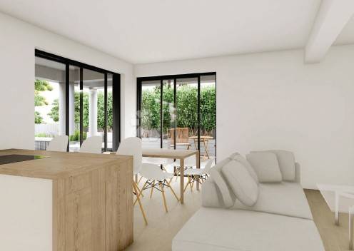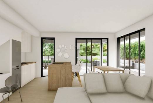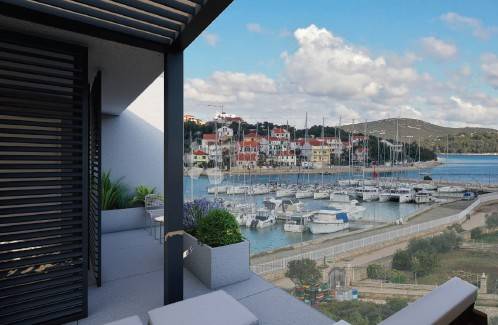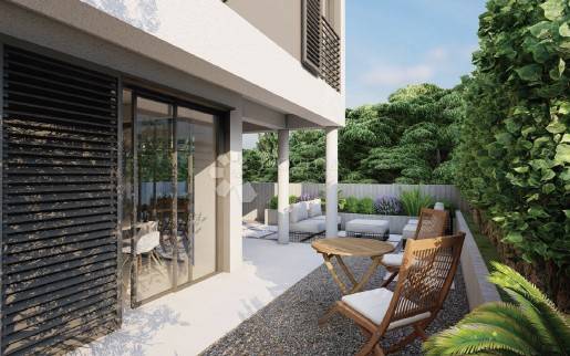 Near the marina and beach, new construction with three residential units is in pre-sale. Residential unit C has a real area of 282.27 m2, net with coefficients of 153.11 m2, and consists of a ground floor dominated by a common area of an open-plan living room, kitchen, and dining room with access to a covered terrace and courtyard. The ground floor also includes a hallway, bathroom, and storage room. On the first floor, there are three bedrooms, one with a private wardrobe and en suite bathroom, while there is another bathroom and hallway on the floor. The central gathering place offers a roof terrace divided into a planned indoor winter garden, covered and uncovered terrace with a pergola.
