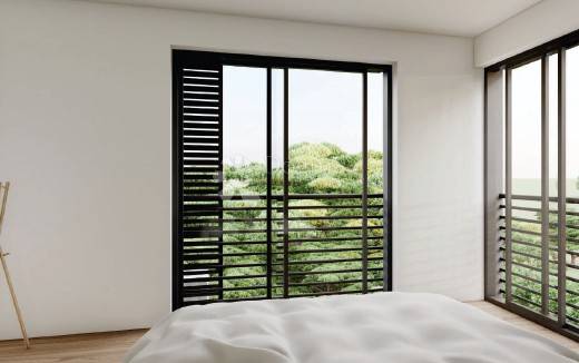The exterior joinery of the residential building consists of anthracite-colored aluminum glazed wings (sliding glass doors/windows), with sun protection provided by anthracite-colored aluminum sliding blinds. The entrance doors are also aluminum. All windows and balcony doors are glazed with insulating glass consisting of two glass panes separated by an interpane space filled with argon, type IZO 4+16+4. The interior joinery is wooden.