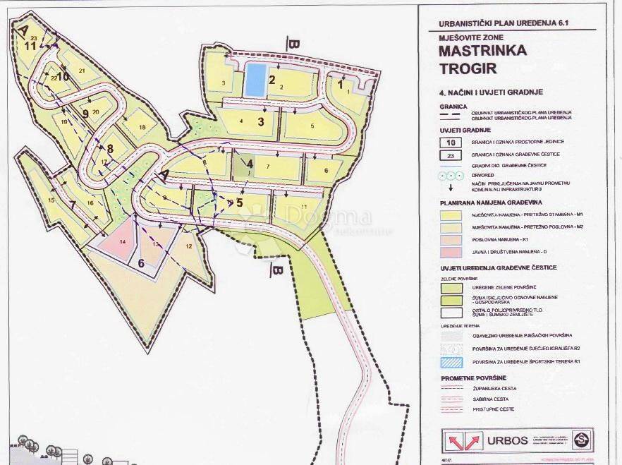 Agencija Dogma nekretnine predstavlja: Zemljište na Čiovu (Trogir), Mastrinka, 25545m2, 150m od mora s otvorenim pogledom na more. Pristupi lako dostupni. Zona izgradnje: stambeno-poslovna (M1, M2, K1). Predviđena izgradnja trgovačkog centra u zoni K1. Sva potrebna infrastruktura (struja, voda, kanalizacija) uz teren. Odličan prilaz. Vlasništvo uredno, izmjera obavljena. Pravomoćan urbanistički plan uređenja.