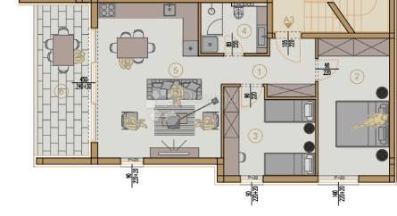 The apartment consists of 2 bedrooms, hallway with wardrobe, modern bathroom, open space living room, kitchen and dining room and a beautiful covered terrace.