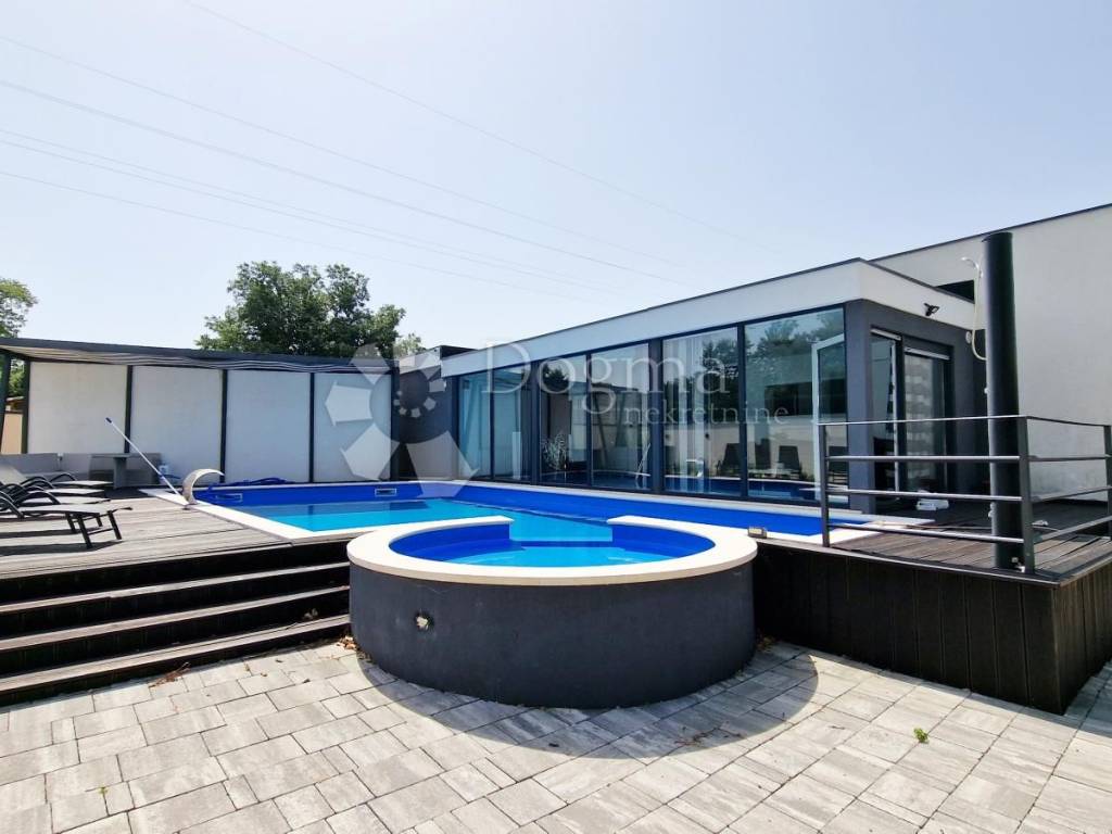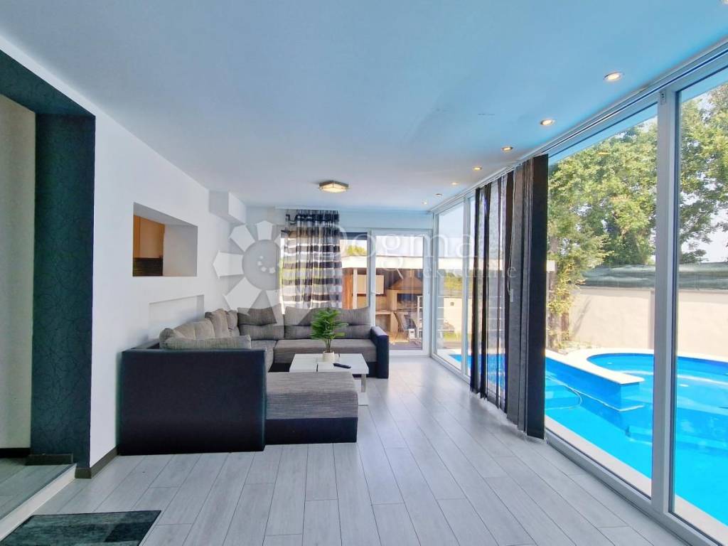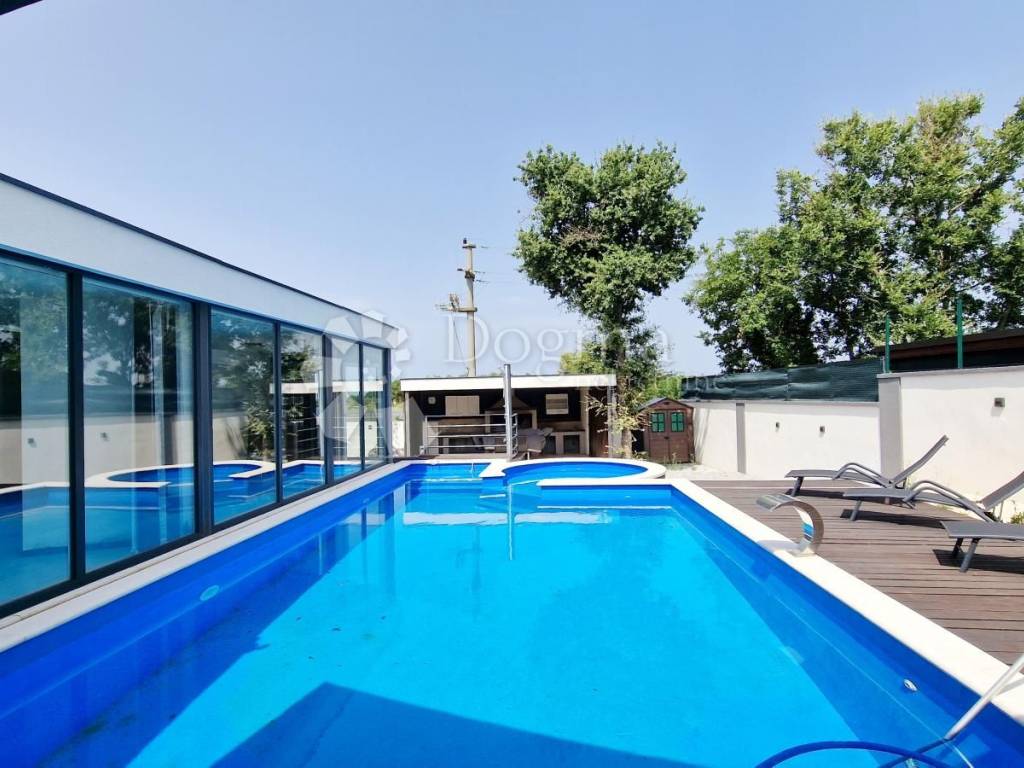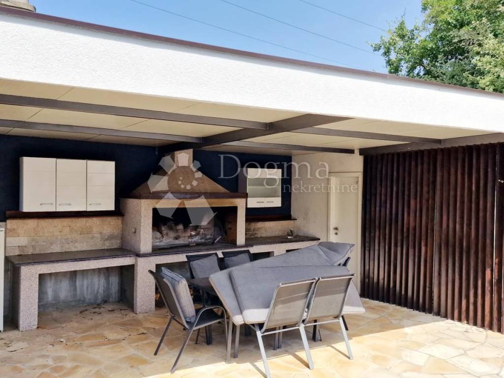 At the back of the house, there is another part of the garden, which guarantees complete privacy precisely because of this layout, and contains a swimming pool with an area of 49 m2, one part of which has a whirlpool system, then a sunbathing area, an outdoor shower, a covered summer kitchen with a large fireplace, where the grill master and everyone around him have a pleasant shade. Next to the summer kitchen there is a room where you can make a toilet.