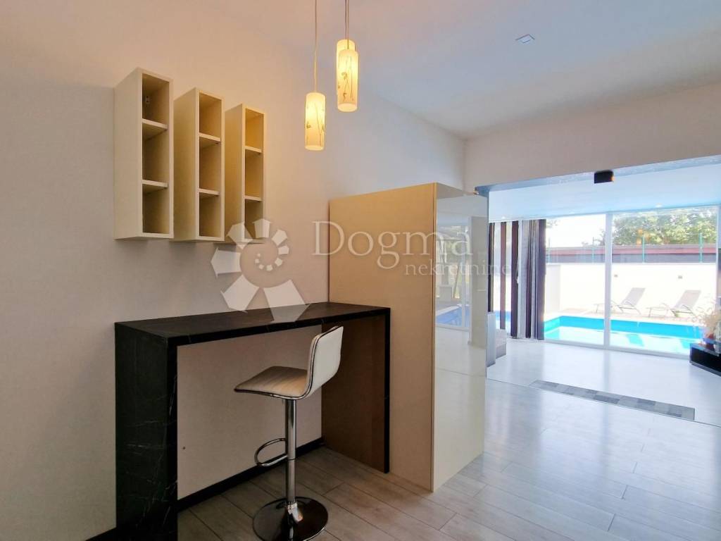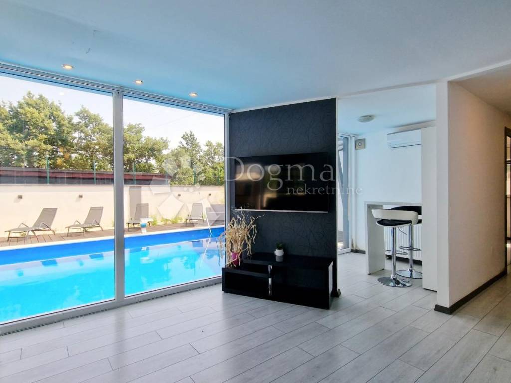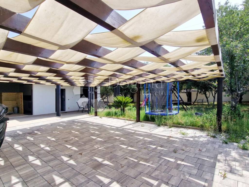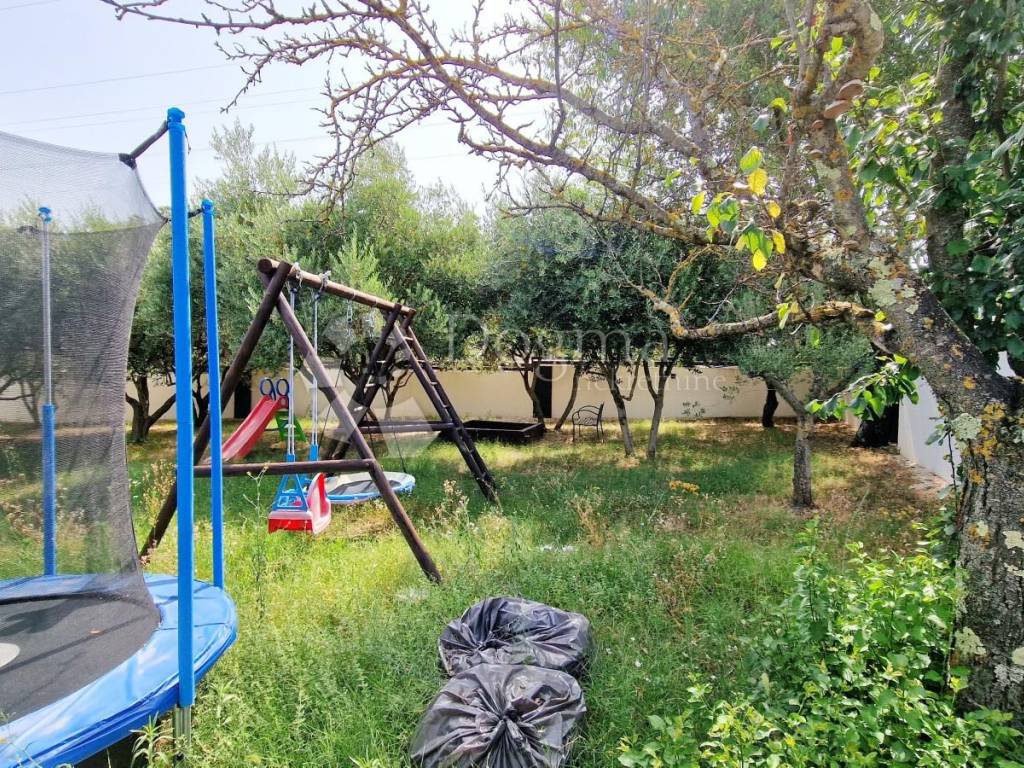 At the back of the house, there is another part of the garden, which guarantees complete privacy precisely because of this layout, and contains a swimming pool with an area of 49 m2, one part of which has a whirlpool system, then a sunbathing area, an outdoor shower, a covered summer kitchen with a large fireplace, where the grill master and everyone around him have a pleasant shade. Next to the summer kitchen there is a room where you can make a toilet.