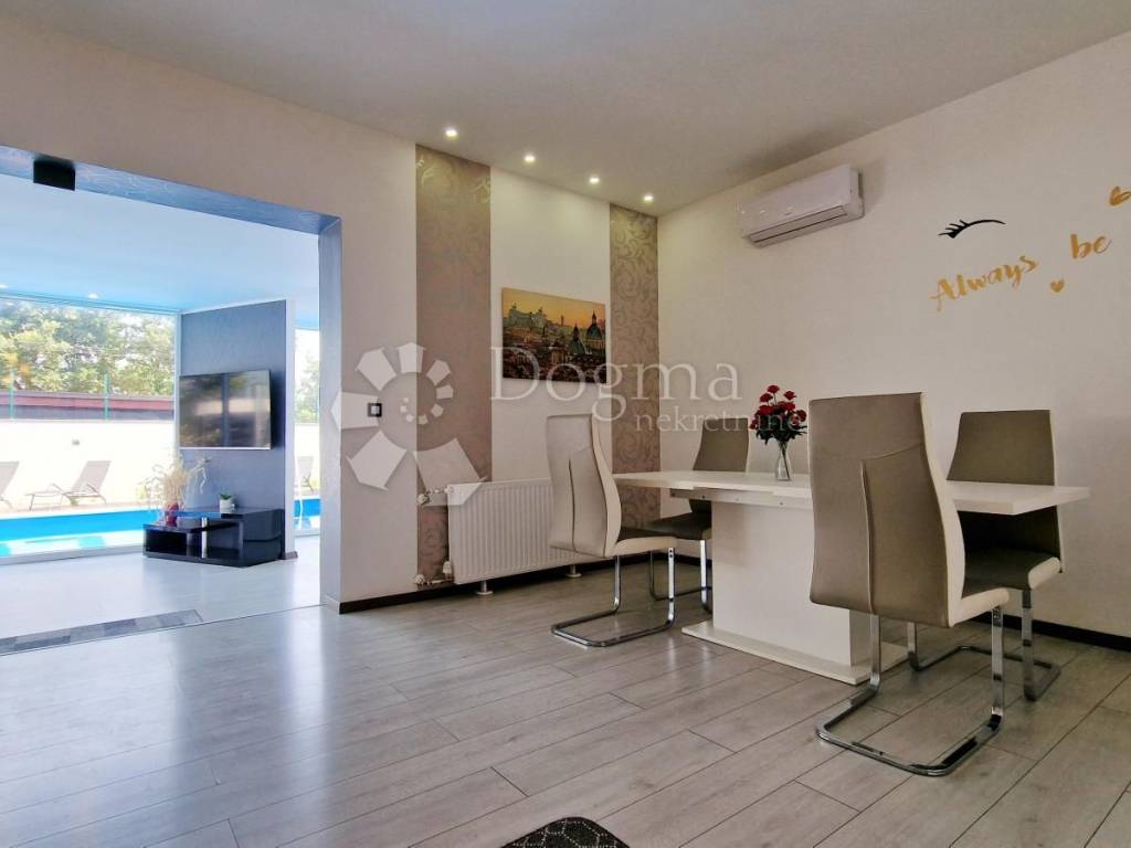 With a 10 cm demit facade and quality joinery, a pleasant temperature in the house throughout the year is maintained by oil central heating and air conditioners.