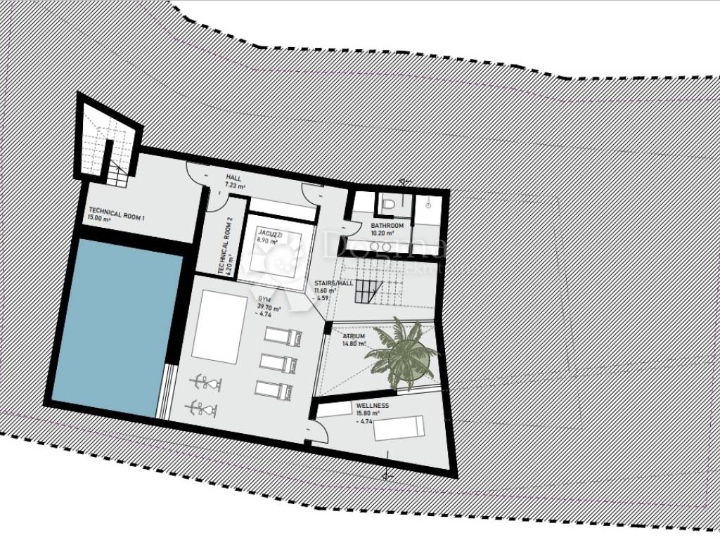In the basement (104.12m2) there will be a space for wellness, a jacuzzi, a gym, 2 technical rooms and a spacious bathroom.