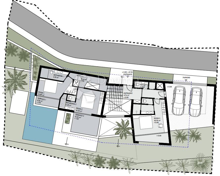On the first floor (124.56 m2) there will be 3 spacious bedrooms with en suite bathrooms, a separate toilet, a loggia, and an outdoor covered parking space.