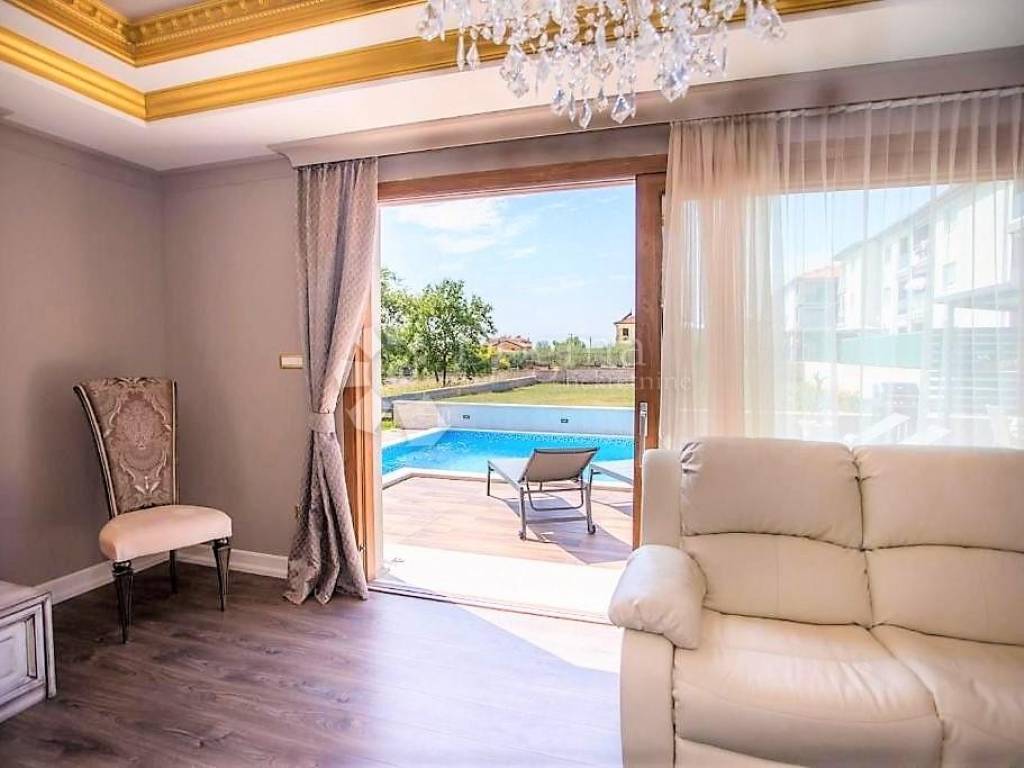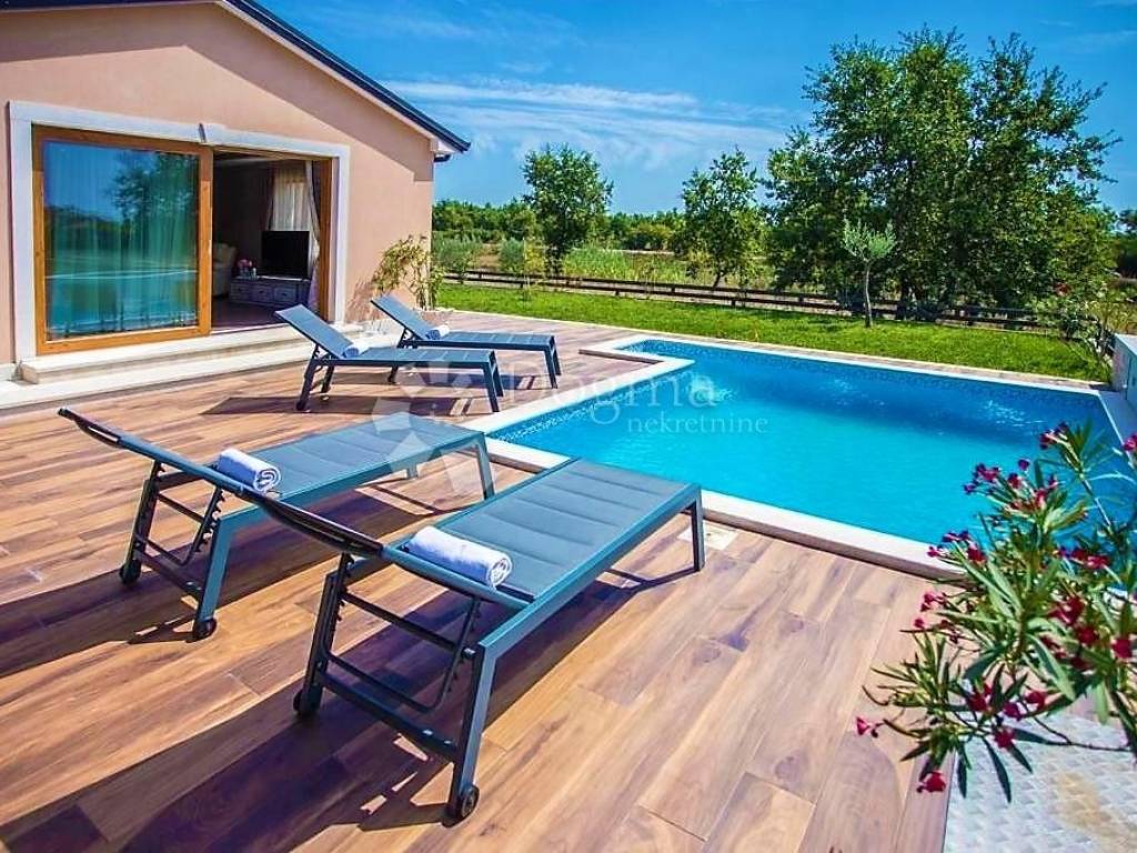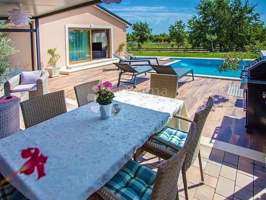 Near the city, in a small town, this beautiful one-story house is located on a fenced-in plot of 1063m2. The living area of 85 m2 is divided into an entrance hall, two bedrooms, one of which has its own bathroom, a bathroom, a kitchen with a dining area and a spacious living room with plenty of sunlight provided by the glass walls that separate you from the beach, the swimming pool with the sun deck.